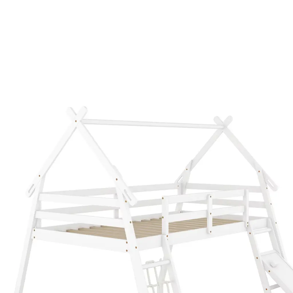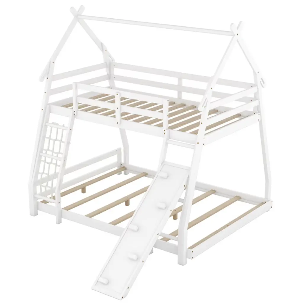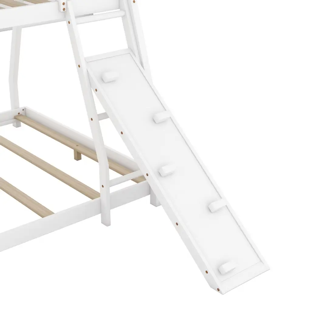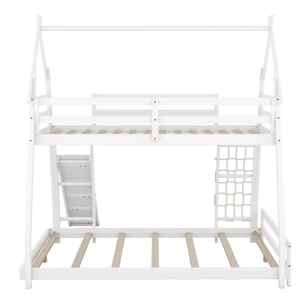 Product Features Sturdy Construction – Made of high-quality solid pine wood and MDF with reliable construction, this bunk bed frame can last for long time use and ensure strong stability and durability.Playful Design – Equipped with the climbing nets and climbing ramp, this house bed creates a fun and adorable space that not only serves as a comfortable sleeping area but also doubles as a space for you to play and have fun.Safety Guaranteed – With guardrails, a climbing ramp, and a sturdy pine frame, this bunk bed offers a safe space for you to get a good night's sleep.Maximized Space – This bunk bed takes advantage of vertical space to save plenty of room for you. Combined with a twin bed and a queen bed, it is perfect for multi-member families or spontaneous sleepover guests.Easy Assembly – All parts, tools, and instructions are shipped straight to your door in one efficiently packed box for simple set-up. DescriptionFeaturing climbing nets and climbing ramp, this house bed adds childlike interest to your room. Simple and interesting appearance gives your creativity free rein and you can decorate this bed with your kids, giving full play to kids' imagination. This bed contains two beds, which is the best choice for space storage lovers or families with limited room space. The queen size down bed gives you plenty of room to move around in bed. Specifications Material: Pine Wood + MDFSize: Twin over QueenNumbers of Package: 2Spring Box: No needAssembly Required: Yes Dimensions Overall Product Dimension: 82.2''L x 67.2''W x 82.6''HTwin Bed: 75.2'' x 39.4''Queen Bed: 80.7'' x 61''Total Height: 82.6''Recommend Mattress Thickness of Bed (Upper/Down): 6'' / 6–8''Overall Product Weight: 146lbsBed Weight Capacity (Upper/Down): 350lbs / 650lbs