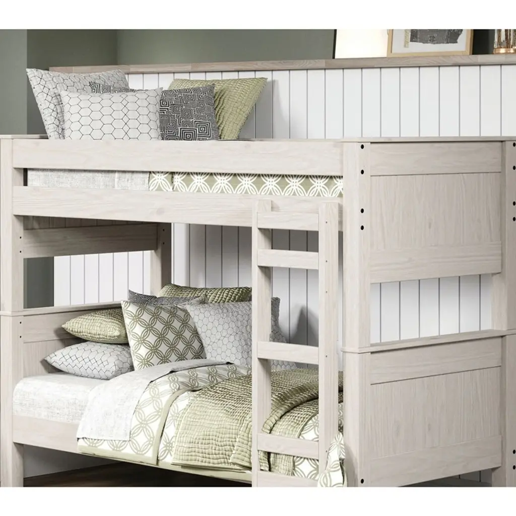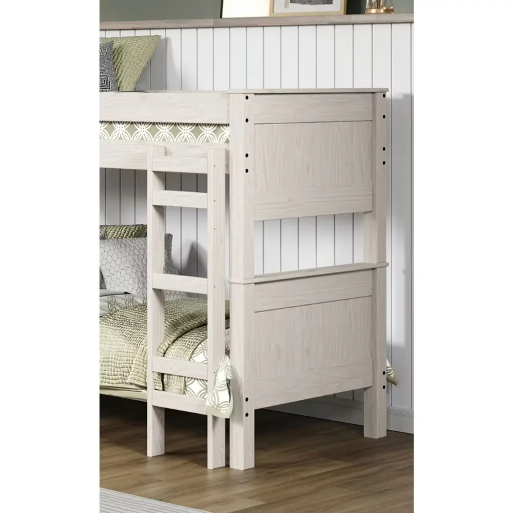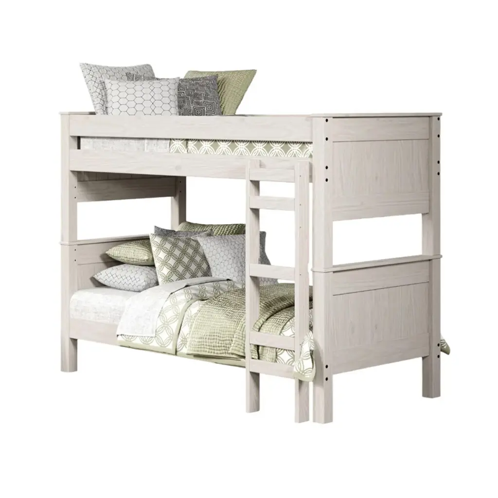 Product Features Rustic StyleSolid Wood, OthersSplits into 2 Twin BedsBrazilian Pine ConstructionWhiteHeadboard/Footboard Ladder1pc Bunk Bed Only Product Dimension Bunk Bed: 82"W X 45"D X 63"H Product Description A white, twin-over-twin bunk bed. It is made of solid wood (Brazilian pine) and can be split into two separate twin beds. The design features a headboard/footboard ladder and a rustic style. Listing Include: 1pc Bunk Bed Only. MATTRESS: NOT INCLUDED. Simple Assembly Required.
