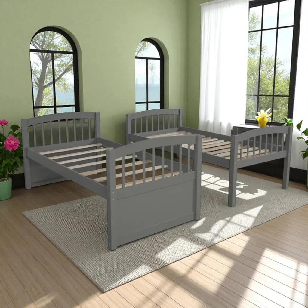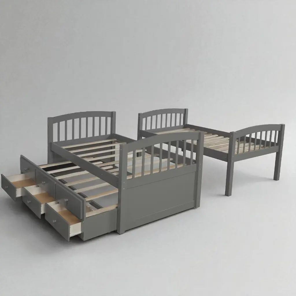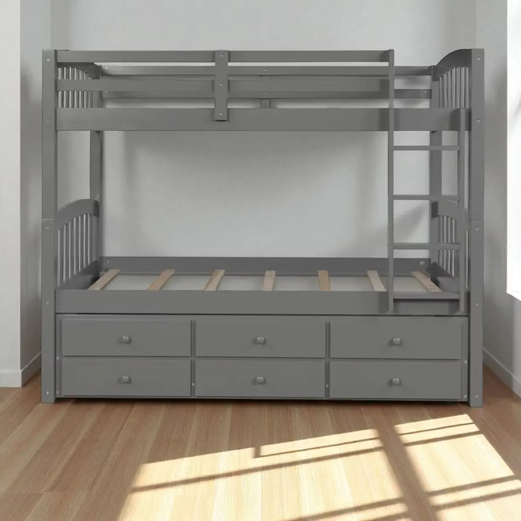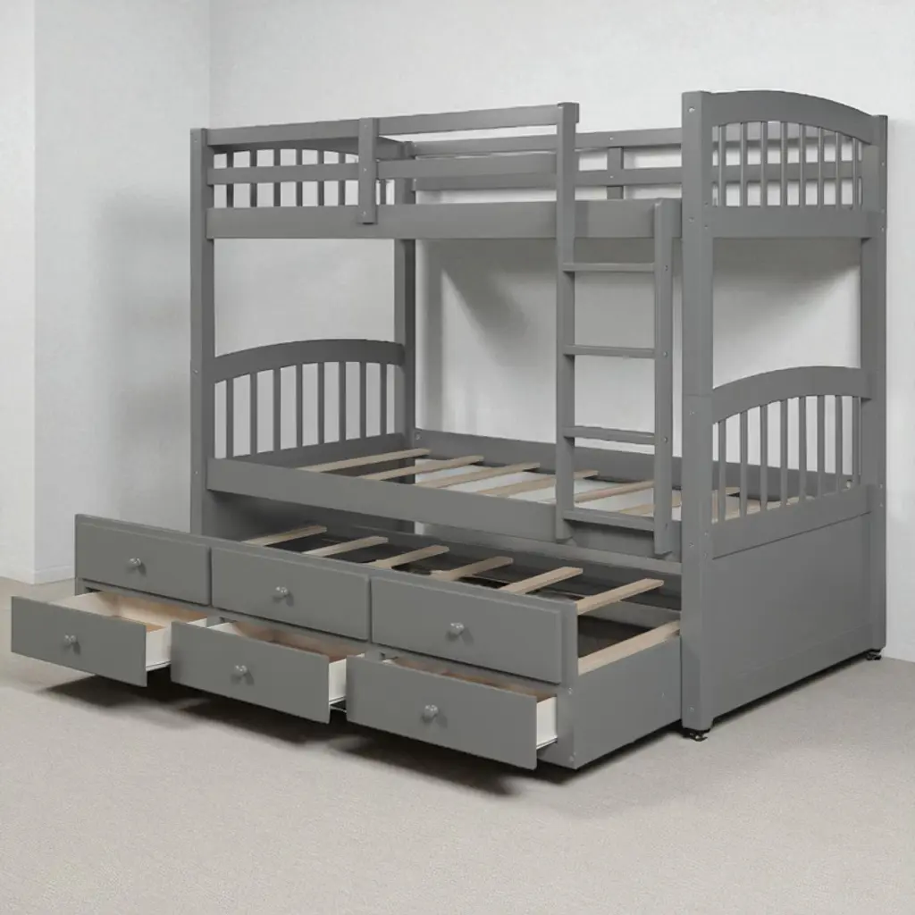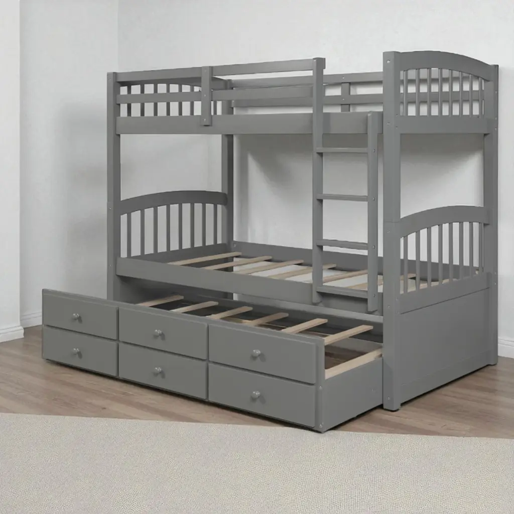 Product Overview Add style, function, and sleeping capacity to any bedroom with this twin-over-twin bunk bed featuring a pull-out trundle and three under-bed storage drawers. Designed for families who need to maximize limited space, this elegant bunk bed includes a strong wood frame and versatile layout that allows you to separate the beds when needed. With built-in storage and an extra bed for guests, this bunk bed is the ideal solution for modern, space-saving comfort. Product Features Space-Saving Trundle Design: This bunk bed includes a pull-out twin trundle bed—perfect for hosting sleepovers or providing a spare sleeping space for guests.Ample Storage Drawers: Three same-sized drawers underneath the trundle offer convenient storage for toys, clothes, or bedding, keeping the room organized and clutter-free.Convertible and Flexible: Easily separate the top and bottom bunks into two individual twin beds, with the trundle available as a standalone option—ideal for changing family needs or room layouts.Durable & Safe Construction: Built from solid pinewood and reinforced with MDF and plywood, this frame includes secure guardrails, wide-tread ladder steps, and tightly fastened joints for enhanced safety and stability.Elegant Style for Any Décor: Available in White, Gray, or Espresso finishes, this bunk bed suits a variety of interior styles, making it a timeless choice for both boys' and girls' rooms. Specifications Product Type: Bunk BedSize: Twin-Over-Twin with TrundleColor Options: White, Gray, EspressoMaterial: Plywood + MDF + PinewoodOverall Dimensions: 79.5""L x 42.4""W x 68""HWeight: 212 lbsSlats: Upper – 14, Bottom – 14, Trundle – 7Recommended Mattress Thickness: Upper – 6"", Bottom – 8"", Trundle – 6""Assembly Required: Yes (tools and instructions included)Box Spring Required: NoCountry of Origin: Vietnam Suitable Scenarios Perfect for shared bedrooms, sleepover-ready guest spaces, kids’ rooms, and homes with limited space. This multifunctional bunk bed is ideal for growing families, hosting guests, or creating a practical and stylish sleep-and-storage solution in a compact footprint. Notes - Mattress not included - This product ships in three boxes and may arrive on different days - Manual measurements used; slight variations may occur - Lighting and screen differences may cause slight color variation