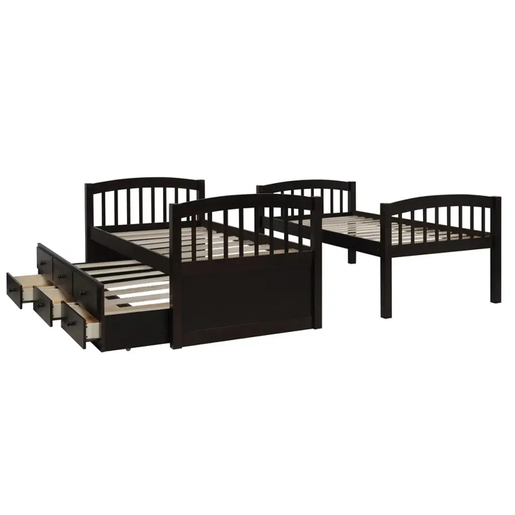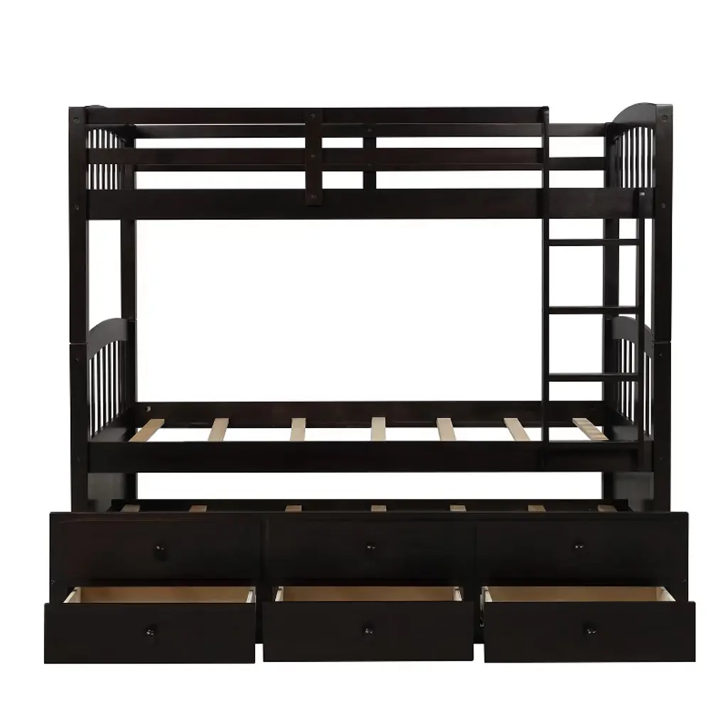 Twin Over Twin Bunk Bed With Trundle, Wooden Bunk Bed With 3 Storage Drawers And Safety Rail, Can Be Convertible To 2 Beds, Espresso