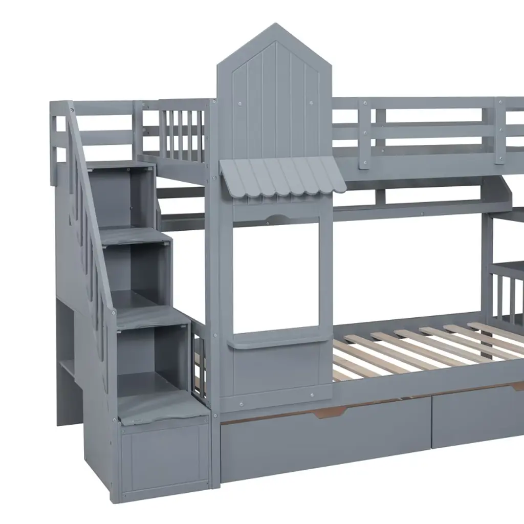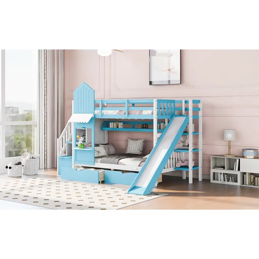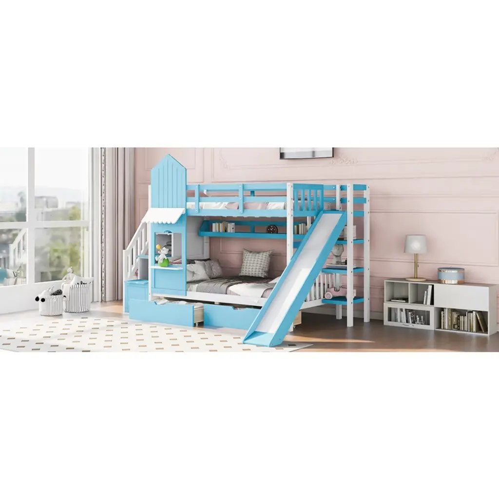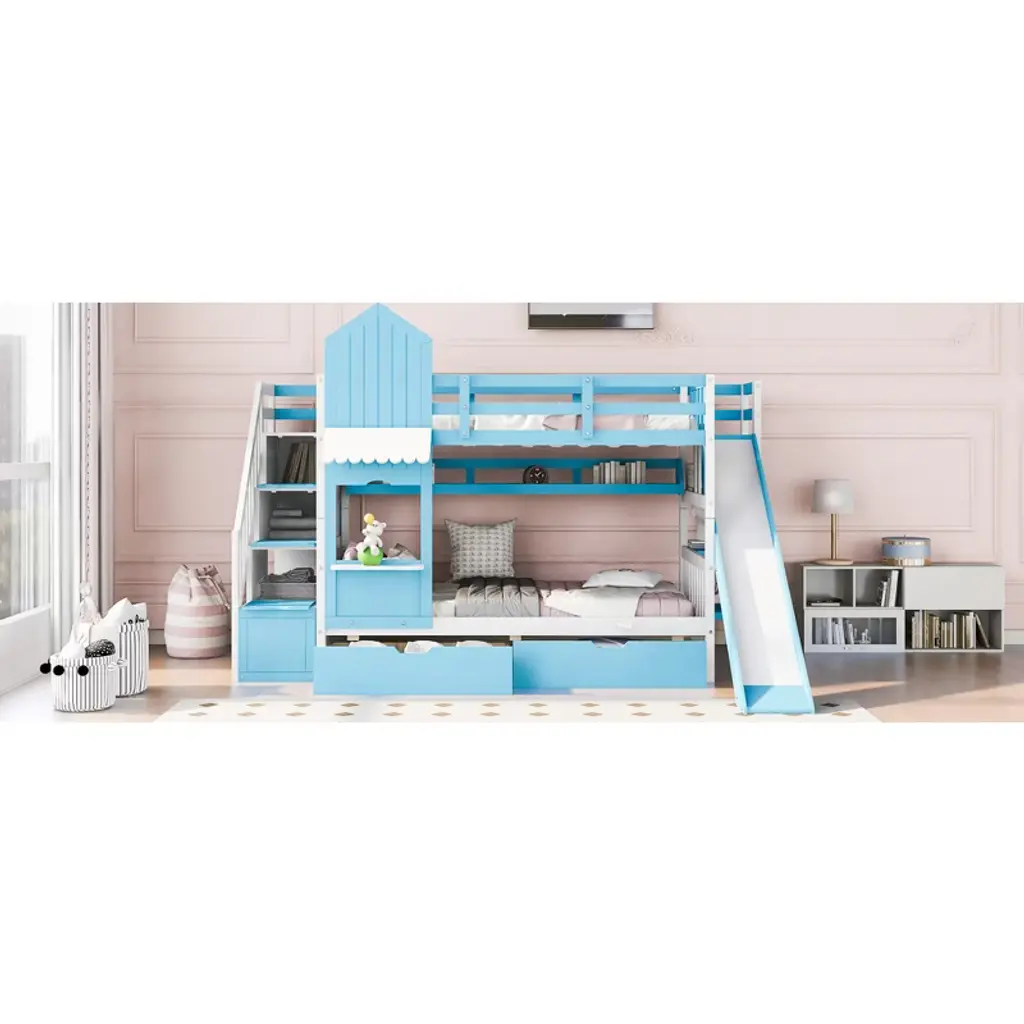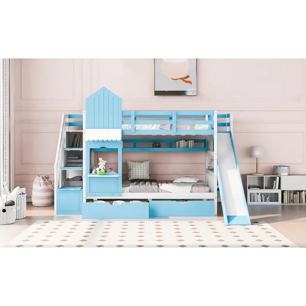 Twin Over Twin Castle Style Bunk Bed With 2 Drawers, 3 Shelves And Slide