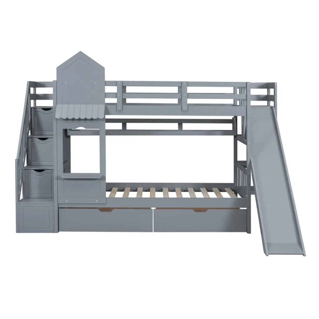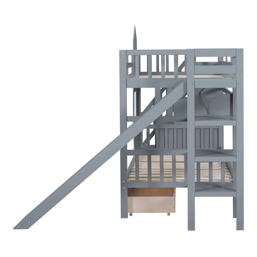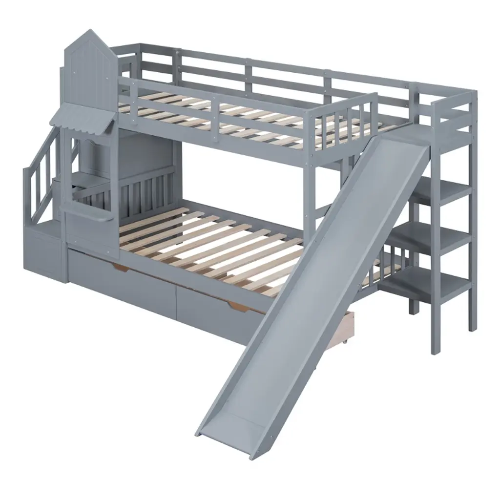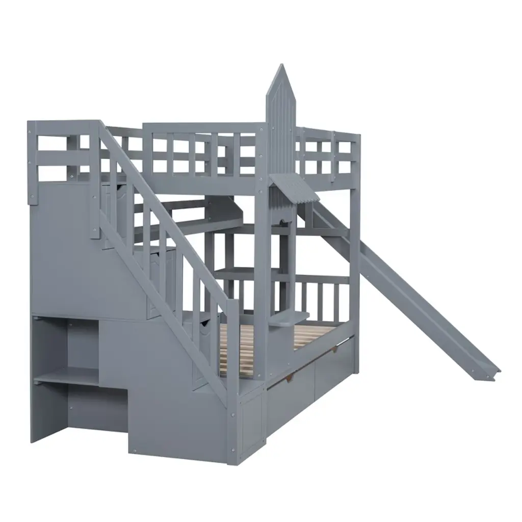 Twin Over Twin Castle Style Bunk Bed With 2 Drawers, 3 Shelves And Slide