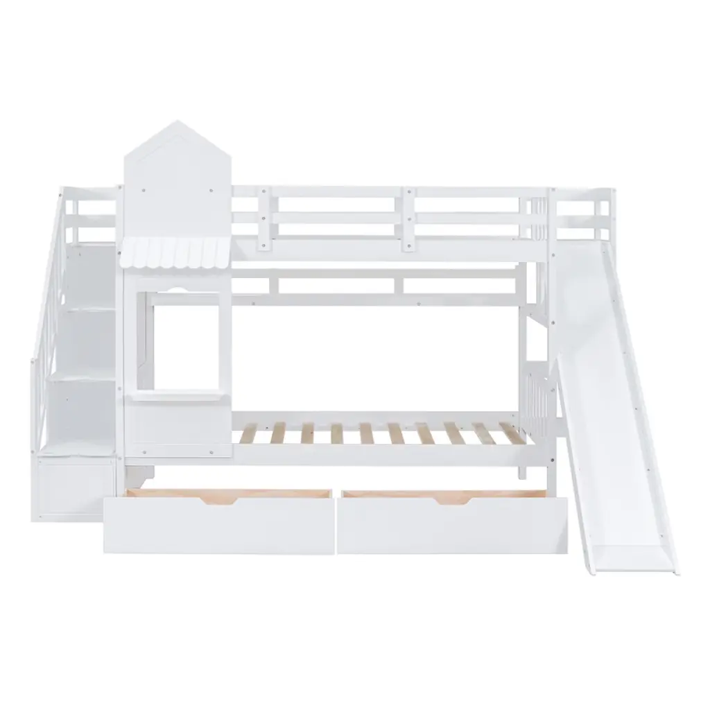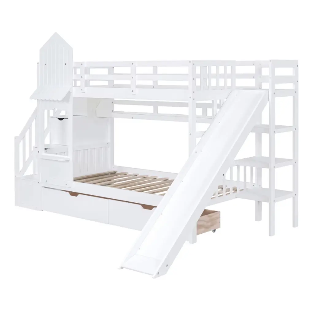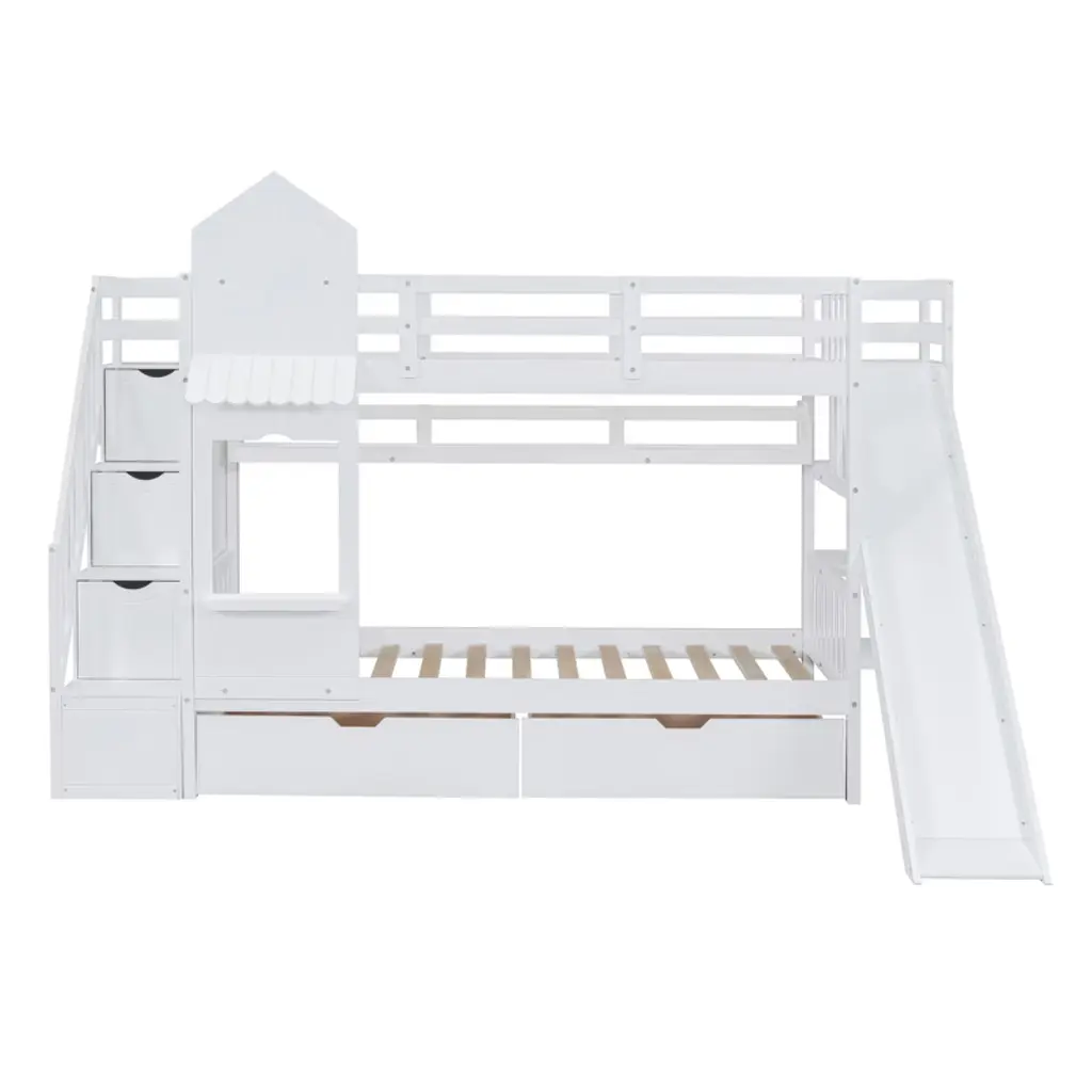 Twin Over Twin Castle Style Bunk Bed With 2 Drawers, 3 Shelves And Slide
