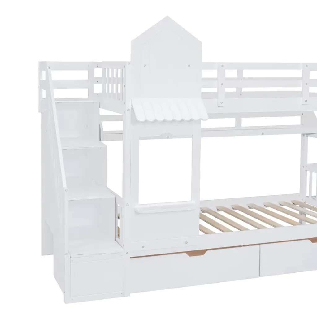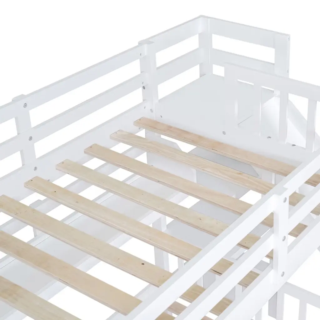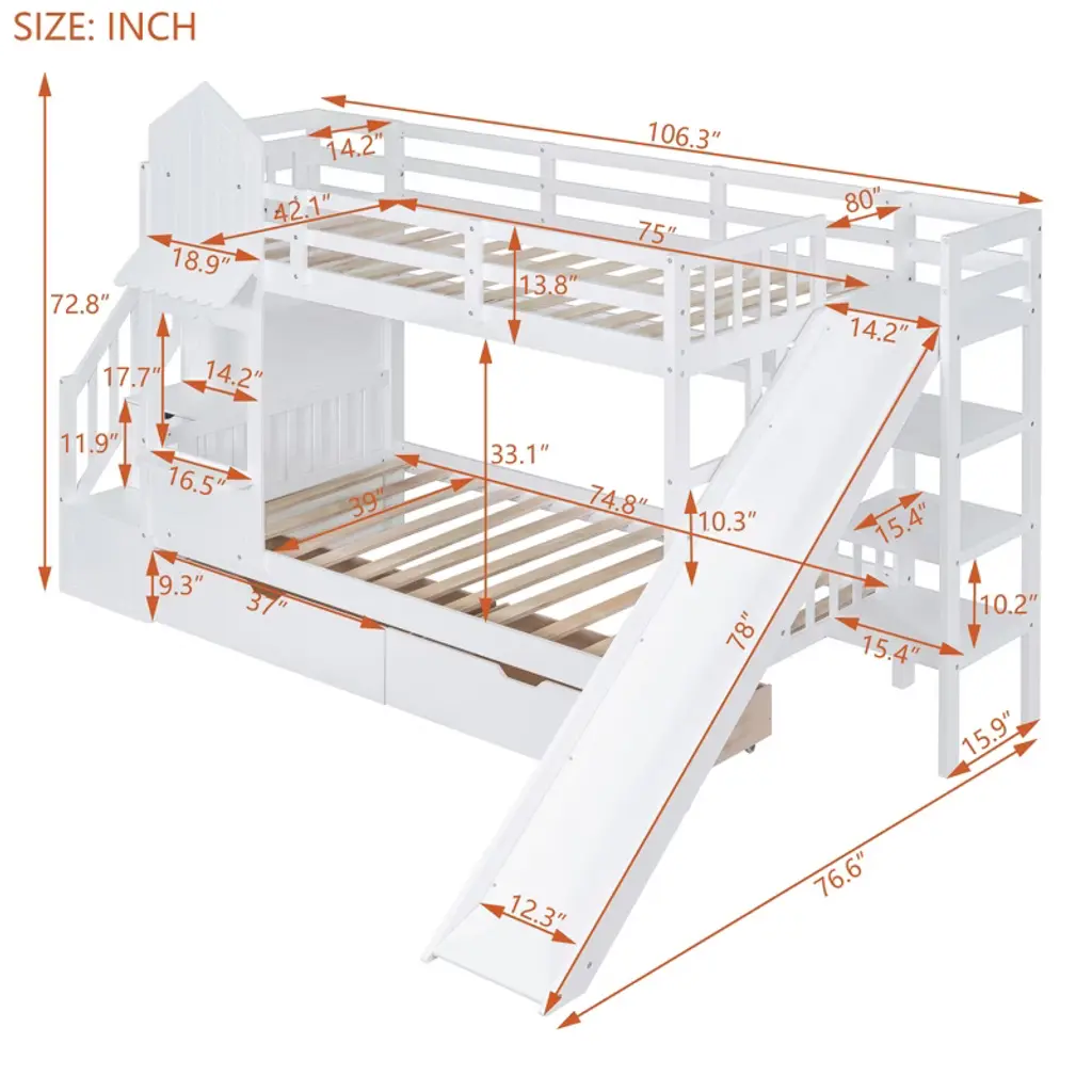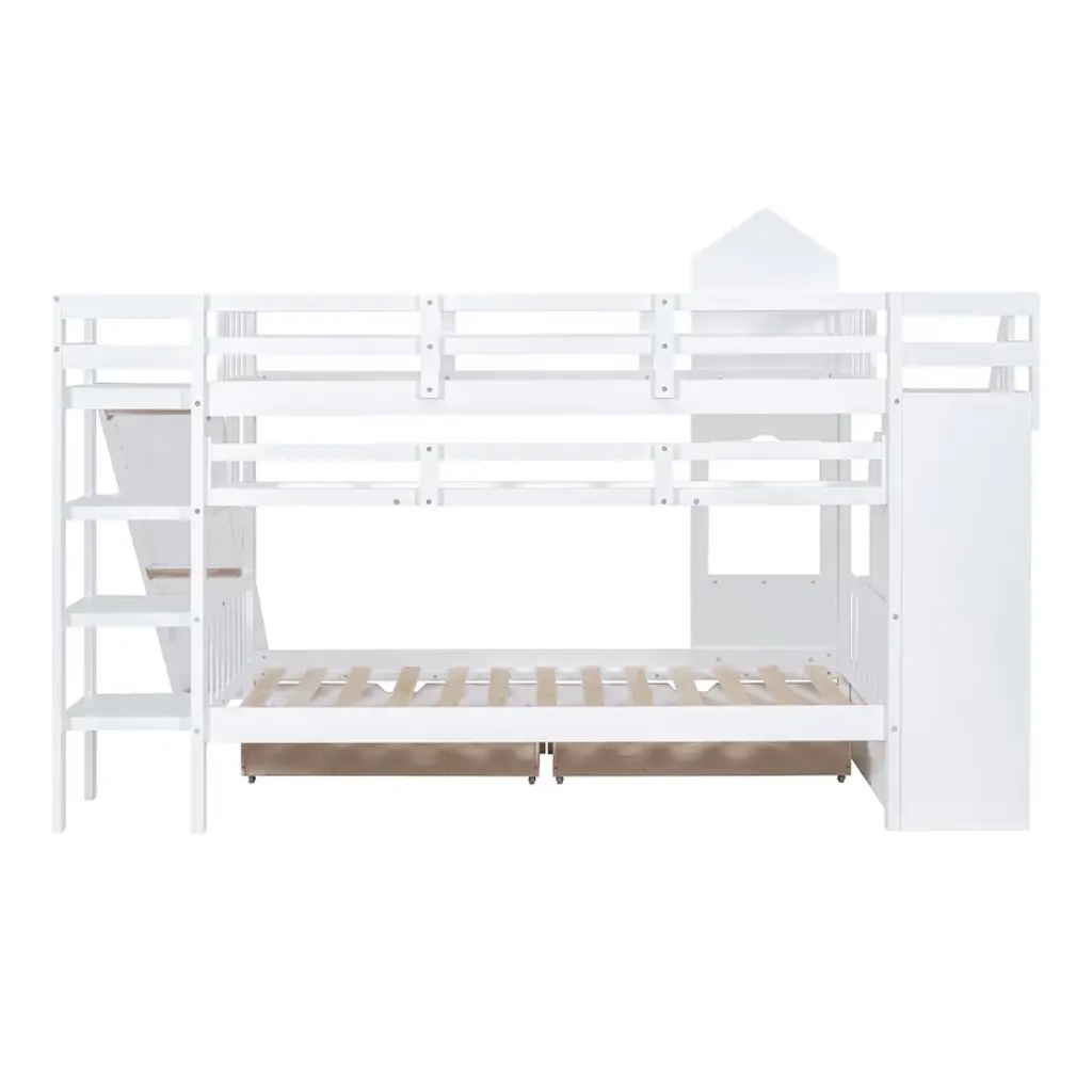 Twin Over Twin Castle Style Bunk Bed With 2 Drawers, 3 Shelves And Slide