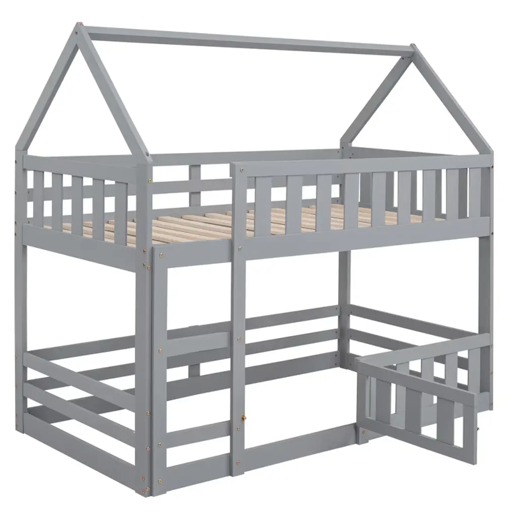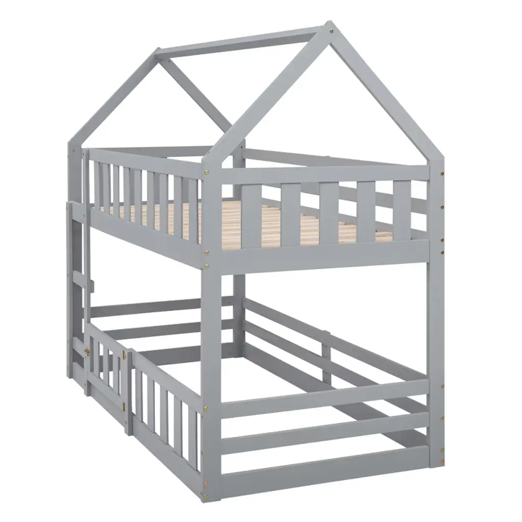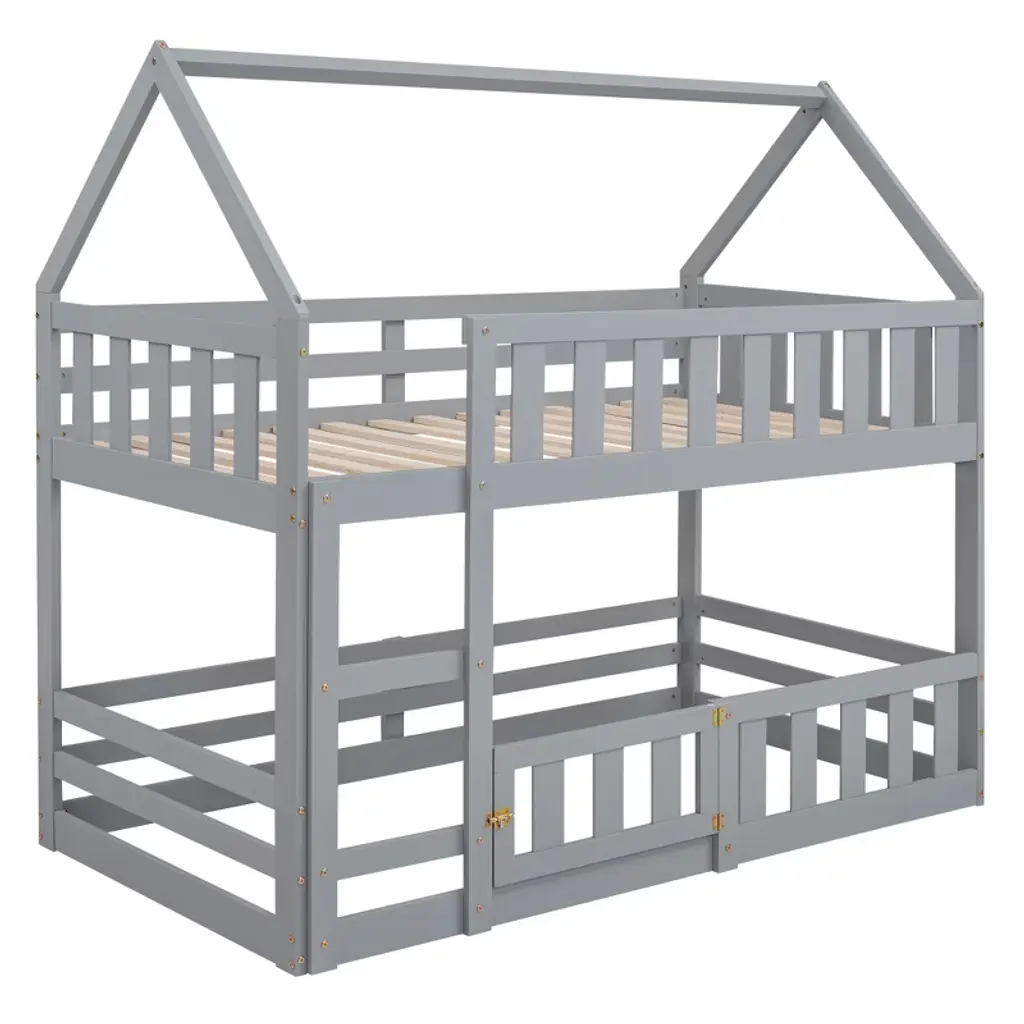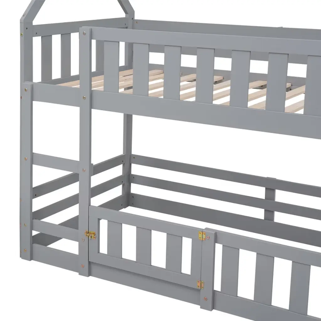 Twin Over Twin House Bunk Bed For Kids, Floor Low Bunk Bed With Fence And Door, Wood Twin Size House Shaped Bunk Bed, Gray