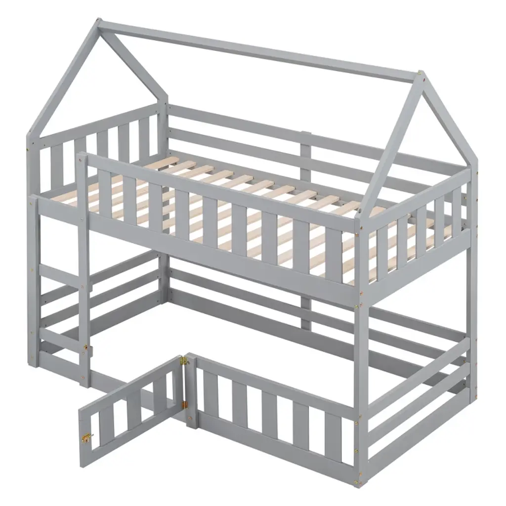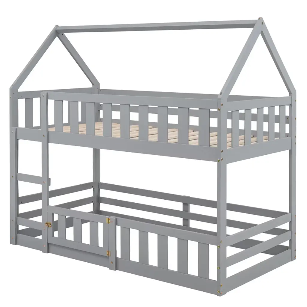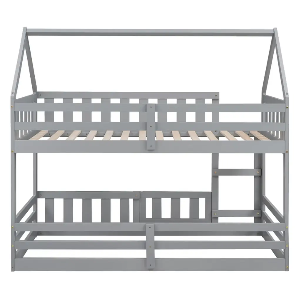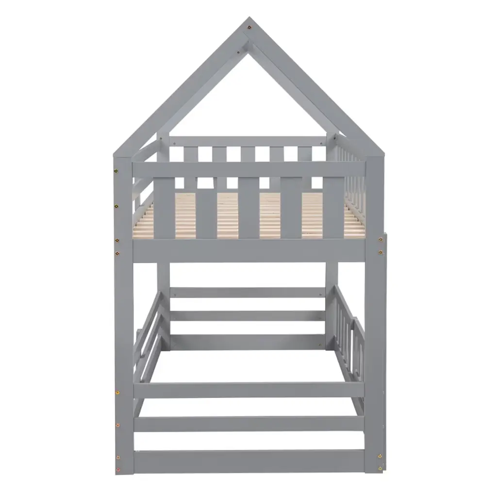 Twin Over Twin House Bunk Bed For Kids, Floor Low Bunk Bed With Fence And Door, Wood Twin Size House Shaped Bunk Bed, Gray