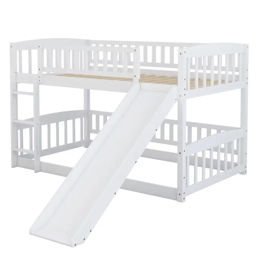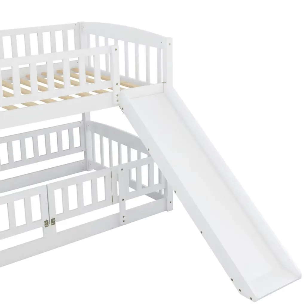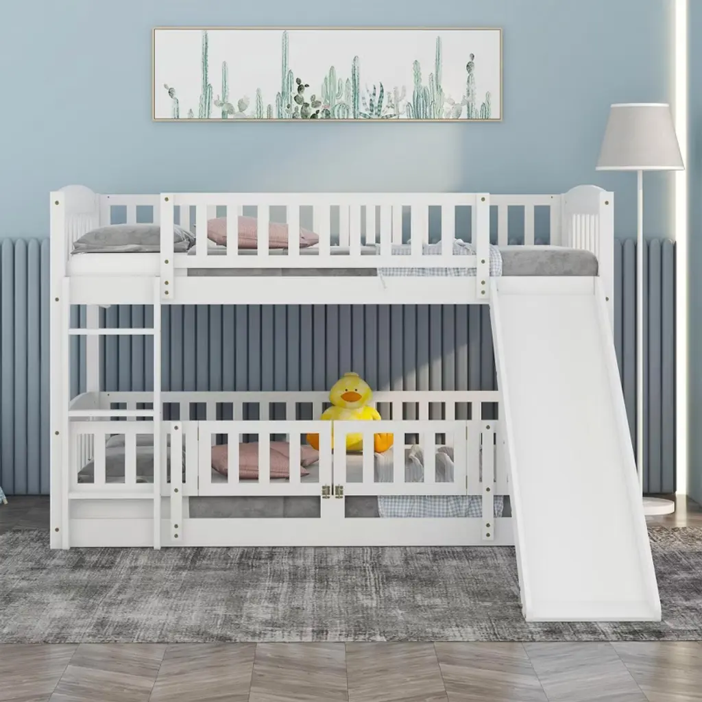 Product Features Twin Bunk Bed with Slide: This kids bunk bed has built-in ladders and slides. It is not only a bunk bed, but also a kids play place. In addition, the slides and ladders are convertible, they can be placed on the left or right.Versatile Bunk Bed: There is no bed slats in the lower bed, it is an open-row design. You can use it as a bed, or a child's play space, reading place, and so on. Use your imagination to create your own fun space.Sturdy and Durable Bed Frame: Crafted with superior quality solid pine wood bed frame, this slide bunk bed frame is sturdy and solid. Sturdy wood construction, no squeaks or wobbles when you are going up or down. 14 plywood slats for upper bunk, no box spring is needed.Fun and Variable: This wooden bunk bed under the bed has a circle of fences. There is a small door that can be opened and closed, which increases the interest of the bed. The fence is detachable, which is convenient for your various needs.Easy to Assemble Bunk Bed Frame: Bunk beds with slides do not require spring box or bases. The assembly instructions and required tools are delivered together with the bed frame. It is easy to assemble. Description If you need extra sleeping space or your kids love sleepovers, this Twin Over Twin Bunk Bed is perfect for your home. High-quality, solid pine legs and a strong, durable frame ensures stability and durability for long-term use. Slat kit included so box springs are not required. This low bunk bed with slide is designed with a clean silhouette and a hue of elegance. It suits all styles of home decoration, and completes the look of any kids' bedroom. Weight & Dimensions Overall Product Dimension: 79.5"L x 41.7"W x 50.6"HDetail Product Dimension: Please refer to the Size imageNumber of Package: 2Package Dimension: Please refer to the SpecificationOverall Product Weight: 108 LBSPackage Weight: Please refer to the SpecificationWeight Capacity: Upper bed: 300 LBS, Bottom bed: No limitRecommended Mattress Thickness: Upper bed: 6", Bottom bed: 8"Recommended Age: > 6 years old Specifications Product Type: Bunk BedSize: TWIN-Over-TWINMaterial: Plywood + MDF + PinewoodBox Spring Required: NoNumber of Slats: Upper bed: 14, Bottom bed: No SlatAssembly Required: YesNotes: Manual measurement has been used, there may be some reasonable error. All the pictures are taken by actual samples, slight chromatic aberration may occur due to lighting or display.