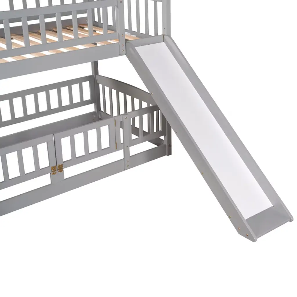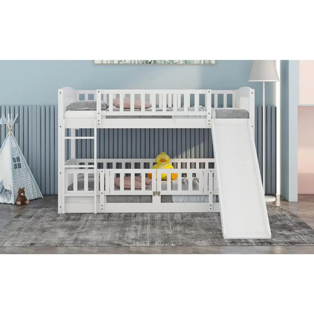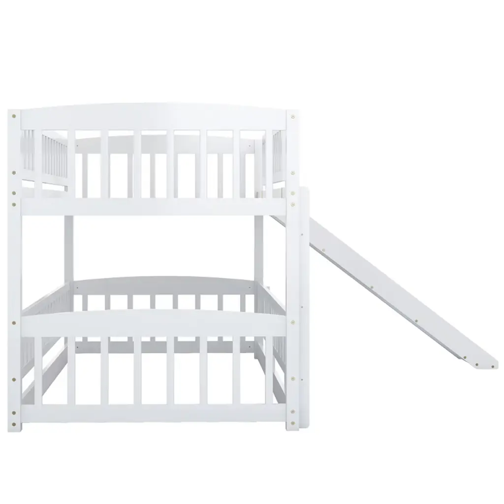 Product Features Twin Bunk Bed with Slide: This kids bunk bed has built-in ladders and slides. It is not only a bunk bed, but also a kids play place. In addition, the slides and ladders are convertible, they can be placed on the left or right.Versatile Bunk Bed: There is no bed slats in the lower bed, it is an open-row design. You can use it as a bed, or a child's play space, reading place, and so on. Use your imagination to create your own fun space.Sturdy and Durable Bed Frame: Crafted with superior quality solid pine wood bed frame, this slide bunk bed frame is sturdy and solid. Sturdy wood construction, no squeaks or wobbles when you are going up or down. 14 plywood slats for upper bunk, no box spring is needed.Fun and Variable: This wooden bunk bed under the bed has a circle of fences. There is a small door that can be opened and closed, which increases the interest of the bed. The fence is detachable, which is convenient for your various needs.Easy to Assemble Bunk Bed Frame: Bunk beds with slides do not require spring box or bases. The assembly instructions and required tools are delivered together with the bed frame. It is easy to assemble. Description If you need extra sleeping space or your kids love sleepovers, this Twin Over Twin Bunk Bed is perfect for your home. High-quality, solid pine legs and a strong, durable frame ensures stability and durability for long-term use. Slat kit included so box springs are not required. This low bunk bed with slide is designed with a clean silhouette and a hue of elegance. It suits all styles of home decoration, and completes the look of any kids' bedroom. Weight & Dimensions Overall Product Dimension: 79.5"L x 41.7"W x 50.6"HDetail Product Dimension: Please refer to the Size imageNumber of Package: 2Package Dimension: Please refer to the SpecificationOverall Product Weight: 108 LBSPackage Weight: Please refer to the SpecificationWeight Capacity: Upper bed: 300 LBS, Bottom bed: No limitRecommended Mattress Thickness: Upper bed: 6", Bottom bed: 8"Recommended Age: > 6 years old Specifications Product Type: Bunk BedSize: TWIN-Over-TWINMaterial: Plywood + MDF + PinewoodBox Spring Required: NoNumber of Slats: Upper bed: 14, Bottom bed: No SlatAssembly Required: YesNotes: Manual measurement has been used, there may be some reasonable error. All the pictures are taken by actual samples, slight chromatic aberration may occur due to lighting or display.