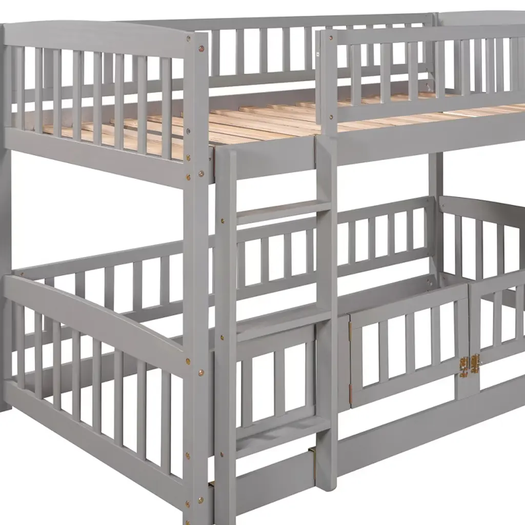 Twin Over Twin Low Bunk Bed With Fence And Ladder For Kids