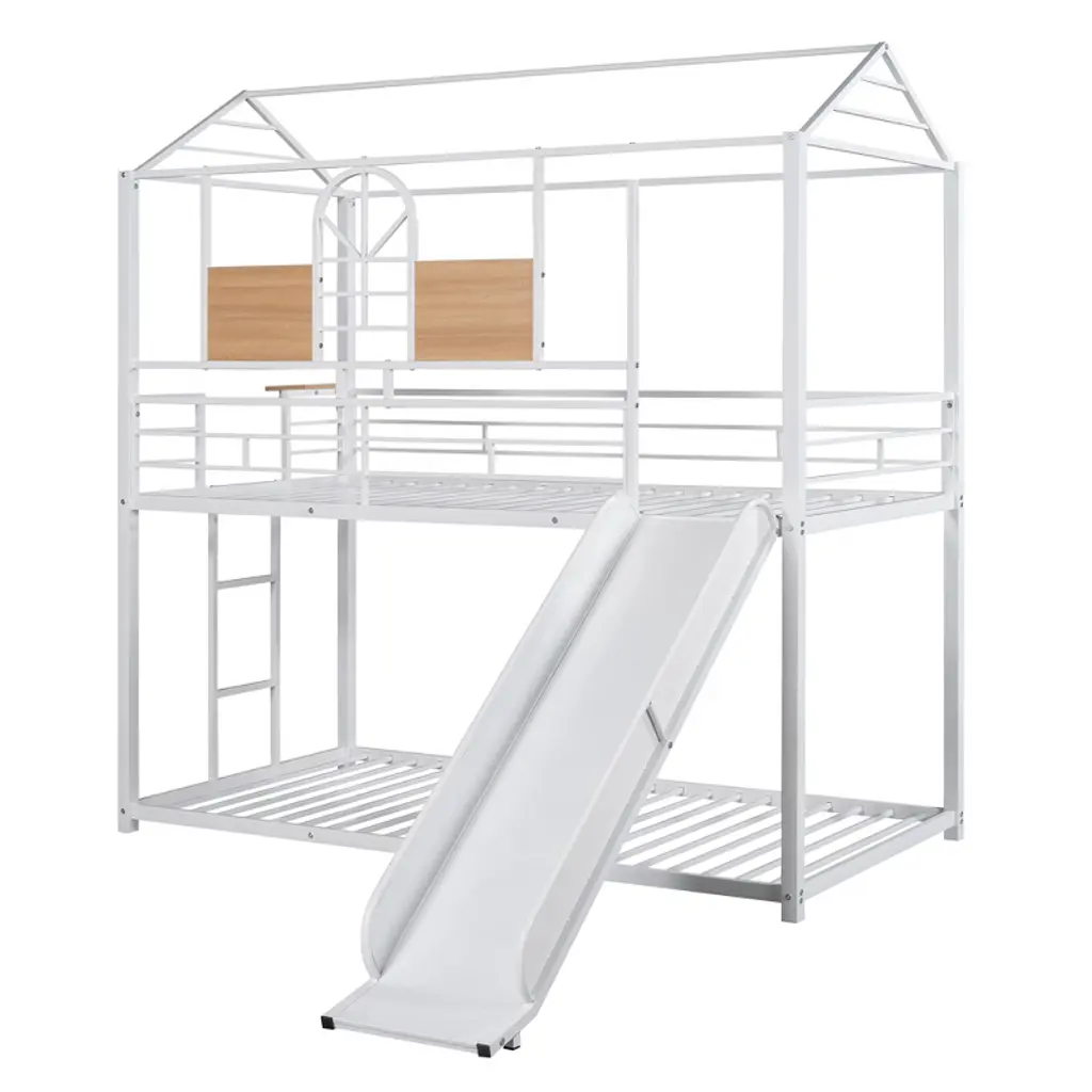 Product Features [Sturdy Frame]This bunk bed is made with sturdy metal that is stable and durable. Coming with built-in mattress support, the bunk features many slats to help increase the longevity of your mattresses.[Safety Ensured]Bed comes with full-length guardrails, built-in ladders and secured metal slats that do not require foundation.[Friendly Design]Crafted with a whimsical playhouse design, this bunk bed offers you a comfortable and exhilarating experience during both sleep and playtime that will let your imaginations run wild. Perfect for hours of entertainment and relaxation, the playhouse design makes this bunk the perfect centerpiece for any your bedroom.[Dimensions]Overall Product Dimension:77.9"L x 41.3"W x82.2"H. Some assembly is required, although we have provided clear instructions and tools. Description Full-over-full bunk bed modern style steel frame bunk bed with safety rail, built-in ladder. Compared with most classic look bunk beds, this bunk bed features an irresistible modern appearance that perfectly combines its clean silhouette and natural wood grain blocks. It suits the décor of many homes, and will be the envy of friends. Thanks to a high-quality steel frame and a number of exposed timber panels for increased stiffness, this bunk bed is firm and secure and won't wobble when assembled correctly. What's more, a rust-proof finish ensures this bed will last at least as long as your family are home, with maintenance a breeze. Featuring two generously-proportioned beds in one space-saving package, this bunk bed is perfect for any bedroom, dorm room, hostel, or even in the study for when you have visitors. As with any item around the home, the versatility is only limited by your imagination. Weight & Dimensions Overall Product Dimension: 77.9"L x 41.3"W x82.2"HDetail Product Dimension: Please refer to the Size imageNumber of Package: 1Package Dimension: Please refer to the SpecificationOverall Product Weight: 125LBSWeight Capacity: Upper bed: 250LBS, Bottom bed: 350LBSRecommended Mattress Thickness: Upper bed: 4-6", Bottom bed: 8"Recommended age: > 6 years old Specifications: Product Type: Bunk BedSize: Twin over TwinProduct material: Steel + MDFBed slat material: SteelLevel of Assembly: Full Assembly NeededNumber of drawers/shelfs/desks: 1Box Spring Required: NoMattress Included: NoEstimated Time to Assemble: 60 minutesNumber of Slats: Upper bed: 21, Bottom bed: 21Suggested Number of People: 2Additional Tools Required: All Tools IncludedAvoid power tools: YesNotes: Manual measurement has been used, there may be some reasonable error.