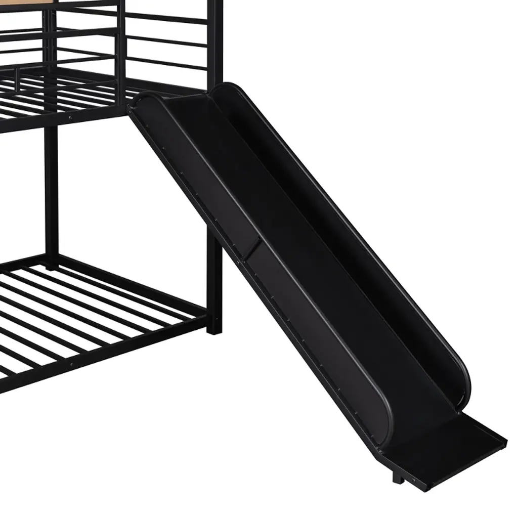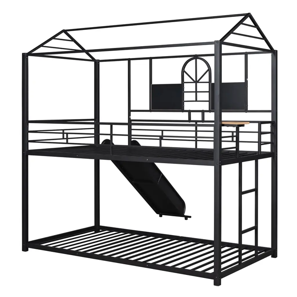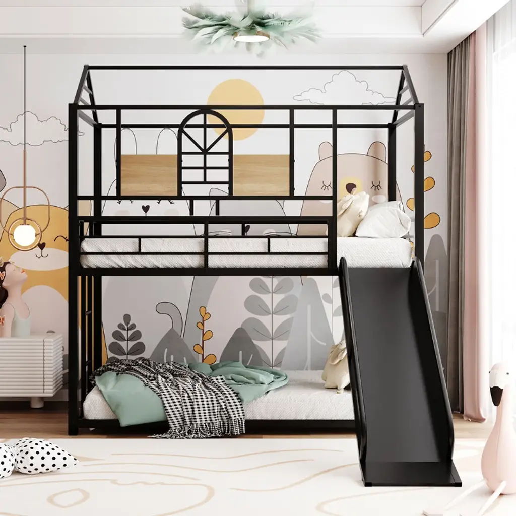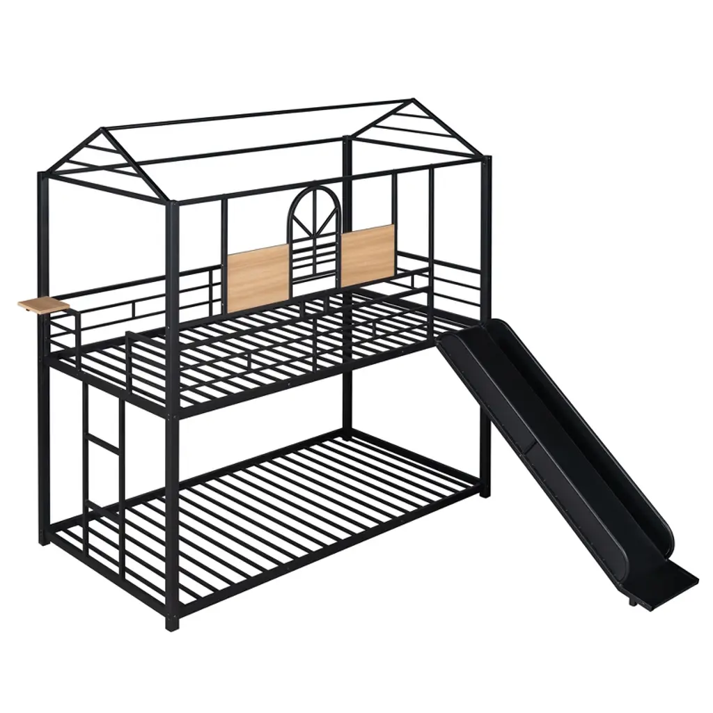 Product Features [Sturdy Frame]This bunk bed is made with sturdy metal that is stable and durable. Coming with built-in mattress support, the bunk features many slats to help increase the longevity of your mattresses.[Safety Ensured]Bed comes with full-length guardrails, built-in ladders and secured metal slats that do not require foundation.[Friendly Design]Crafted with a whimsical playhouse design, this bunk bed offers you a comfortable and exhilarating experience during both sleep and playtime that will let your imaginations run wild. Perfect for hours of entertainment and relaxation, the playhouse design makes this bunk the perfect centerpiece for any your bedroom.[Dimensions]Overall Product Dimension:77.9"L x 41.3"W x82.2"H. Some assembly is required, although we have provided clear instructions and tools. Description Full-over-full bunk bed modern style steel frame bunk bed with safety rail, built-in ladder. Compared with most classic look bunk beds, this bunk bed features an irresistible modern appearance that perfectly combines its clean silhouette and natural wood grain blocks. It suits the décor of many homes, and will be the envy of friends. Thanks to a high-quality steel frame and a number of exposed timber panels for increased stiffness, this bunk bed is firm and secure and won't wobble when assembled correctly. What's more, a rust-proof finish ensures this bed will last at least as long as your family are home, with maintenance a breeze. Featuring two generously-proportioned beds in one space-saving package, this bunk bed is perfect for any bedroom, dorm room, hostel, or even in the study for when you have visitors. As with any item around the home, the versatility is only limited by your imagination. Weight & Dimensions Overall Product Dimension: 77.9"L x 41.3"W x82.2"HDetail Product Dimension: Please refer to the Size imageNumber of Package: 1Package Dimension: Please refer to the SpecificationOverall Product Weight: 125LBSWeight Capacity: Upper bed: 250LBS, Bottom bed: 350LBSRecommended Mattress Thickness: Upper bed: 4-6", Bottom bed: 8"Recommended age: > 6 years old Specifications: Product Type: Bunk BedSize: Twin over TwinProduct material: Steel + MDFBed slat material: SteelLevel of Assembly: Full Assembly NeededNumber of drawers/shelfs/desks: 1Box Spring Required: NoMattress Included: NoEstimated Time to Assemble: 60 minutesNumber of Slats: Upper bed: 21, Bottom bed: 21Suggested Number of People: 2Additional Tools Required: All Tools IncludedAvoid power tools: YesNotes: Manual measurement has been used, there may be some reasonable error.