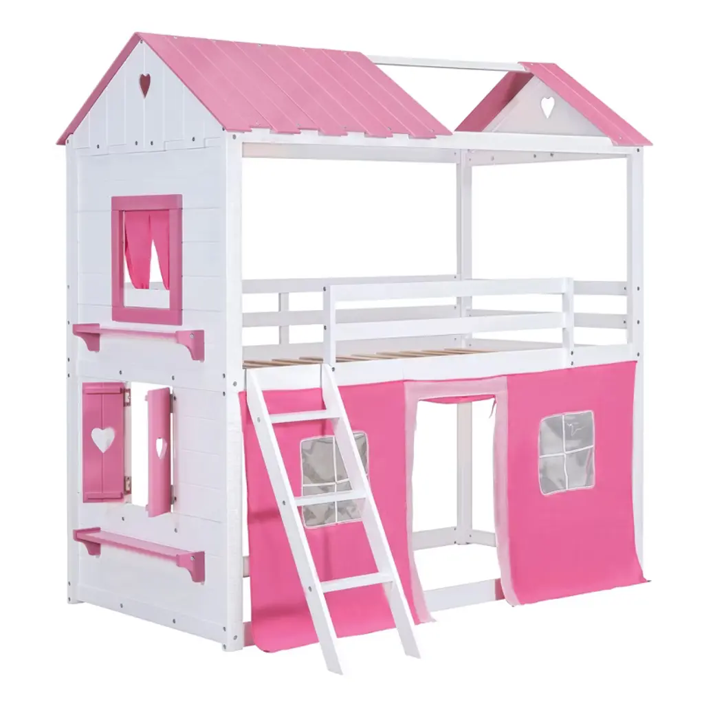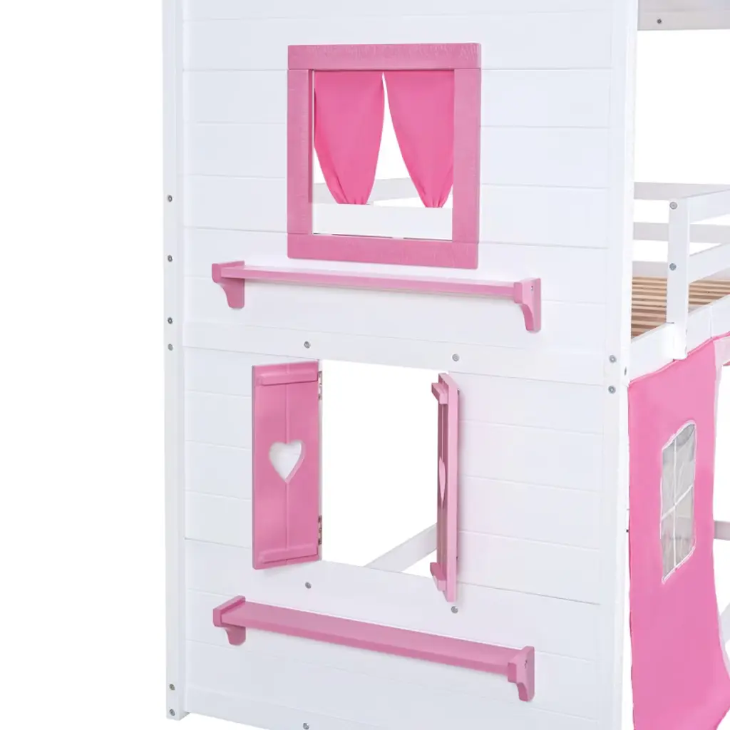 Product Features [Playhouse Design] Castle like with window design bed creates a fun and adorable space that not only serves as a comfortable sleeping area but also double as a space for you to play and have fun. In addition, the small windowsill next to the window can be used for storage, adding sense of realism and fun. The slide can be installed on each side.[Impression & Beautiful] Featuring elegant and elaborated windows and roof design, this unique bed will be the focus in bedroom when friends coming by. This bed brings rich rural life style to bedroom, not only offers great fun for your bedtime but also adds highlights to bedroom.[Sturdy Construction & Unique Design] Made of solid pine wood and high quality MDF, this bed provides great stability. The slats are available compatible with each bed compatible with better weight capacity. And our unique design make your child's like to sleep.[Spacious Under Bed Space] This bed have the semi-enclosed space, it means you will have extra space no only for sleeping while offer a extra space for storage or creating a mini playground. This extra semi-enclosed space ensure air circulation. Give kids a fresh air night.[Detail & After-sales service] Overall Product Dimension: 81.9"L x 58.5"W x 83.1"H. Mattress not included. Some assembly is required, although we have provided clear instructions and tools. Description The opportunities are endless to create a fun play environment for your kids, They will look forward to bedtime, reading time. This unique design bed not only saves space, but creates an exciting atmosphere for you. Enjoy this bed for years to come with its durable build, manufactured with quality lumber and pinewood to withstand horseplay, scratching and other untimely wear. Comes complete with thick slats to preserve the life of your mattress. This bunk bed featuring elegant and elaborated windows and roof design not only offers great fun for your bedtime but also adds highlights to bedroom. Weight & Dimensions Overall Product Dimension: 81.9"L x 58.5"W x 83.1"HDetail Product Dimension: Please refer to the Size imageNumber of Package: 2Package Dimension: Please refer to the SpecificationOverall Product Weight: 160.94 LBSWeight Capacity: Upper bed: 400LBSRecommended Mattress Thickness: Upper bed: 4-6"Recommended age: Over 6 years Specifications Product Type: Bunk BedSize: TwinProduct material: Plywood + MDF + PinewoodBox Spring Required: NoMattress Included: NoThe number of slats: 14