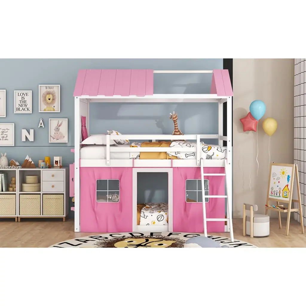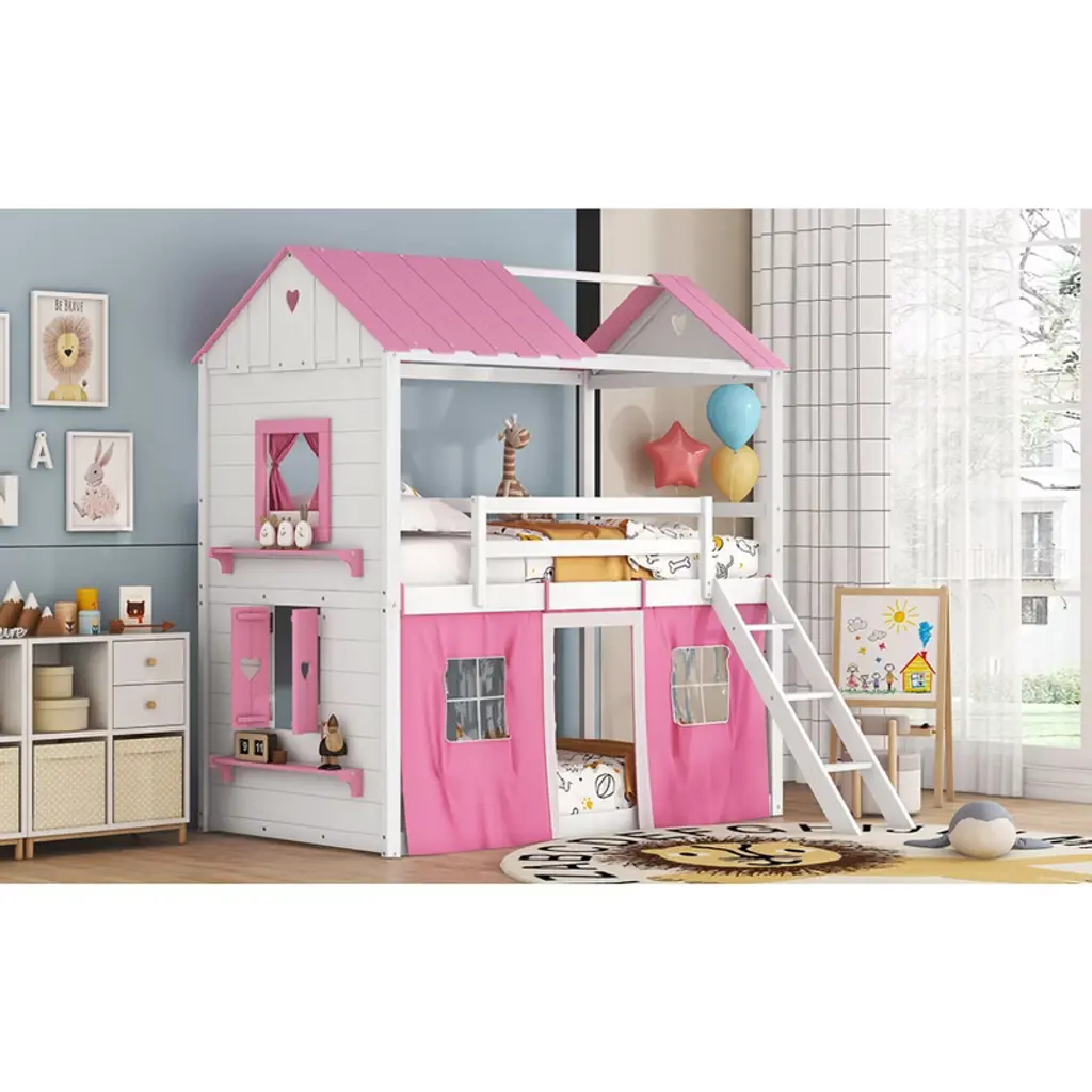 Twin Size Bunk Wood House Bed With Elegant Windows, Sills And Tent