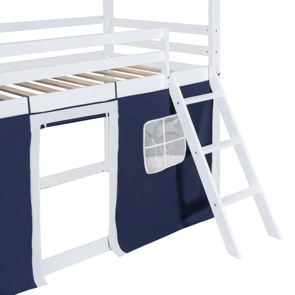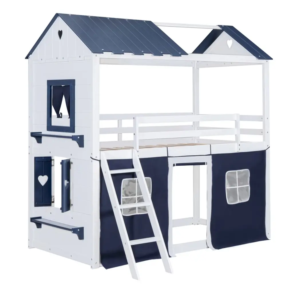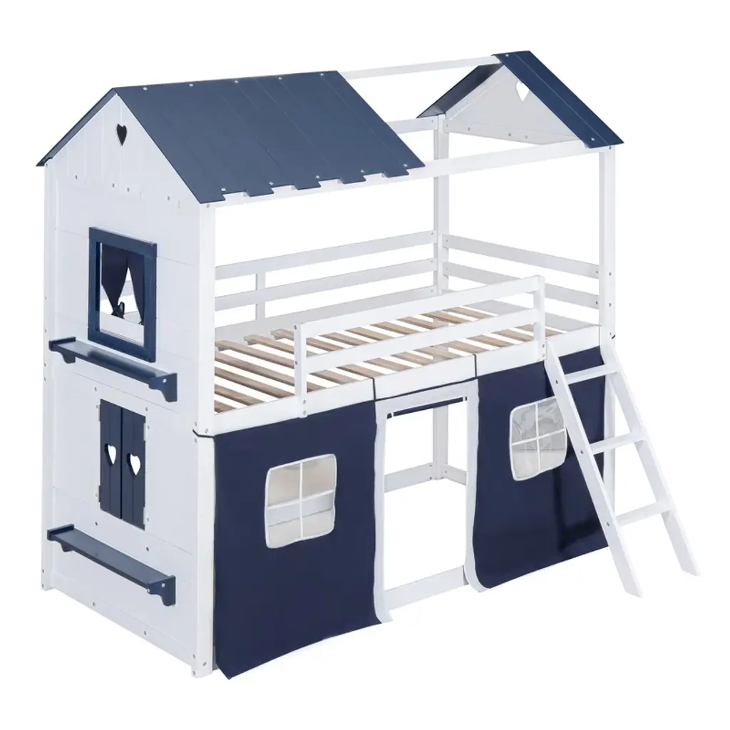 Twin Size Bunk Wood House Bed With Elegant Windows, Sills And Tent