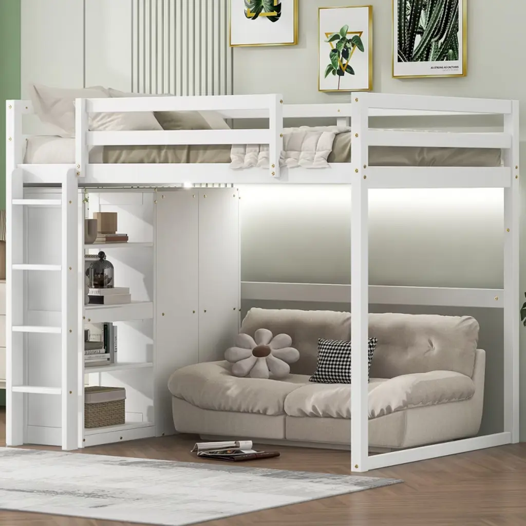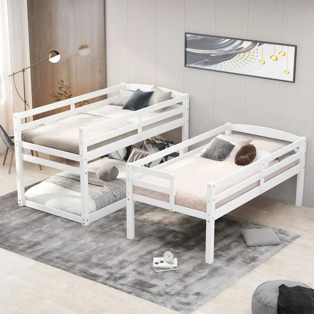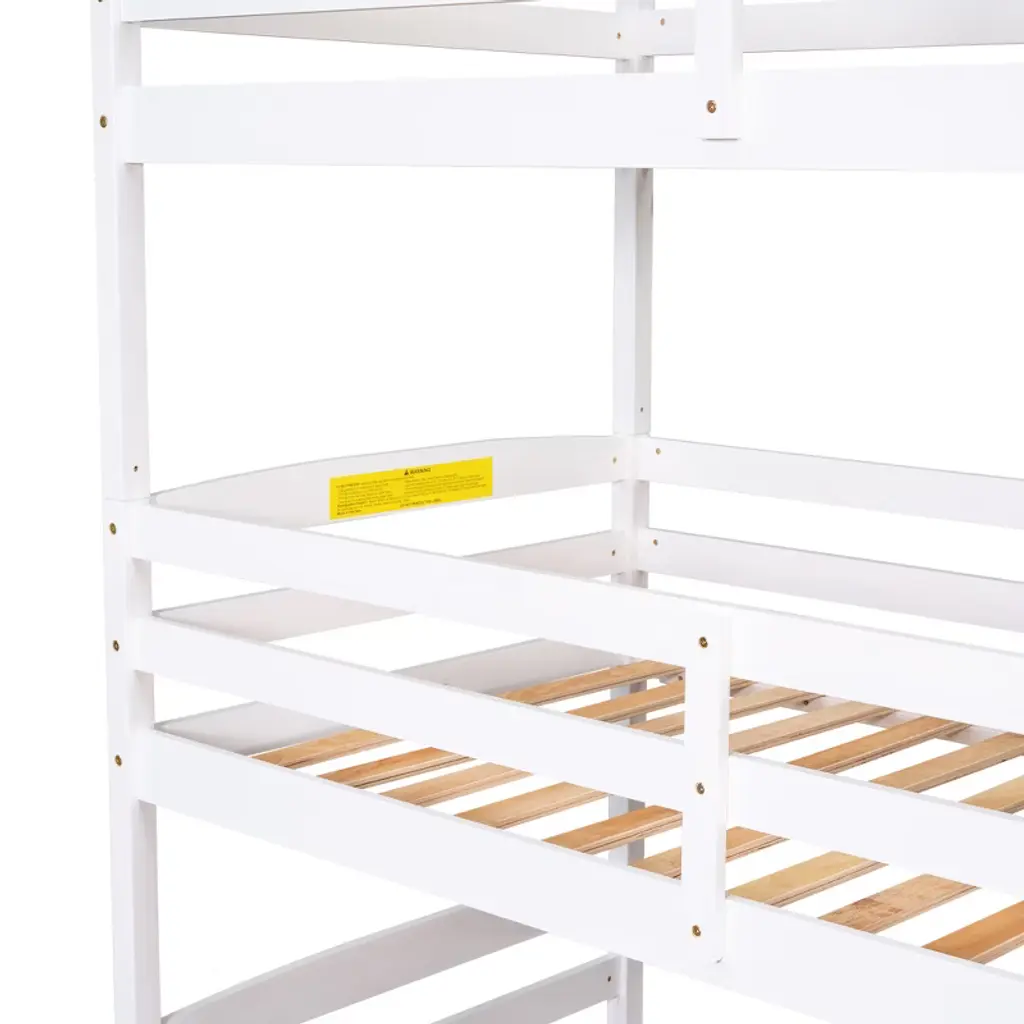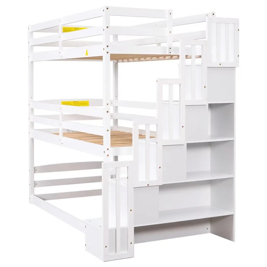 Product Features [Separate Design] This bunk comes with a separate design. It can be disassembled into an individual bunk bed and a platform bed.[3 Beds in 1] This bunk bed features three twin-size beds and can accommodate 3 family members or overnight guests, which is perfect for you.[Storage Staircase] A sturdy staircase gives easy access to the top bunk beds, and the space under the staircase offers you extra storage space.[Solid Construction] Made of high-quality solid pine and MDF, it is stable and durable. Supported by wooden slats, no spring box is required.[Easy to Assemble] All parts included in your package are indicated clearly. With a step-by-step installation manual and pre-drilled holes, you can easily assemble this bunk bed individually. Manual installation is recommended. Description This triple bunk bed is beautifully made and extremely adaptable. It features plank headboards and footboards. It can be disassembled into an individual bunk bed and a platform bed. This delightful bunk bed is made of a partially solid wood construction made to last for years to come, and the design gives a transitional style to this bed. A sturdy staircase gives easy access to the top bunk beds, and the space under the staircase offers you extra storage space. Description Bed Material: Pine Wood + MDFSize: TwinNumbers of Package: 2Assembly Required: Yes Dimensions Overall Product Dimension: 94.4''L x 47.6''W x 77.8''HPackage Dimension: Please refer to the SpecificationEach Bed Dimension: 77'' x 39.4''Total Height: 77.8''Number of Each Bed Slats: 14 / 14 / 0 pcsOverall Product Weight: 231 lbEach Bed Weight Capability: 200 lbEach Bed Mattress Thickness: 6''
