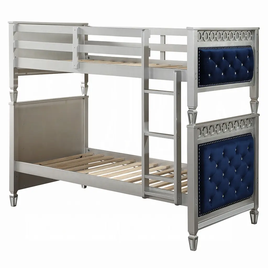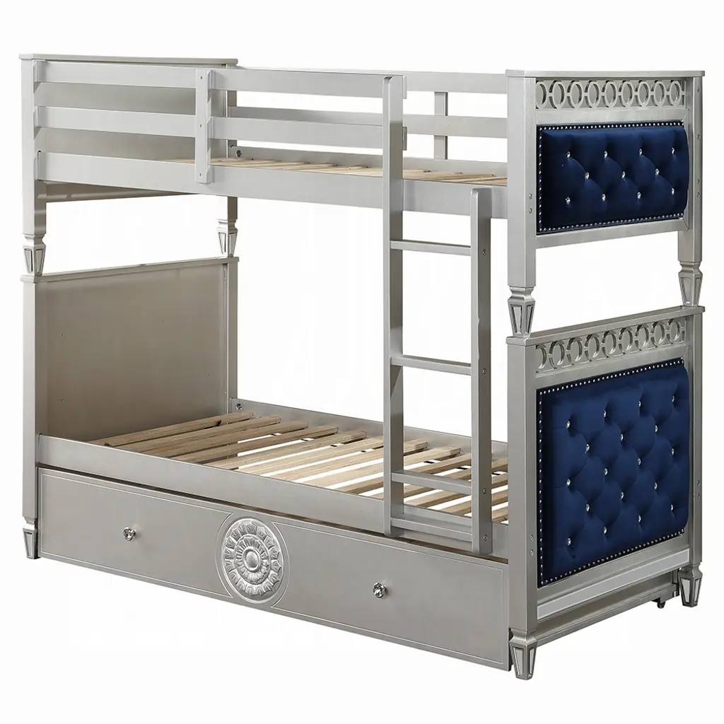 Fulfill your children's dreams of being royalty with this Varian twin over twin bunk bed and trundle. With elegant details such as a silver finish, button-tufted velvet upholstered headboard and footboard panels, and beautifully tapered legs, all add to the regal vibes of this design. Impromptu sleepovers are a breeze with the pull-out trundle. The safety guardrails add ease, knowing that there will be no falls at night. Great for growing kids, this bed offers the function to be converted into two separate twin beds.