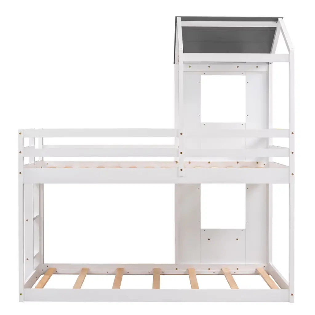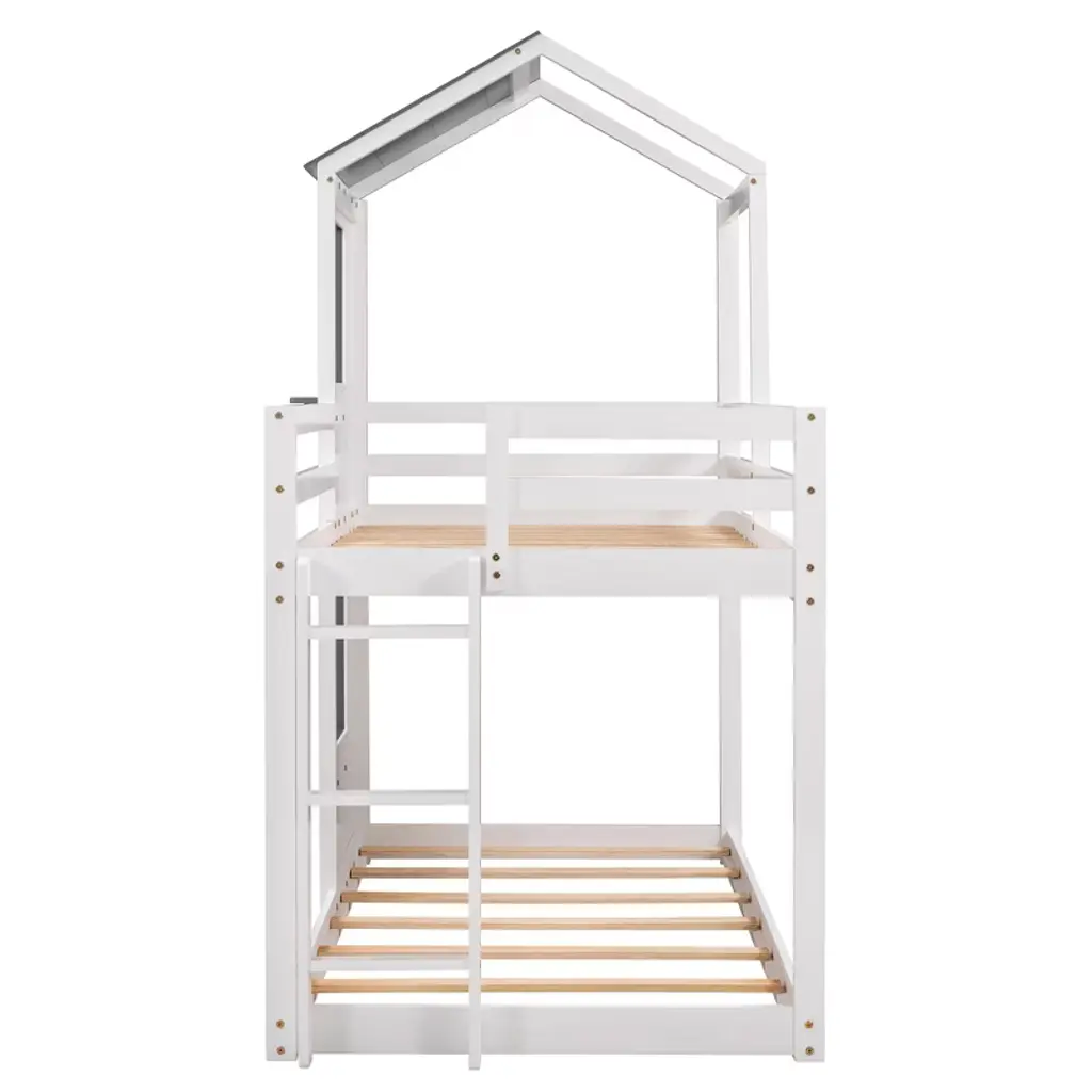 Wooden Twin Over Twin House Bunk Beds, Low Bunk Bed With Roof And Window For Kids Teens, White