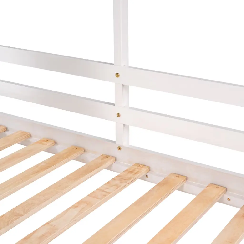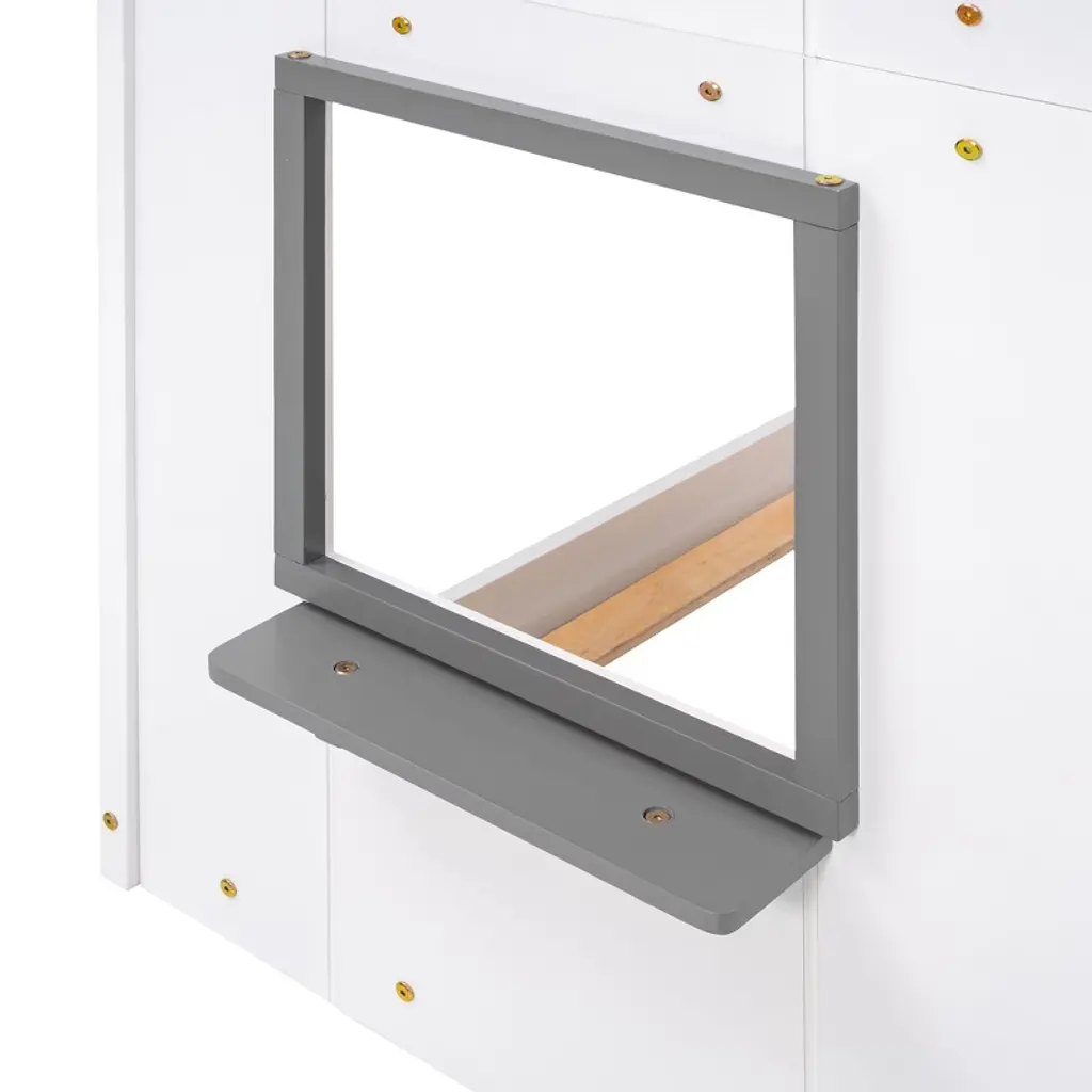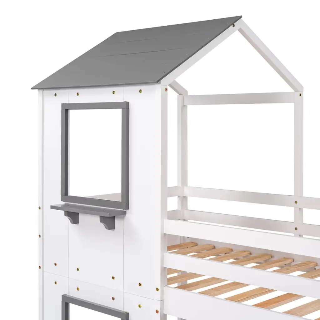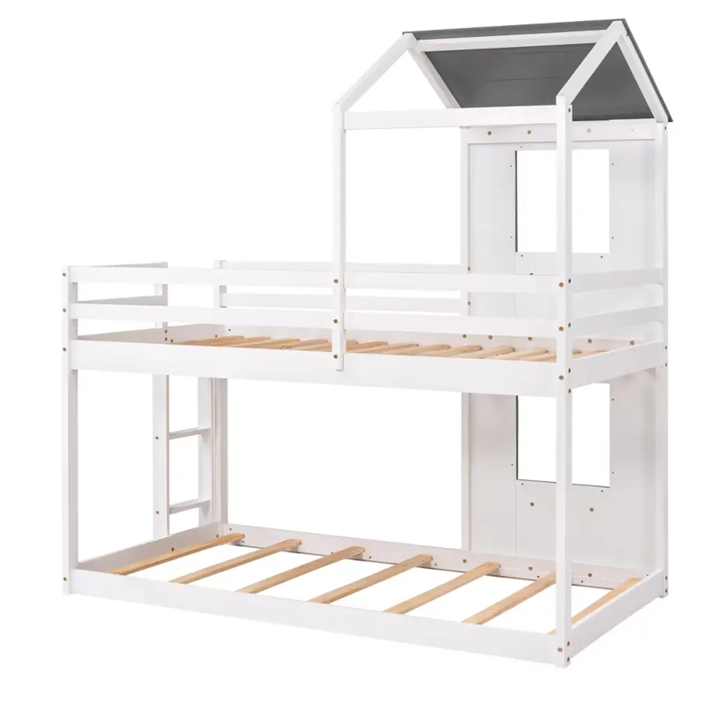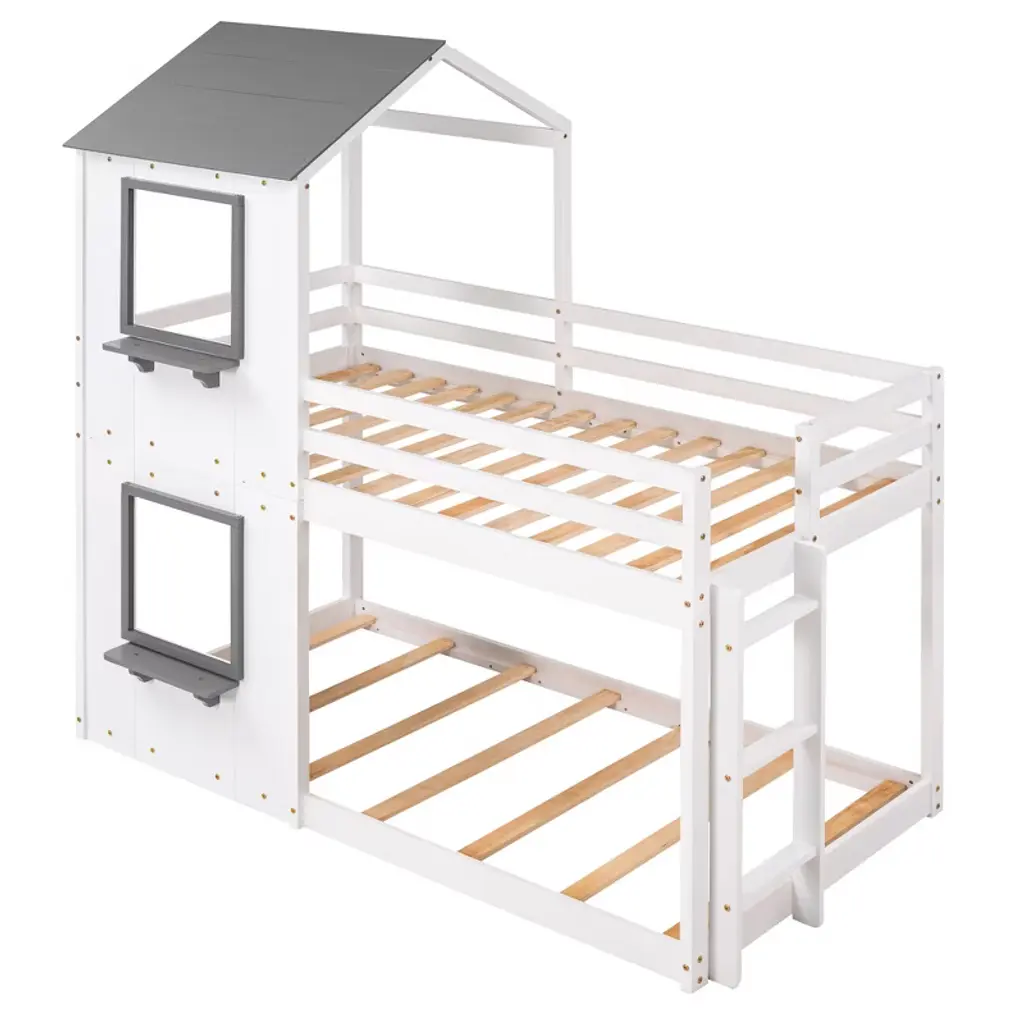 Take your bedroom to the next level with this twin over twin bunk bed that not only saves space, but creates an exciting atmosphere for you. Featuring a pitched roof and playhouse-inspired wall with window, this bunk bed doubles as a semi-enclosed play place perfect for you to study, watch TV or explore their imaginations. With guardrails, a ladder and a sturdy pine frame, this bunk bed offers a safe space for you to get a good nights sleep.Product Detail:- Product Type:Bunk Bed- Size:Twin over Twin- Overall Product Dimension:77.4"L x 41.7"W x 83.2"H- Overall Product Weight:122 LBS- Detail Dimension: Please refer to the Size picture- Weight Capacity: Upper bed: 250 LBS / Bottom bed: 300 LBS- Material: Plywood+MDF+Pinewood- Recommended Mattress Thickness: Upper bed: 6" / Bottom bed: 8" (The mattress is not included)- Number of Packages: 2 (Packages shipped separately may not arrive at the same time, please be patient.)- Assembly Required:YesWhat's in the box:- Bed * 1- Tools included- Instruction manual