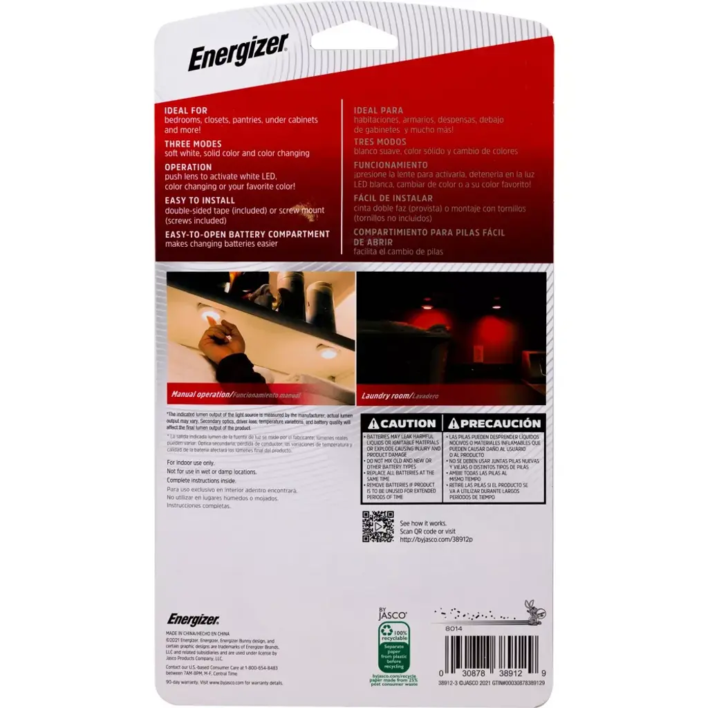 Add high-quality and convenient lighting anywhere in your home with this pack of two Energizer Color-Changing LED Puck Lights. Standout features include the option of slowly cycling through multiple vibrant colors or choosing your favorite! All you have to do is press on the lens to turn them on and to change between the different color options. For stylish accent lighting, place the lights underneath or on top of kitchen cabinets, shelves or bookcases, or utilize them in smaller enclosed areas, such as closets and pantries. Each puck light requires 3 AA batteries and can be easily mounted wherever you need them to be. There will never be a need to hire an expensive electrician to install the light for you – just use the included double sided tape, or screw through the two holes in the back cover for a more permanent installation. For simple, convenient and effective lighting, illuminate your home with this set of two Energizer Color-Changing Puck Lights.