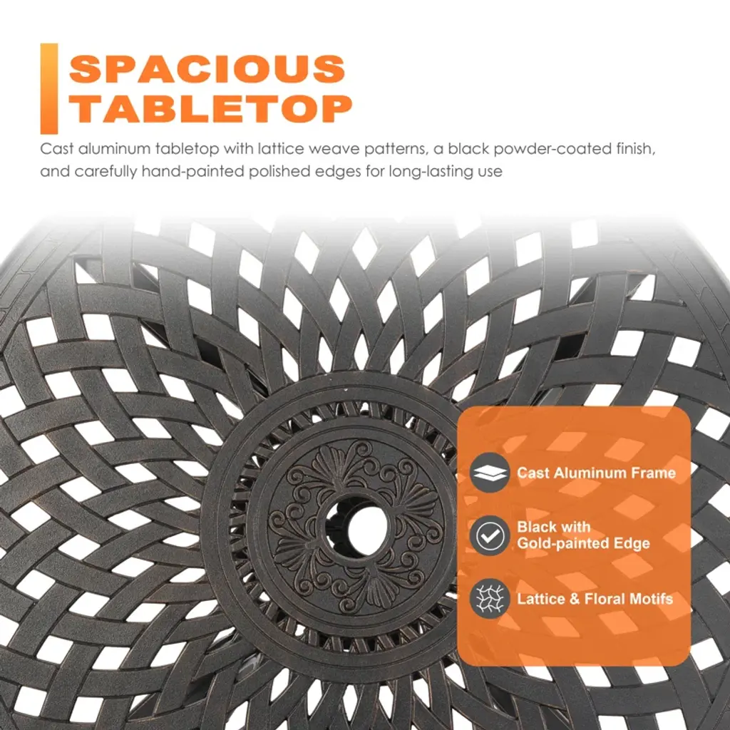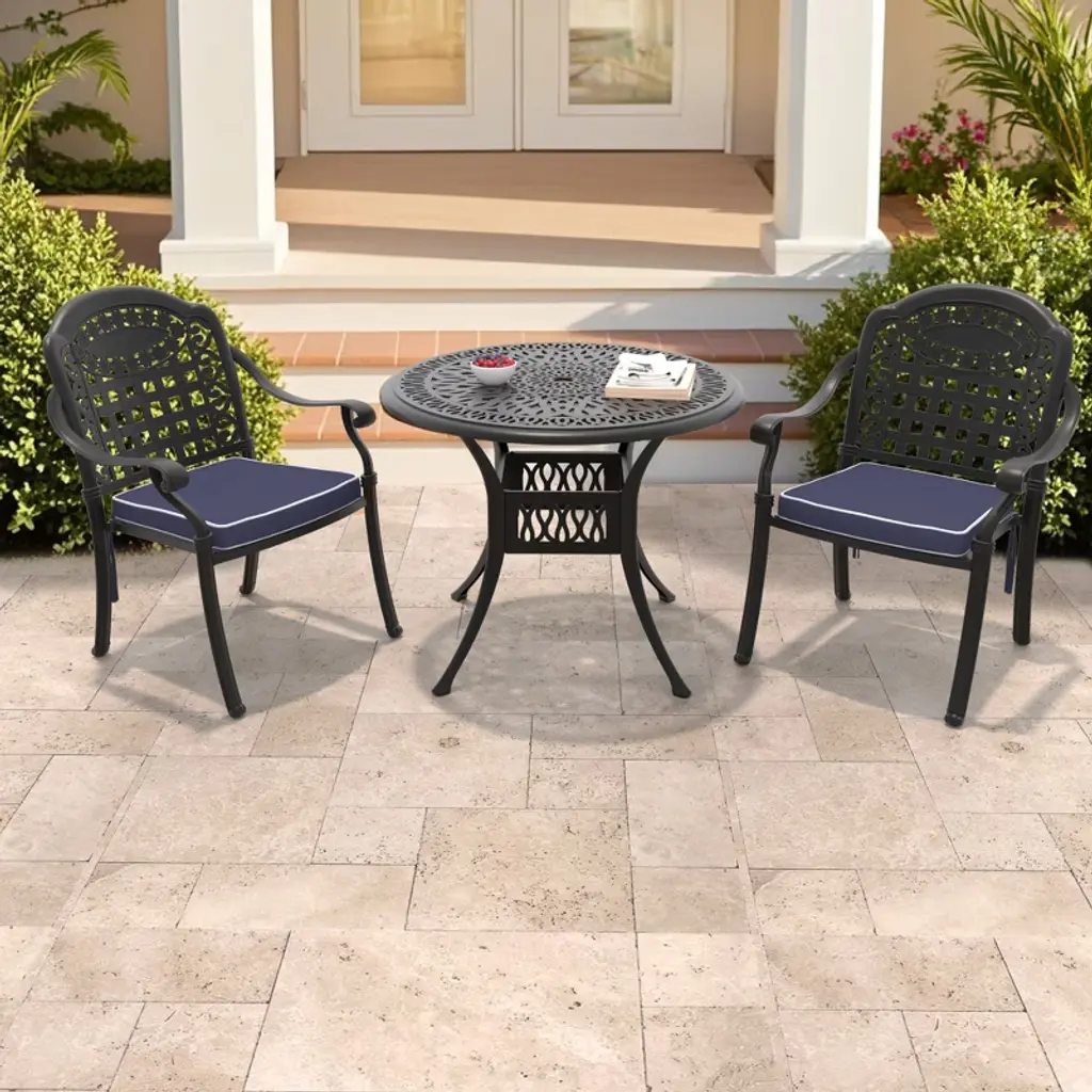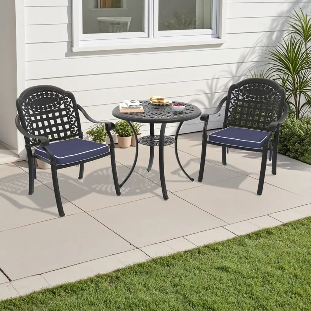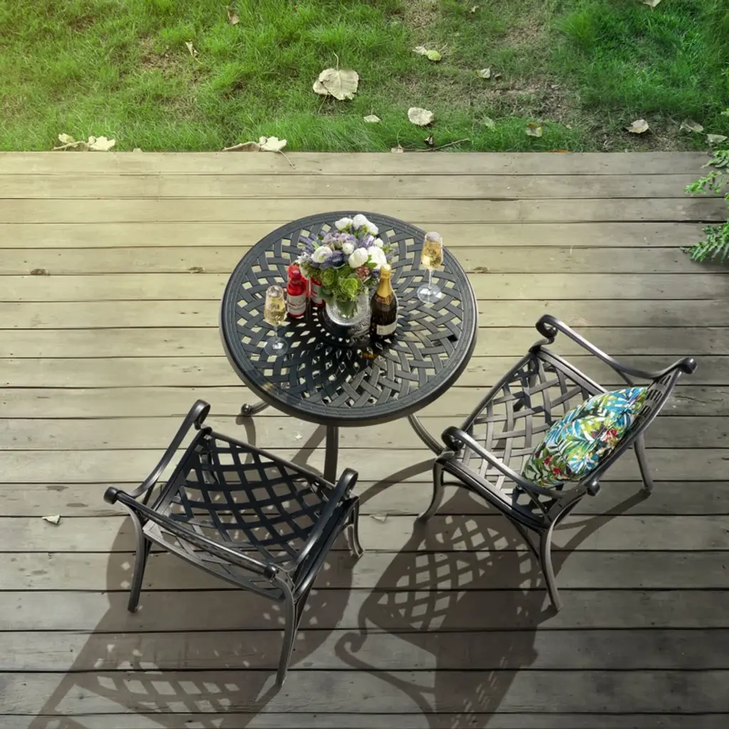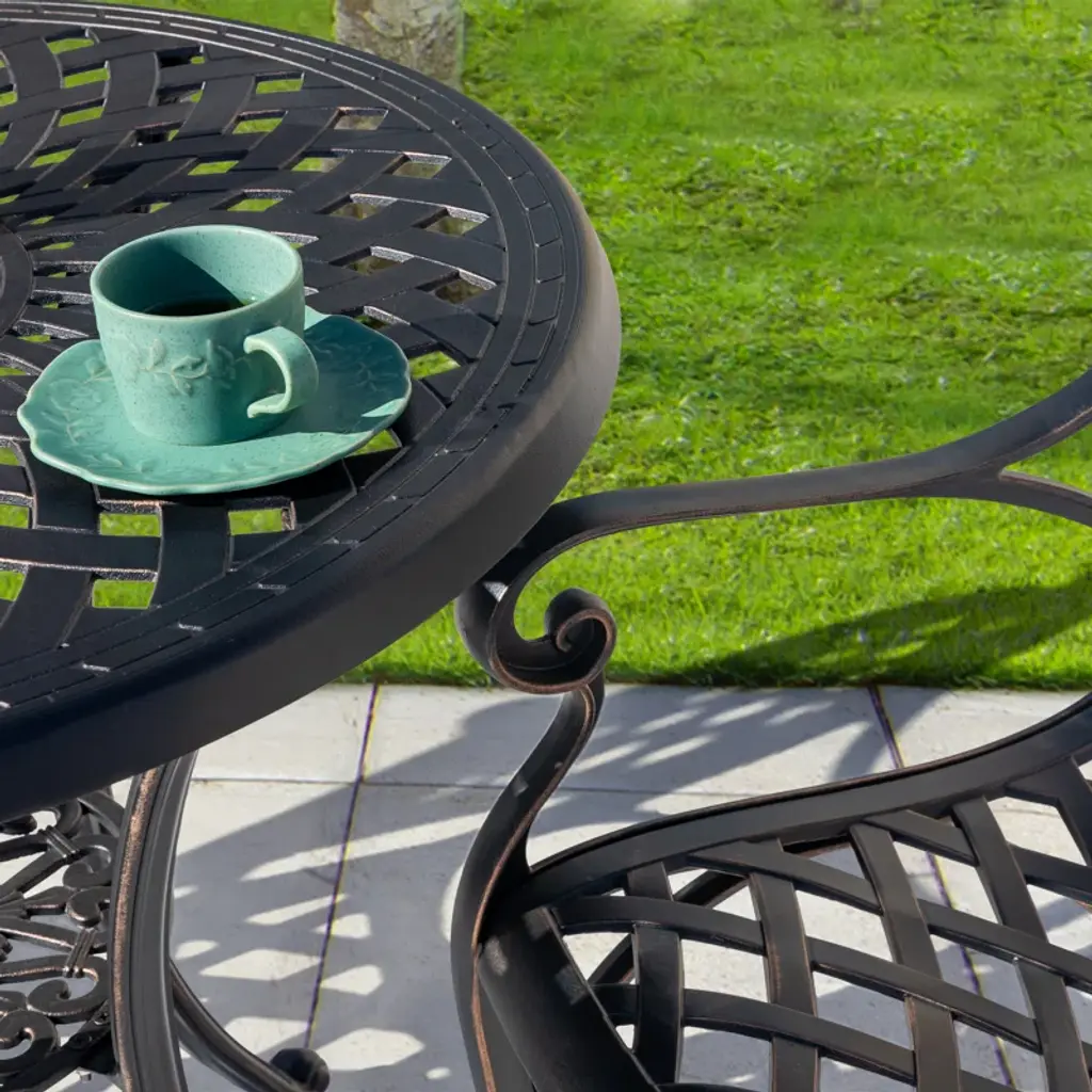 This outdoor bistro set is an amazing addition for any patio. Comes complete with matching table and chairs which made from lightweight and rust resistant cast aluminum for your durable using. Spending the patio time with your family and this new stylish cast aluminum bistro set.