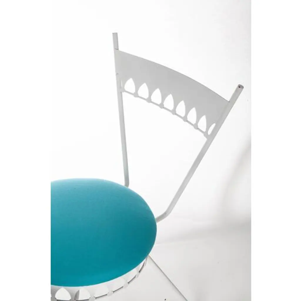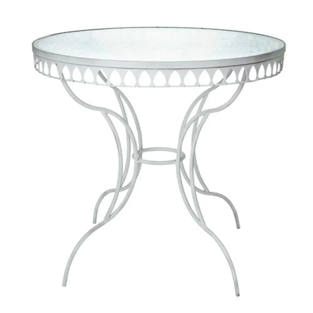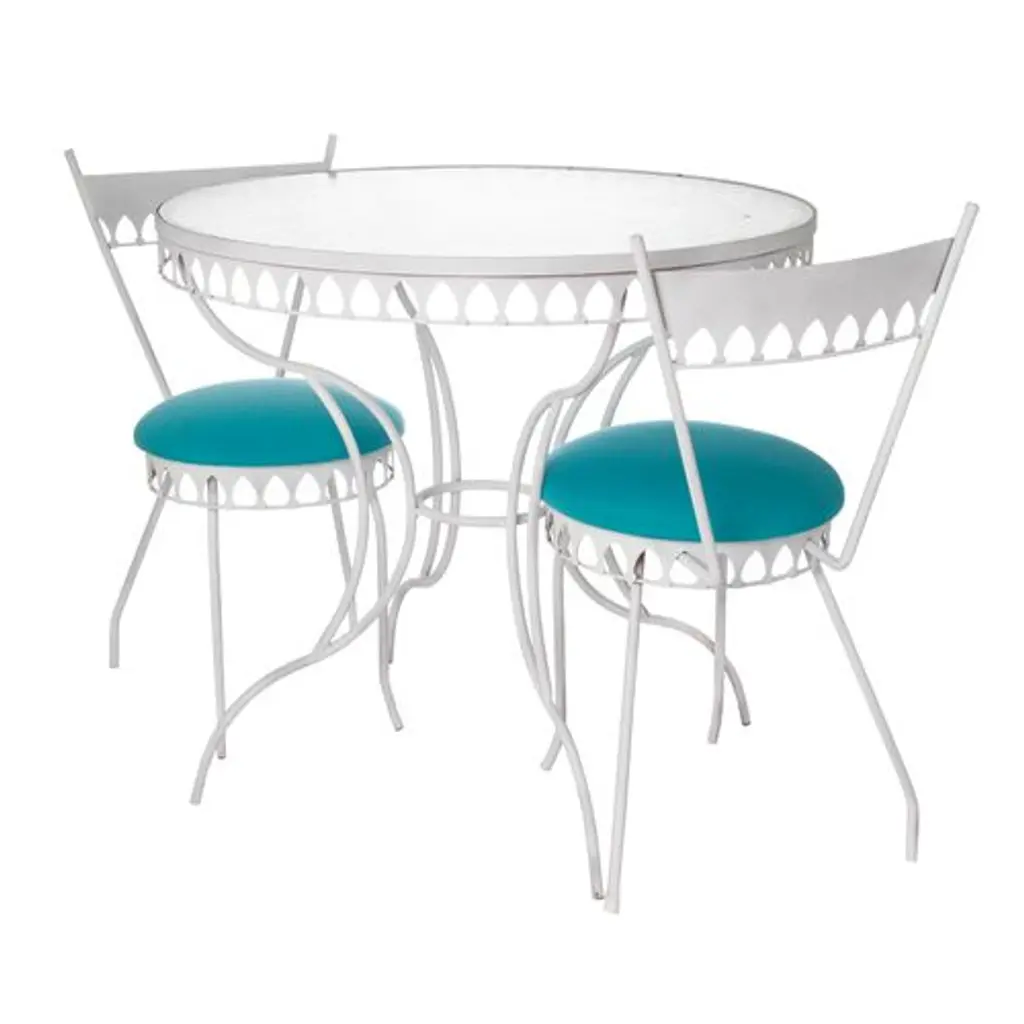Striking Moorish style Mid-Century 3 piece cafe set in off white. Perfect for balcony or other small spaces. The set features two petite chairs with a rounded back that contours to the body. The seats, new inside & out; are covered in bright aqua Sunbrella fabric. The round table with the original tempered glass, is in mint condition. Unfortunately there is no makers mark. The upholstered seats are removable. 18ʺW × 18ʺD × 35ʺH