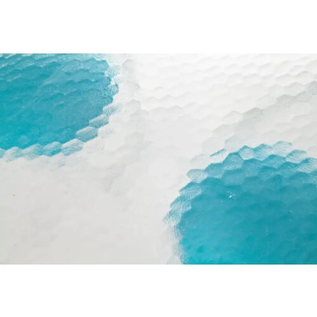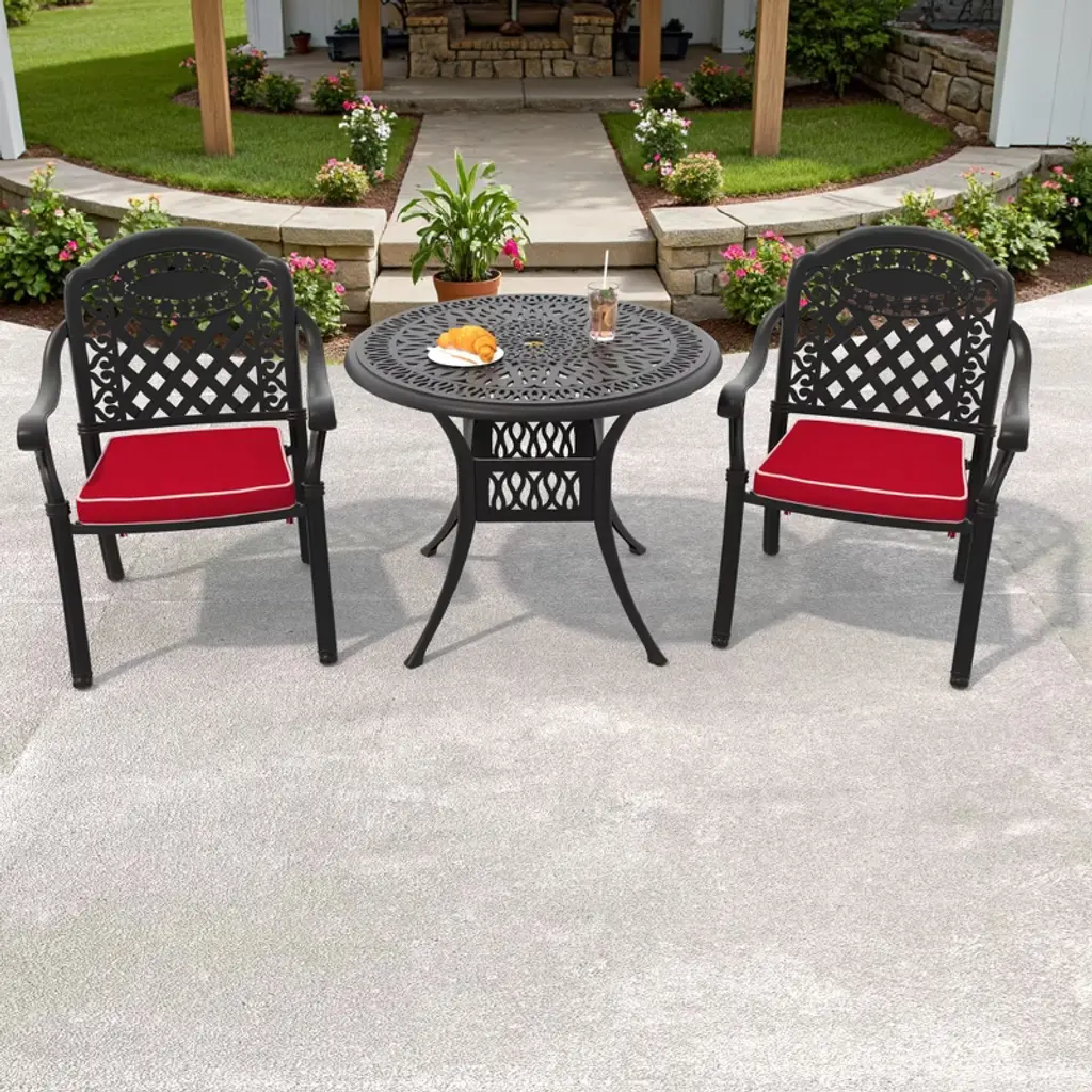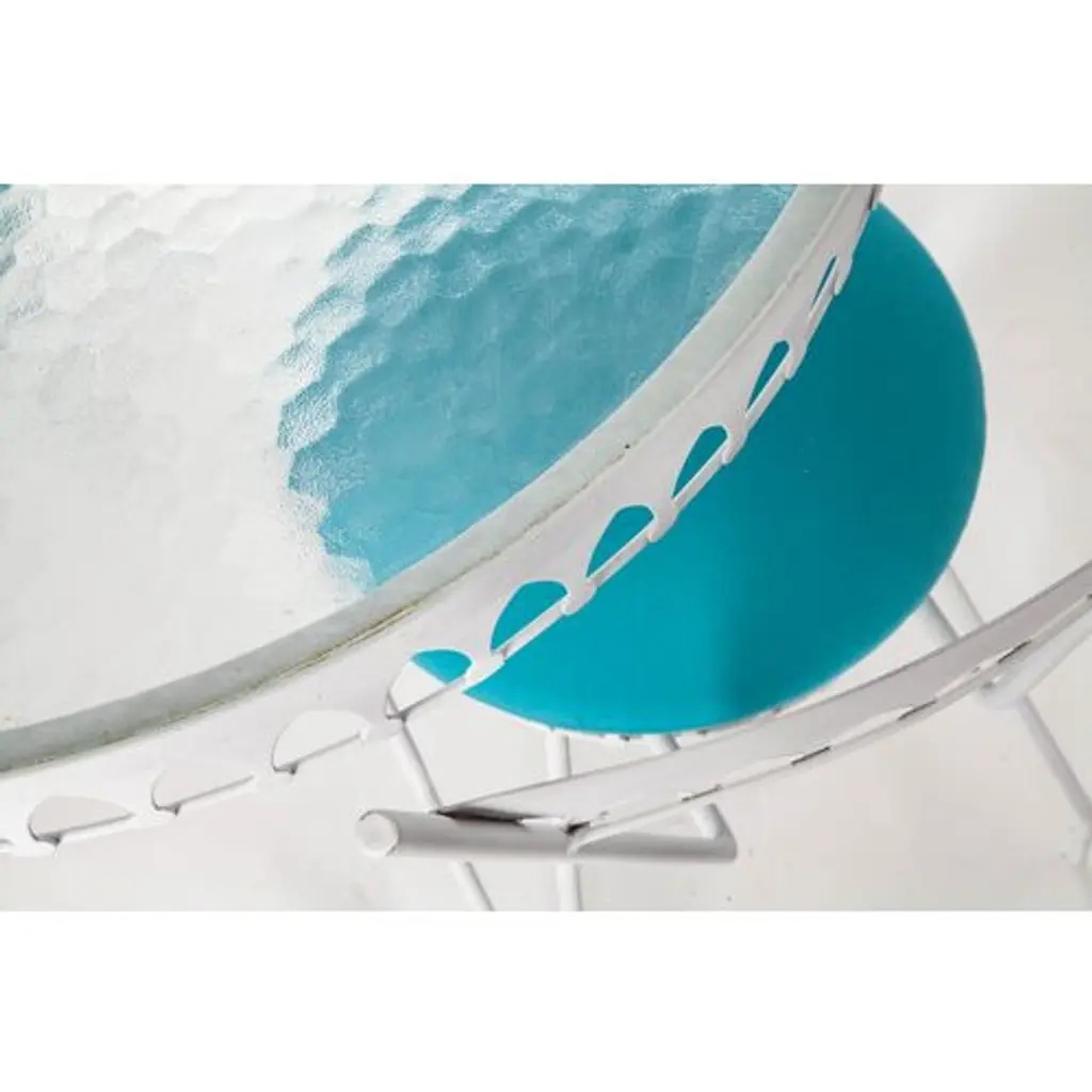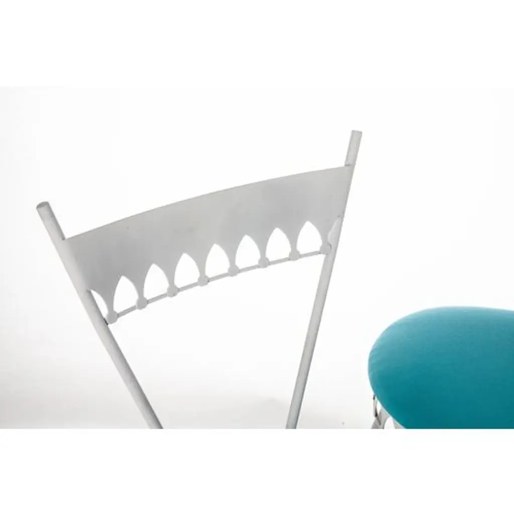 Striking Moorish style Mid-Century 3 piece cafe set in off white. Perfect for balcony or other small spaces. The set features two petite chairs with a rounded back that contours to the body. The seats, new inside & out; are covered in bright aqua Sunbrella fabric. The round table with the original tempered glass, is in mint condition. Unfortunately there is no makers mark. The upholstered seats are removable. 18ʺW × 18ʺD × 35ʺH