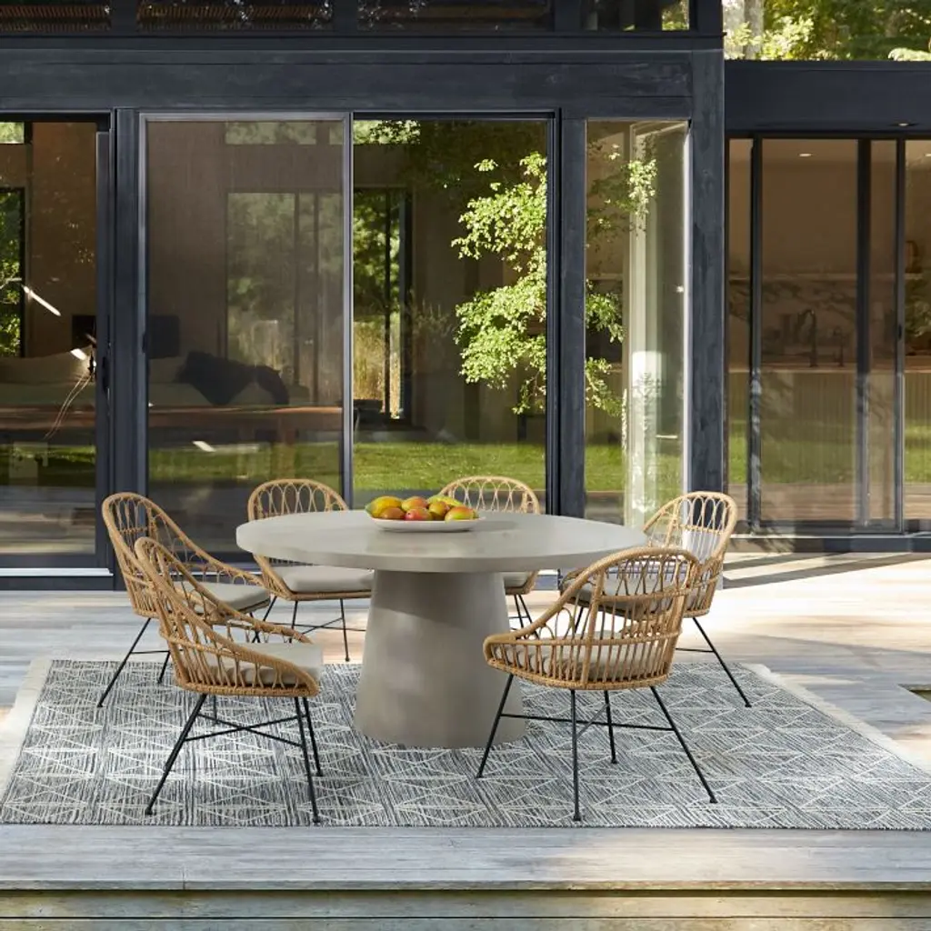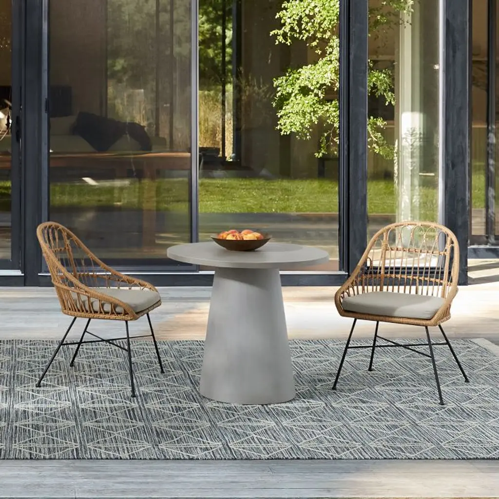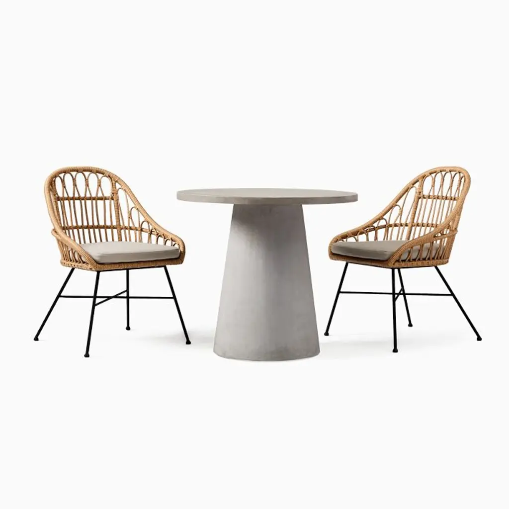 We made pairing easy with this ready-to-buy set. Sized just right for al fresco dinner parties of two to six, our Pedestal Bistro Table adds industrial style to any outdoor space. We rounded it out with our vintage-inspired Palma Dining Chairs. For sets pictured, select 1 x 32" Table and 1 pair of Dining Chairs; 1 x 44" Table and 2 pairs of Dining Chairs; or 1 x 60" Table and 3 pairs of Dining Chairs. Components are priced individually. Table: Glass fiber reinforced concrete in Gray. Glass fiber reinforced concrete is engineered to be lighter than concrete but with the same durability. Chairs: Faux rattan and aluminum frame in Natural with steel legs in Black. Seat cushion has solid foam core and loose fiber fill. Table is Contract Grade and manufactured to meet the demands of commercial use in addition to residential. See more. Made in Vietnam.