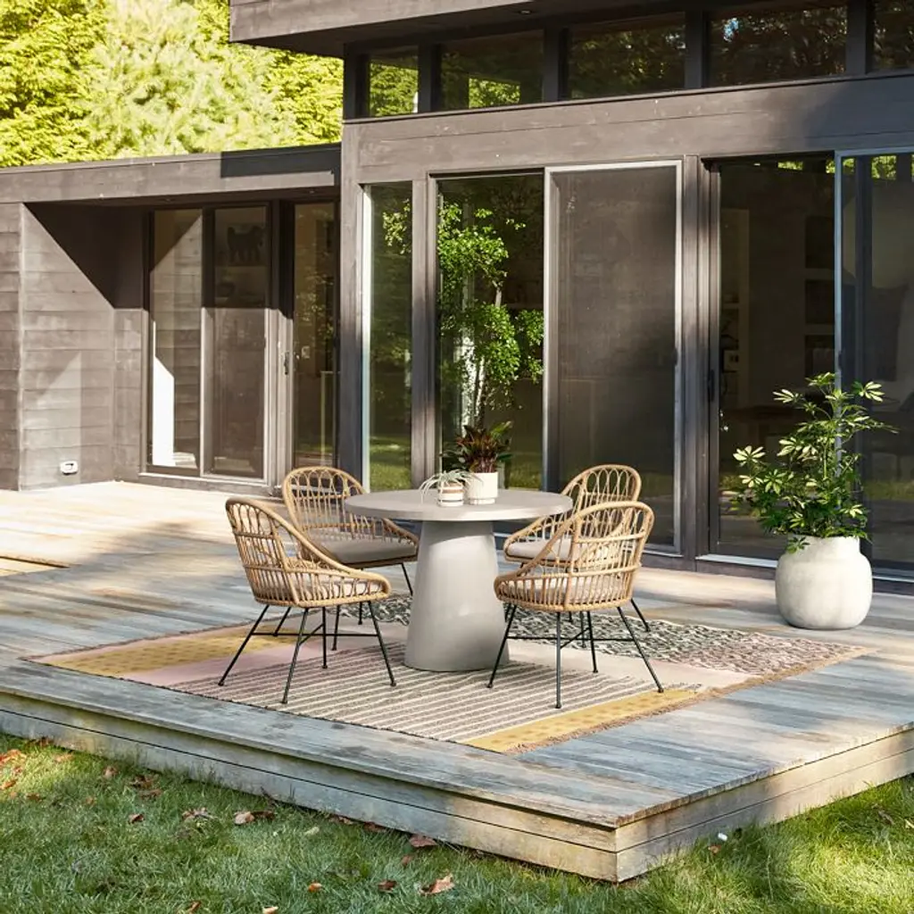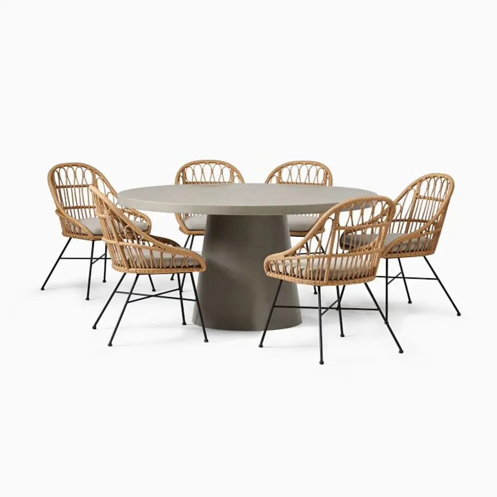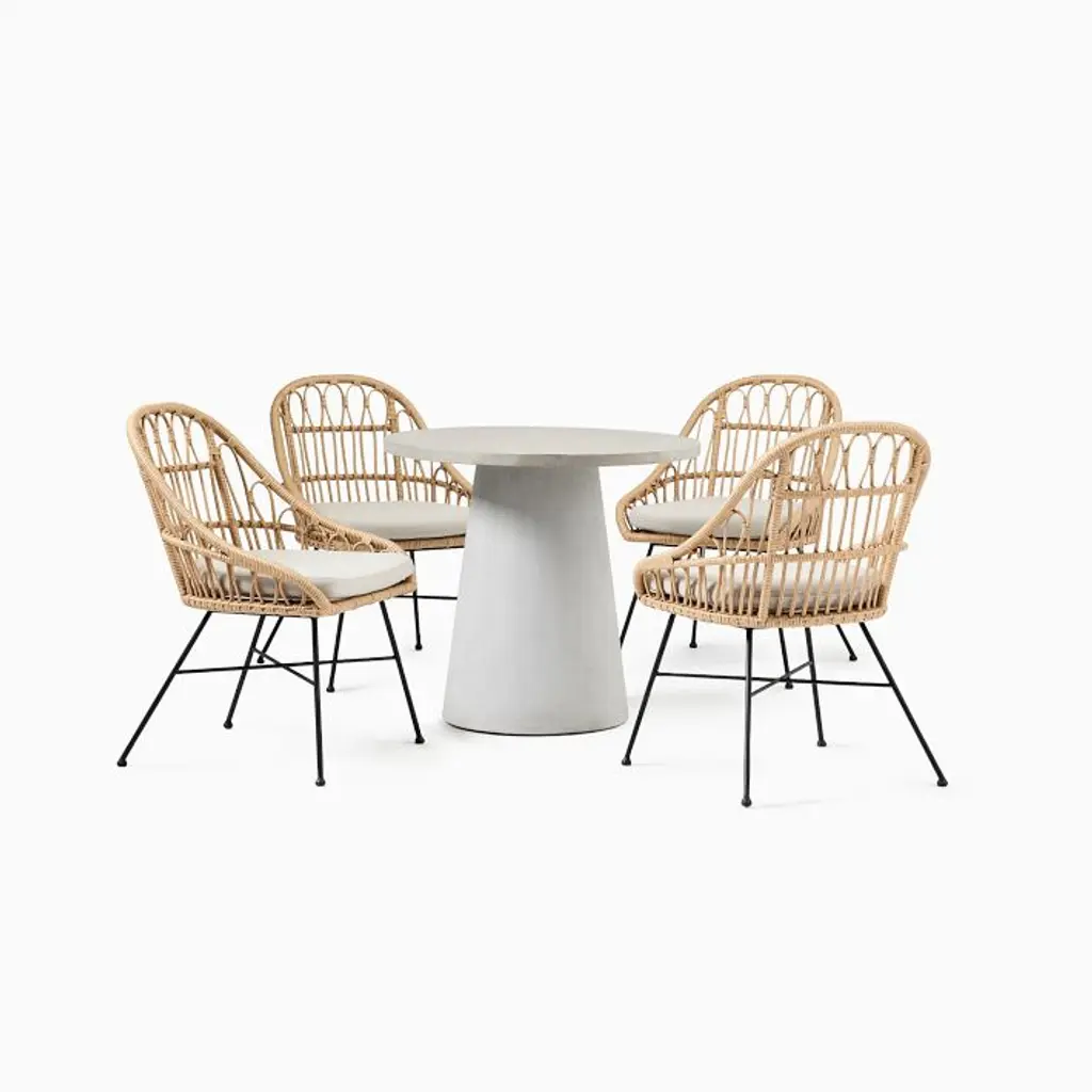 We made pairing easy with this ready-to-buy set. Sized just right for al fresco dinner parties of two to six, our Pedestal Bistro Table adds industrial style to any outdoor space. We rounded it out with our vintage-inspired Palma Dining Chairs. For sets pictured, select 1 x 32" Table and 1 pair of Dining Chairs; 1 x 44" Table and 2 pairs of Dining Chairs; or 1 x 60" Table and 3 pairs of Dining Chairs. Components are priced individually. Table: Glass fiber reinforced concrete in Gray. Glass fiber reinforced concrete is engineered to be lighter than concrete but with the same durability. Chairs: Faux rattan and aluminum frame in Natural with steel legs in Black. Seat cushion has solid foam core and loose fiber fill. Table is Contract Grade and manufactured to meet the demands of commercial use in addition to residential. See more. Made in Vietnam.