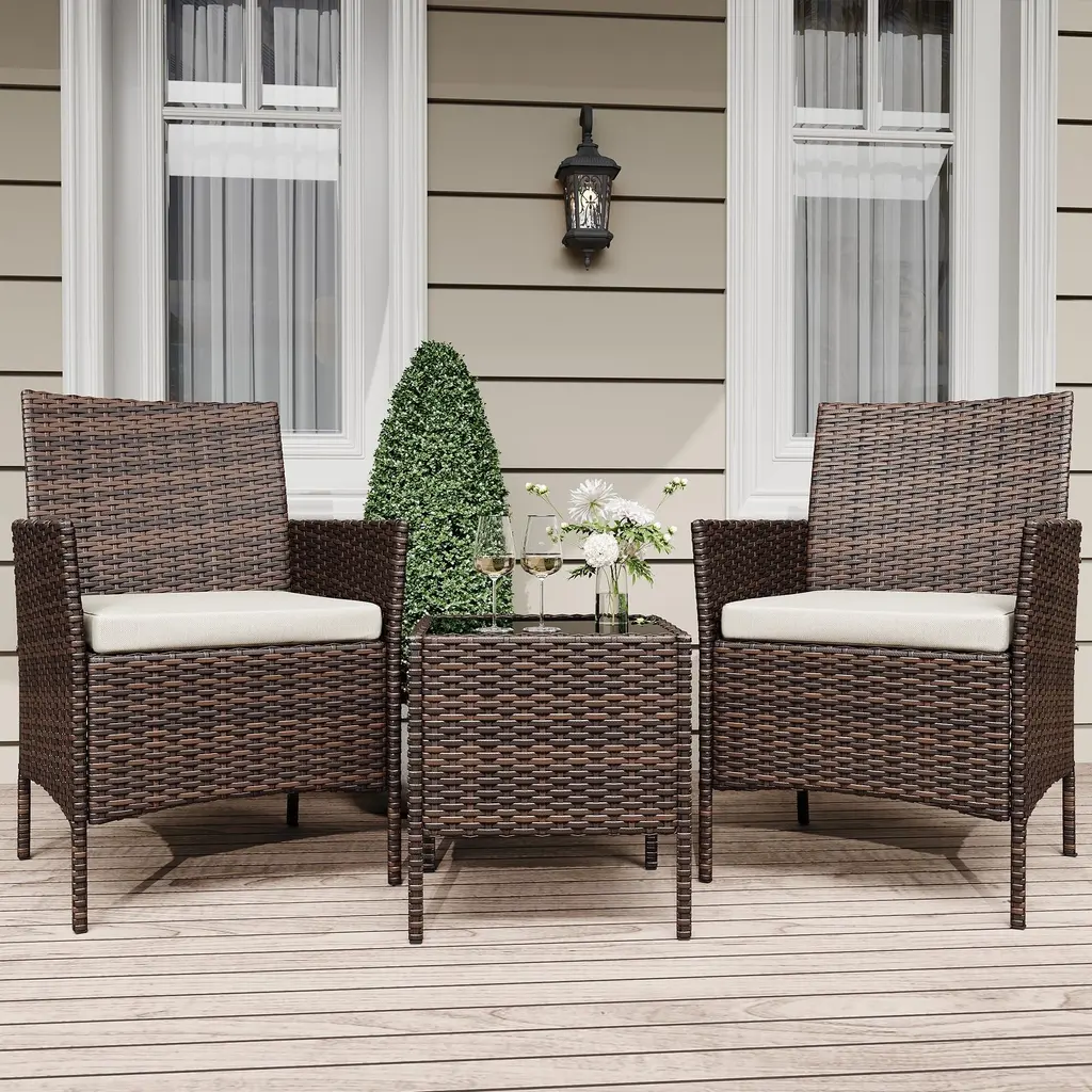Elegant Rattan Weaving Design:The patio furniture set adopts high-quality rattan weaving craftsmanship, it presents a natural and stylish appearance, which can blend perfectly with various outdoor environments and enhance the aesthetics of the spaceComfortable Cushions:The patio chairs come with thick cotton cushions that provide superior comfort, allowing you to sit for long periods of time without feeling fatigued while enjoying your time outdoorsSturdy and Durable Construction:The rattan material is weather resistant and can handle a variety of outdoor weather conditions. The rattan is treated to resist rust and corrosion, ensuring a longer lifespanVersatile Use: The bistro table and chairs set includes 2 single seats and a coffee table, it is suitable for decorating the patio without taking up space. Perfect for use in patio, backyard, porch, garden, lawn, balcony. Perfect for all outdoor spacesEasy to Clean & Maintain:The surface material is easy to clean, waterproof and stain-resistant, not easy to get dust and stains, so you can easily keep the table and chairs neat and beautiful