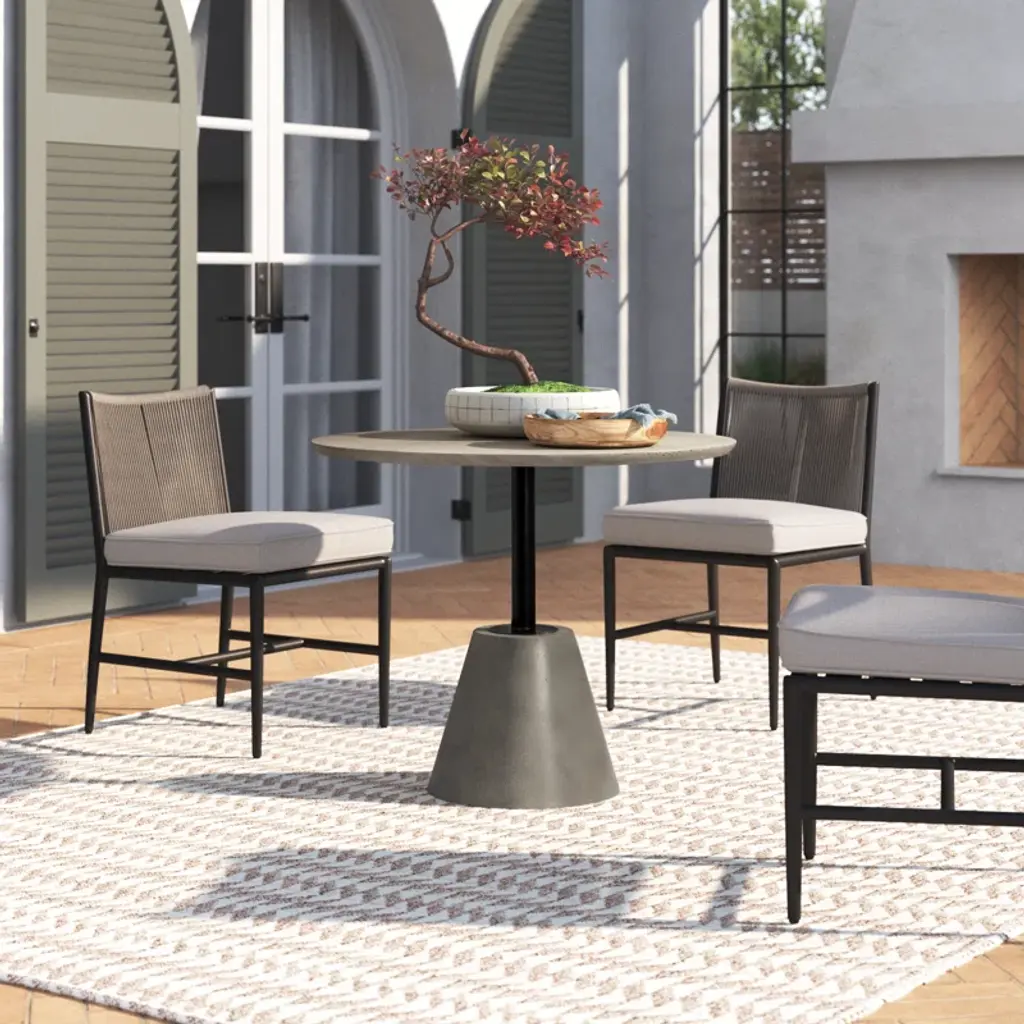 Introducing the Allengrove concrete outdoor bistro table - a true masterpiece that transforms your outdoor space into a haven of style and relaxation. Designed to impress, the table marries form and function seamlessly. Its fiber-reinforced concrete and iron composition speaks of quality craftsmanship, while the dark gray concrete sealant finish adds a touch of refinement.