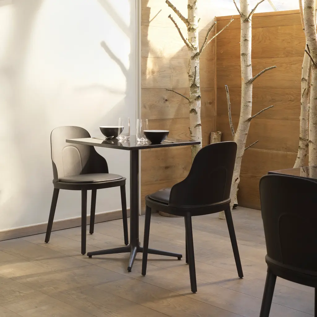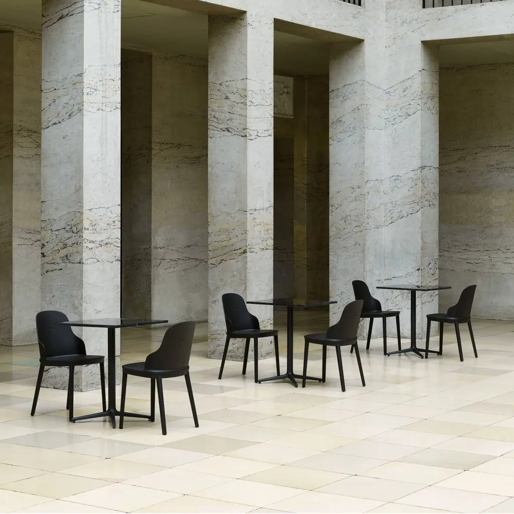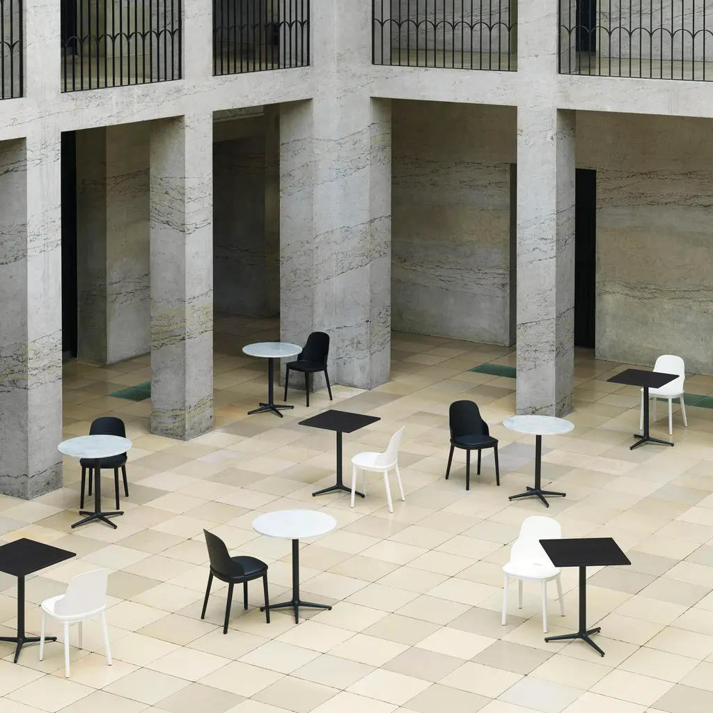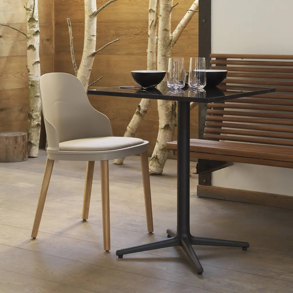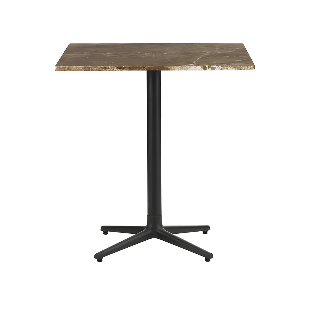 Also available in a square version, designer Simon Legald’s reimagined café table offers the same versatility as the round model, with options for use both indoors or outside. Allez with either the marble or lightweight, ultra-thin stainless steel tabletop works in both environs while the blackened or natural oak veneer is also offered for interiors. Characterized by its modernist silhouette and cylindrical cast-iron pedestal with a 3-or 4-legged base, the square table comes in 2 sizes.
