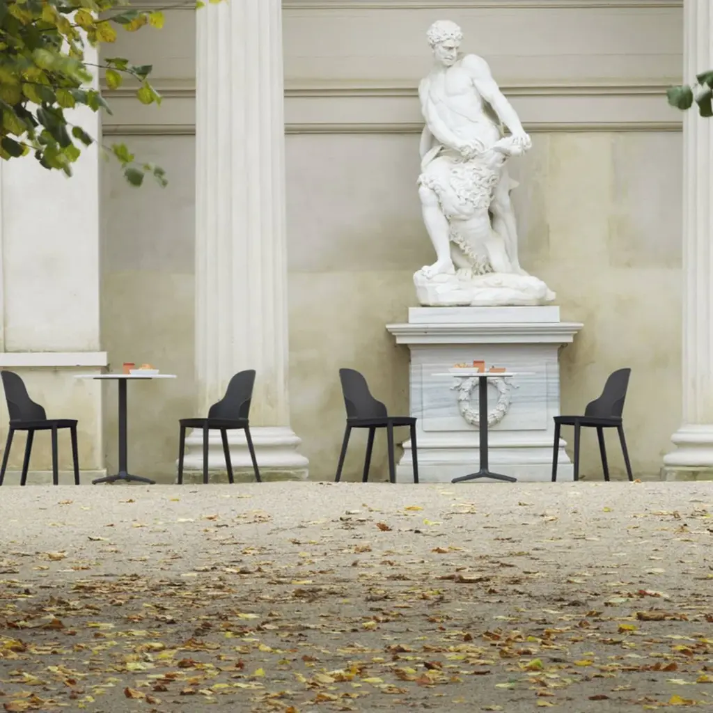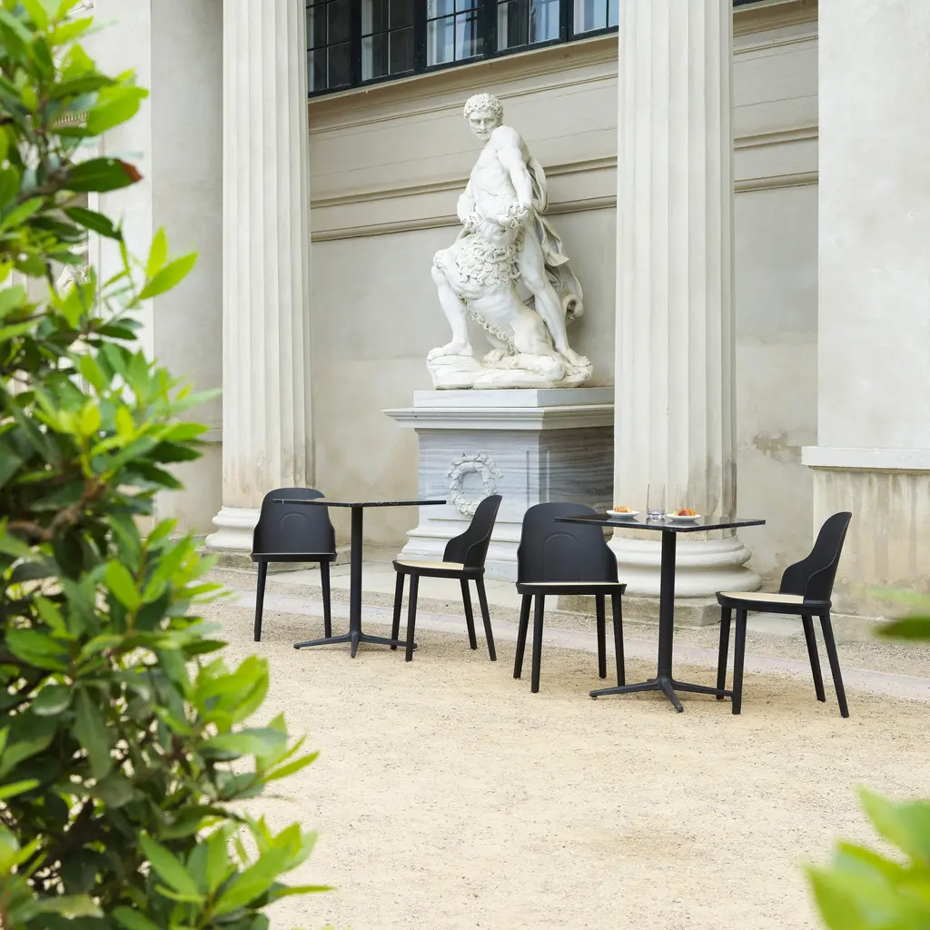 Also available in a square version, designer Simon Legald’s reimagined café table offers the same versatility as the round model, with options for use both indoors or outside. Allez with either the marble or lightweight, ultra-thin stainless steel tabletop works in both environs while the blackened or natural oak veneer is also offered for interiors. Characterized by its modernist silhouette and cylindrical cast-iron pedestal with a 3-or 4-legged base, the square table comes in 2 sizes.