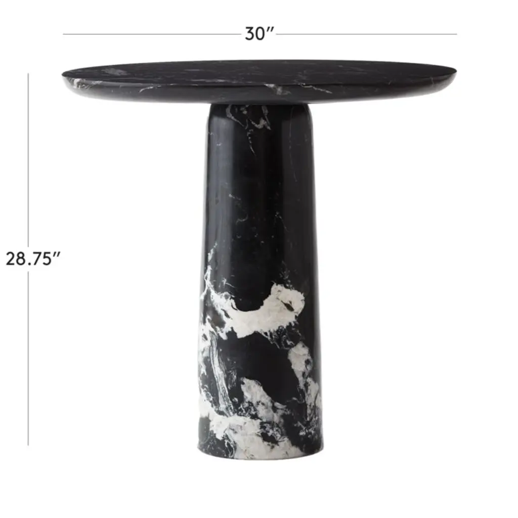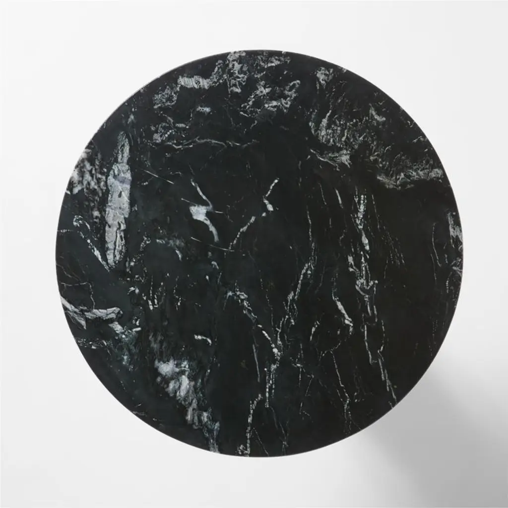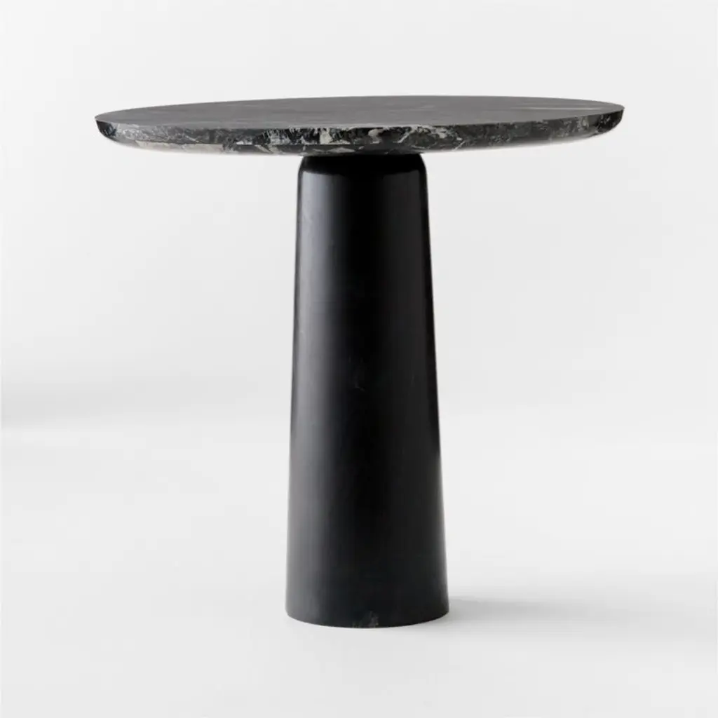 Honed black marble bistro table by Barcelona-based Mermelada Estudio is a sculptural work of art. The gracefully tapered pedestal and smooth, rounded top looks clean, drawing attention to the marble's bold white veining. Organic variations in the marble make each table unique. CB2 exclusive.