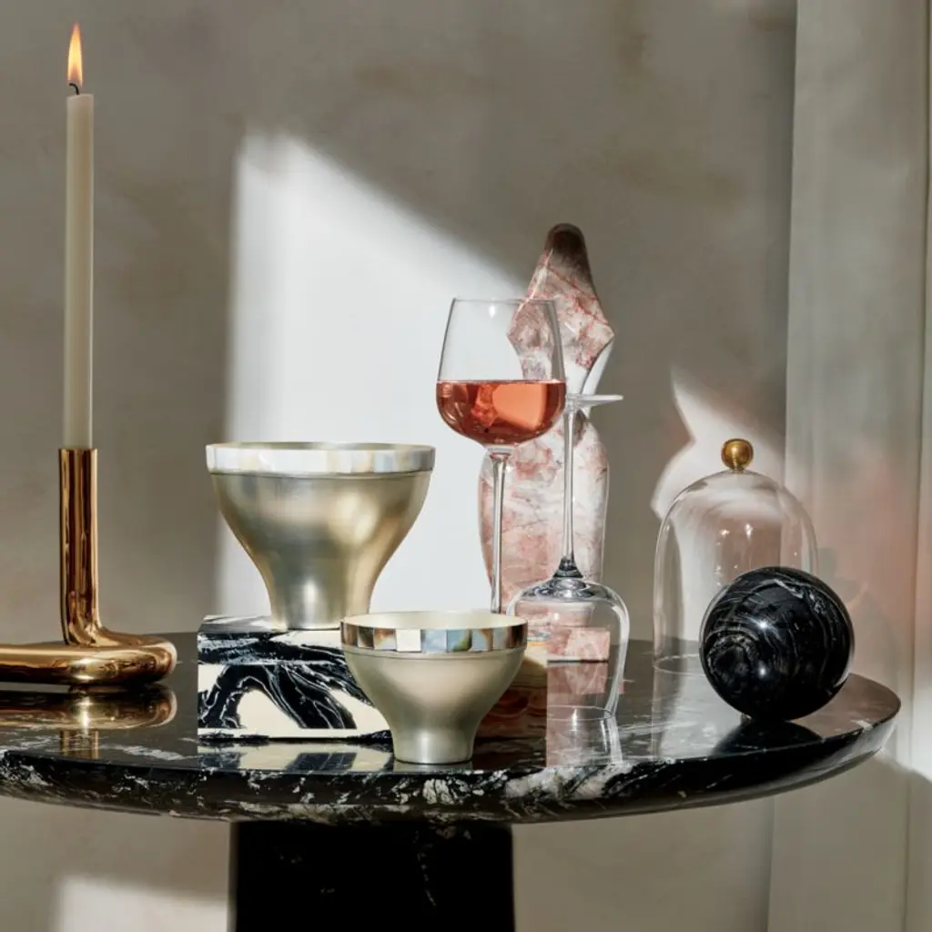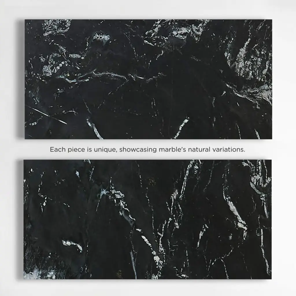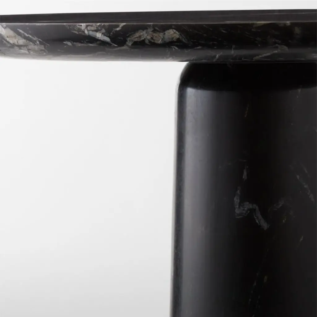 Honed black marble bistro table by Barcelona-based Mermelada Estudio is a sculptural work of art. The gracefully tapered pedestal and smooth, rounded top looks clean, drawing attention to the marble's bold white veining. Organic variations in the marble make each table unique. CB2 exclusive.