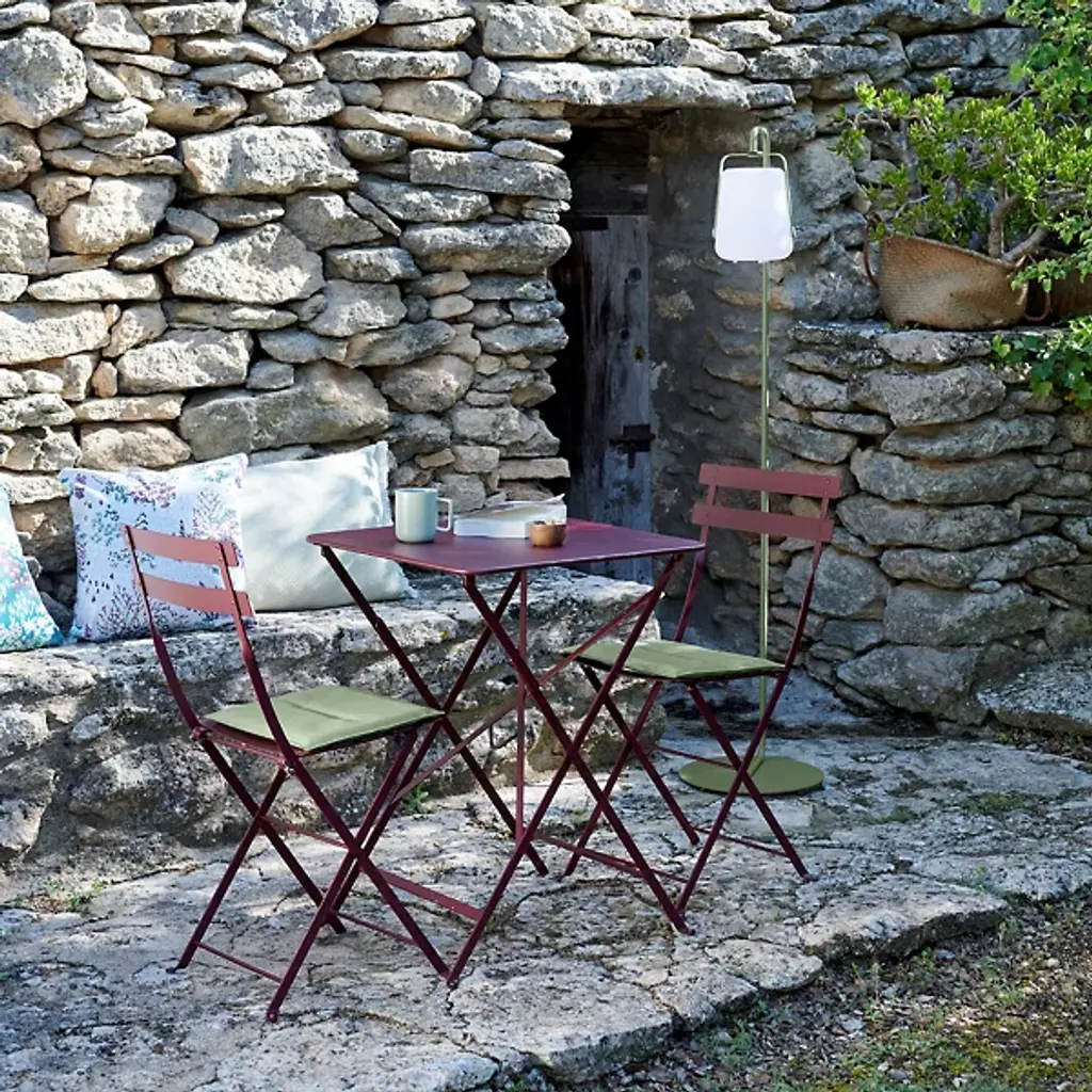An outdoor café table with beauty and brawn. The Bistro+ Square Table by Fermob is made entirely of steel, with a reinforced, rimless steel sheet top designed for superior strength and to endure even the toughest commercial use. And there’s more: A polyester powder coat finish enhances the table’s refined detailing and helps to protect it against harsh UV rays, while one-piece foot pads prevent scratches. Fold the top down when not in use for safe, compact storage.