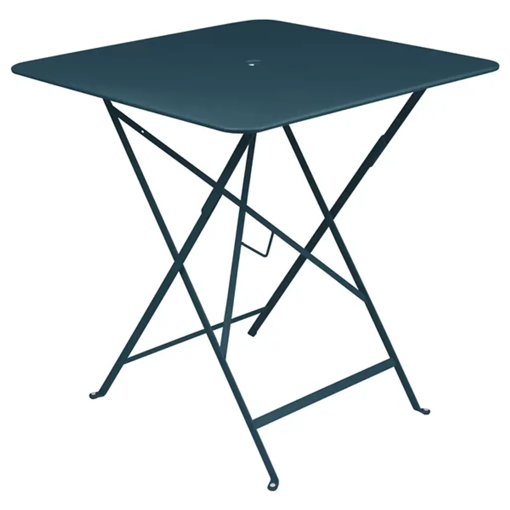 An outdoor café table with beauty and brawn. The Bistro+ Square Table by Fermob is made entirely of steel, with a reinforced, rimless steel sheet top designed for superior strength and to endure even the toughest commercial use. And there’s more: A polyester powder coat finish enhances the table’s refined detailing and helps to protect it against harsh UV rays, while one-piece foot pads prevent scratches. Fold the top down when not in use for safe, compact storage.