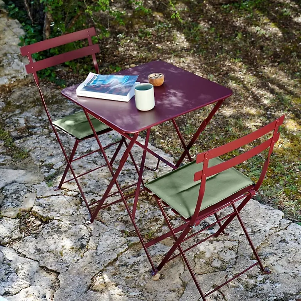 An outdoor café table with beauty and brawn. The Bistro+ Square Table by Fermob is made entirely of steel, with a reinforced, rimless steel sheet top designed for superior strength and to endure even the toughest commercial use. And there’s more: A polyester powder coat finish enhances the table’s refined detailing and helps to protect it against harsh UV rays, while one-piece foot pads prevent scratches. Fold the top down when not in use for safe, compact storage.