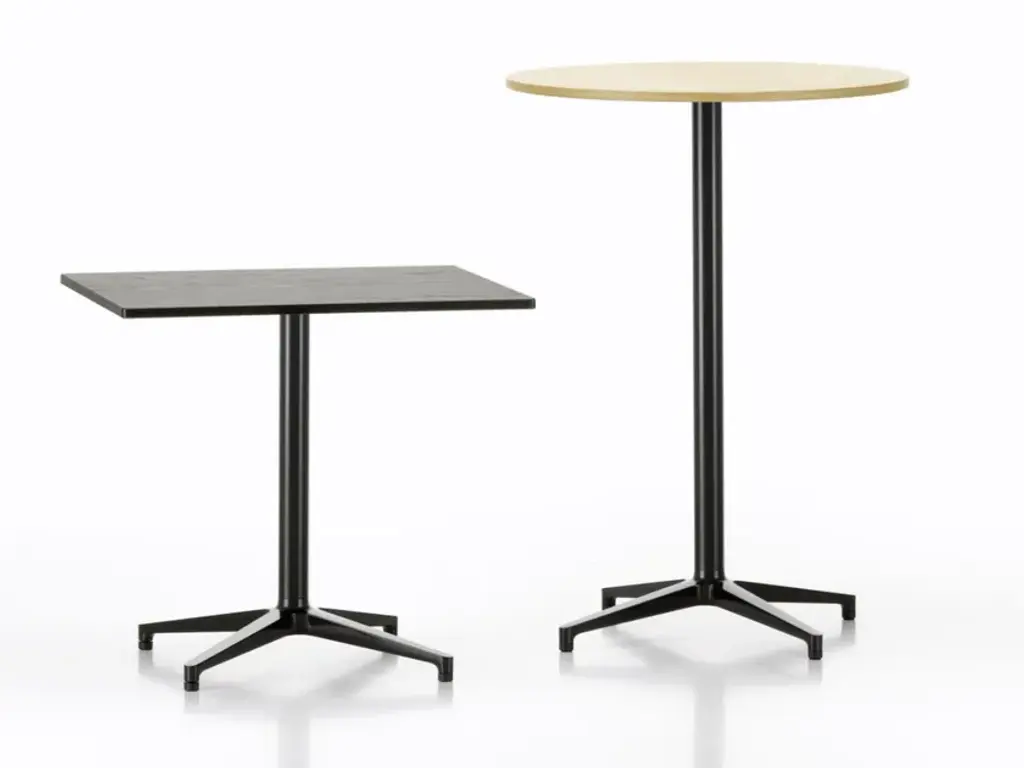 Bistro Stand-Up Table is a round high table with steel base and wooden top.The Bistro Tables were conceived in connection with the Softshell Chair and reiterate the shape of its elegant cruciform base. Due to its simple form, the table can be combined with a wide variety of chairs; the version with a solid-core laminate top is also suited for outdoor use. The Bistro Tables are available in both sitting and standing heights.Material description- Table tops available in three materials: melamine faced, white surface, smooth straight plastic edge (19 mm); light or dark oak veneer (Europe) (19 mm); solid core laminate in the colours white, pastel grey or black with black edge (12 mm). The solid core table top in black has an additional anti-fingerprint coating.- Base: powder-coated in basic dark (RAL 9004). The height of the base including screw-in glides is 1080 mm; the glides can be adjusted (max. extension 10 mm) for levelling on uneven floors.- Applications: table with top in solid core laminate is also suited for outdoor use. Pre-galvanised base.