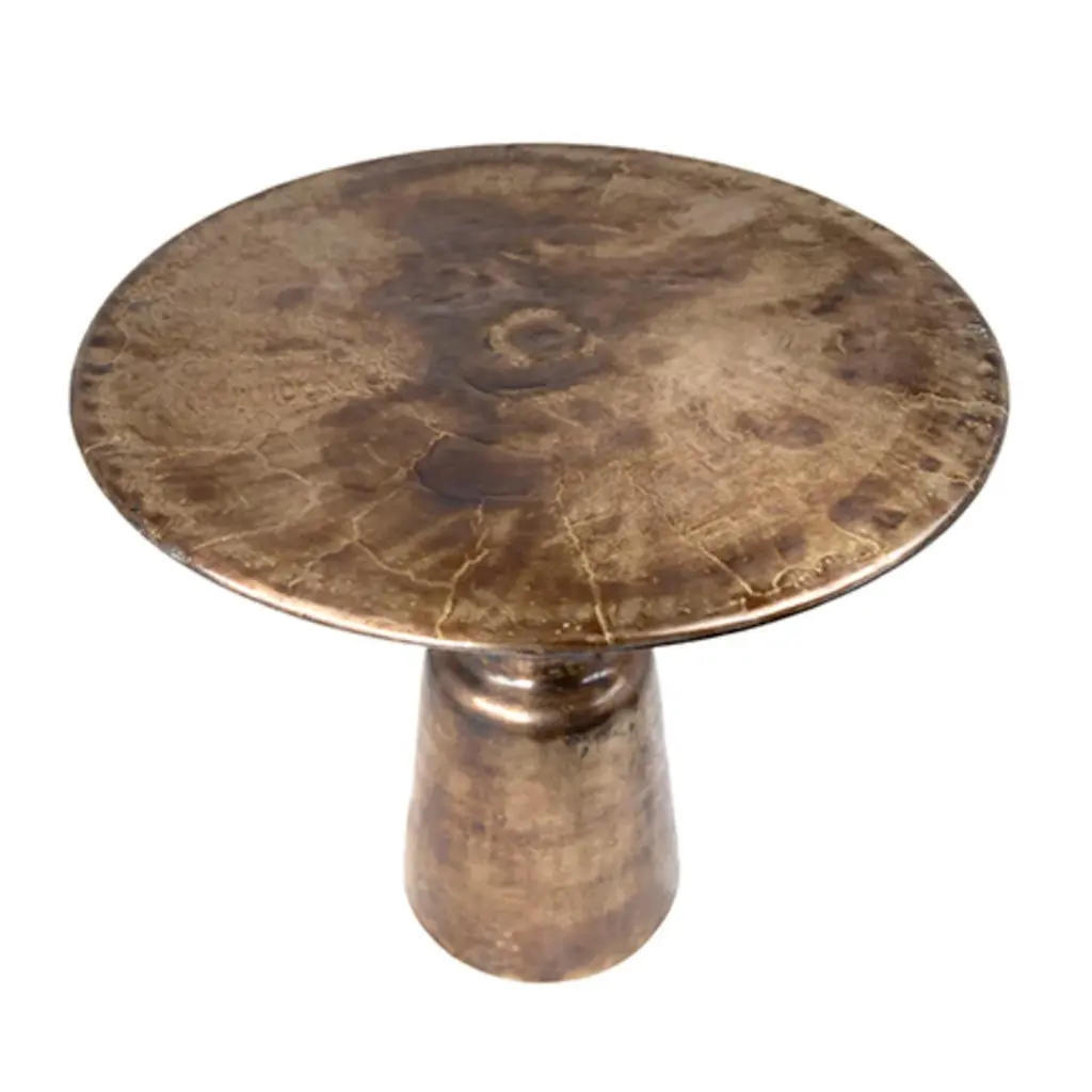 Antiqued brass finish cast aluminum round bistro table with pedestal base. Each table is unique in brass tones/patina, markings, and textures. Antiqued raw finish gives this table its beautiful unique character. This table weighs approx. 40 lbs.