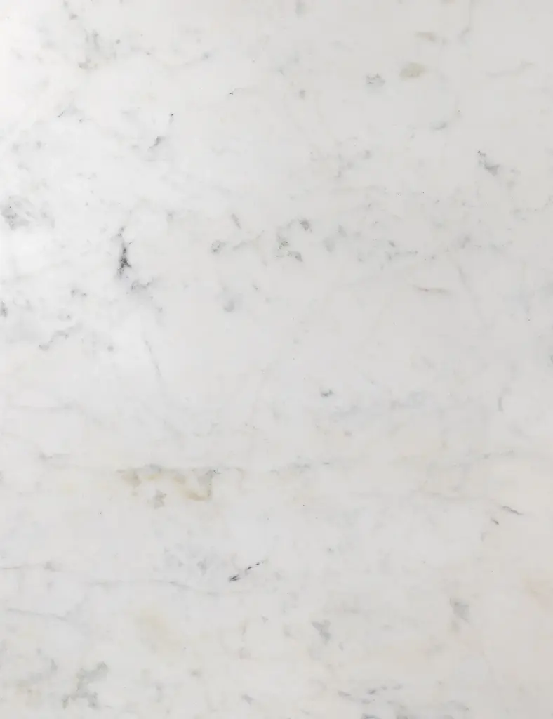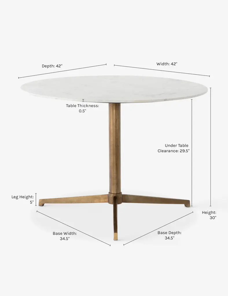 Add a touch of drama and Art Deco-inspired style with this marble-topped dining room table. A slim aluminum tripod base, in an antiqued raw brass finish, supports a roomy, rounded tabletop of polished white marble. This bistro table is perfect for breakfast nooks or smaller-scale dining rooms.