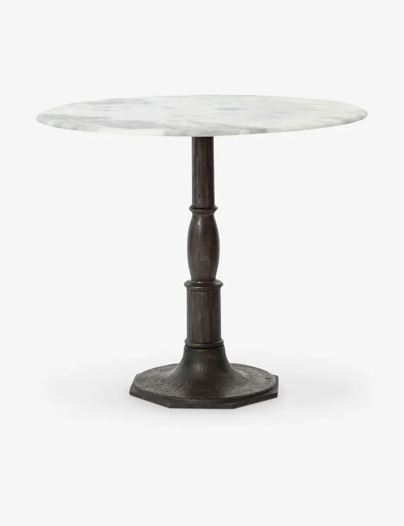 Bring a little drama to your dining room with this round, marble-topped table. The wooden baluster base brings an industrial element to the classic French bistro design.
