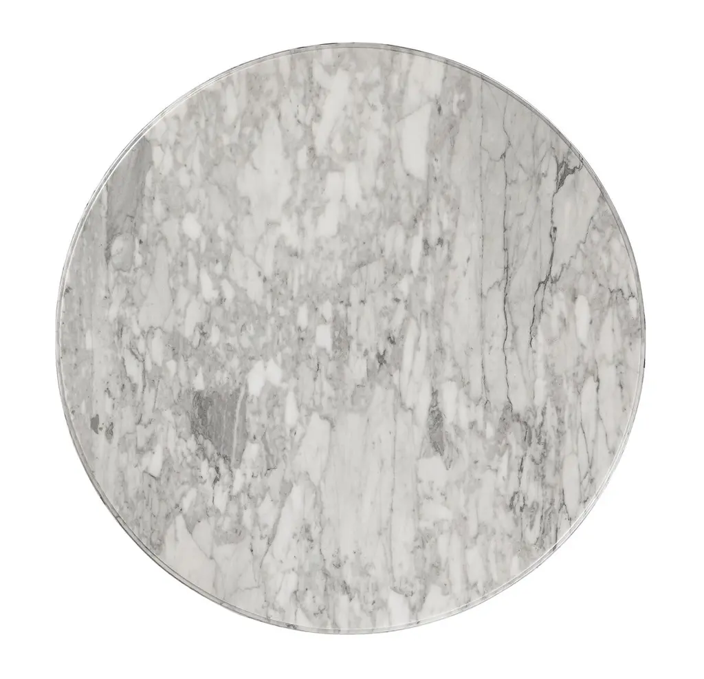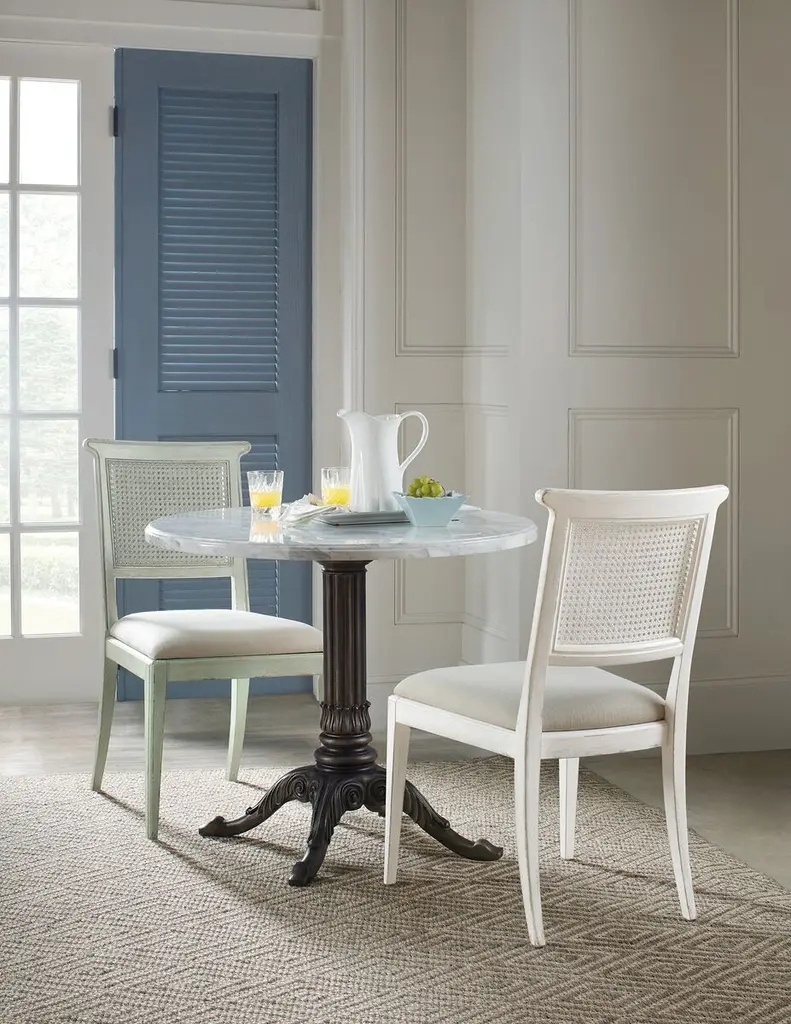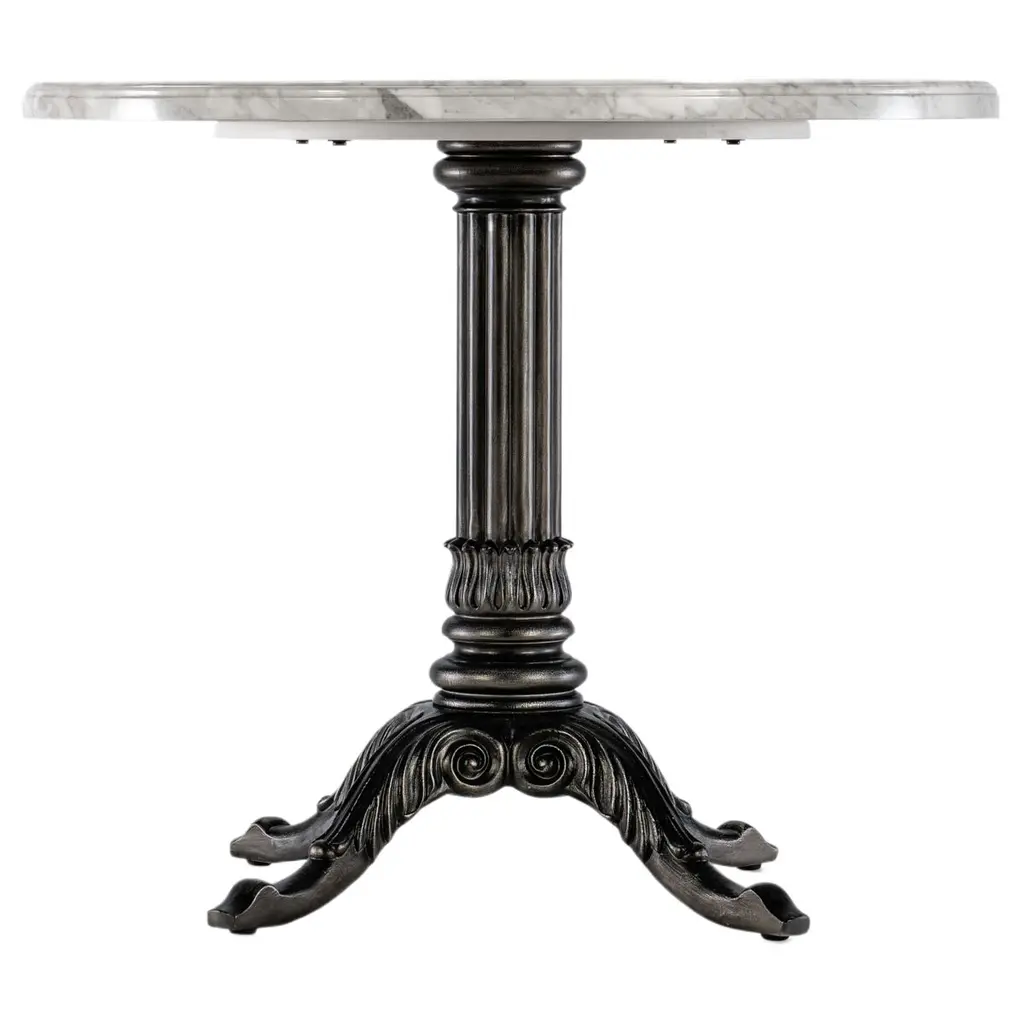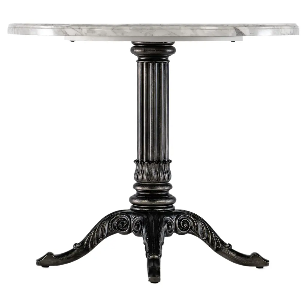Inspired by timeless Paris bistro tables, the Charleston table is a classic design with a Veneered Carrara Stone top and a carved pedestal base that takes its inspiration from the decorative iron gates that adorn the stately properties in Charleston. Will accommodate up to 4 with coordinating chairs.