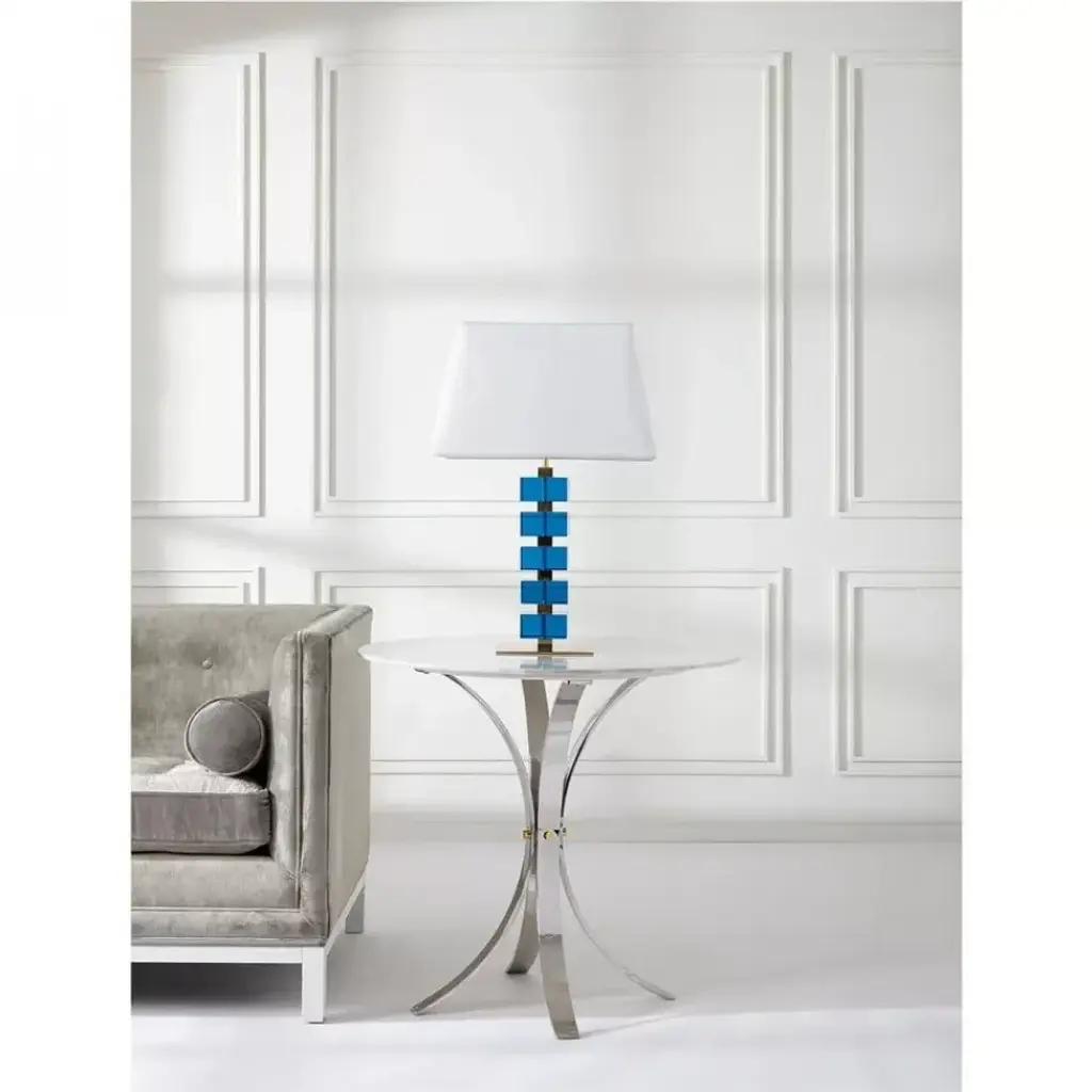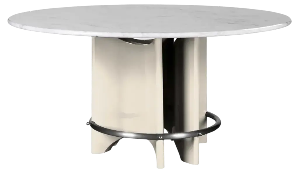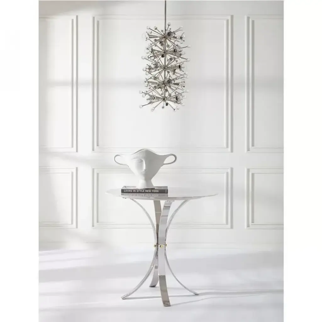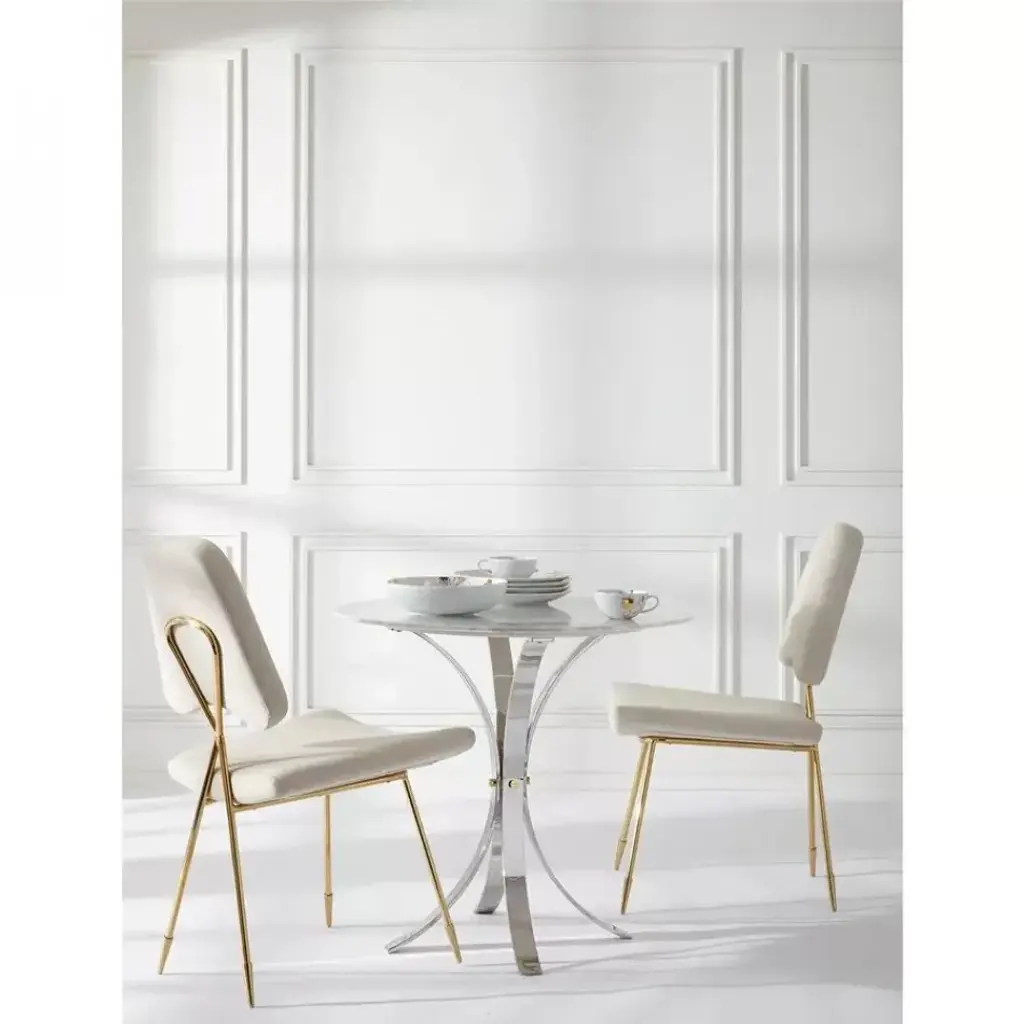 Our multi-functional Electrum Café Table is the perfect dining table for a petite apartment, or entry table for a larger lair. Also fab as a generous end table for a high arm sofa, like our signature Lampert. Splayed polished nickel legs support a 32" white marble top. Chunky brass bolts crank up the glam. Electrum is a naturally occurring alloy of gold and silver, and the embodiment of our belief that you should mix your metals with abandon.