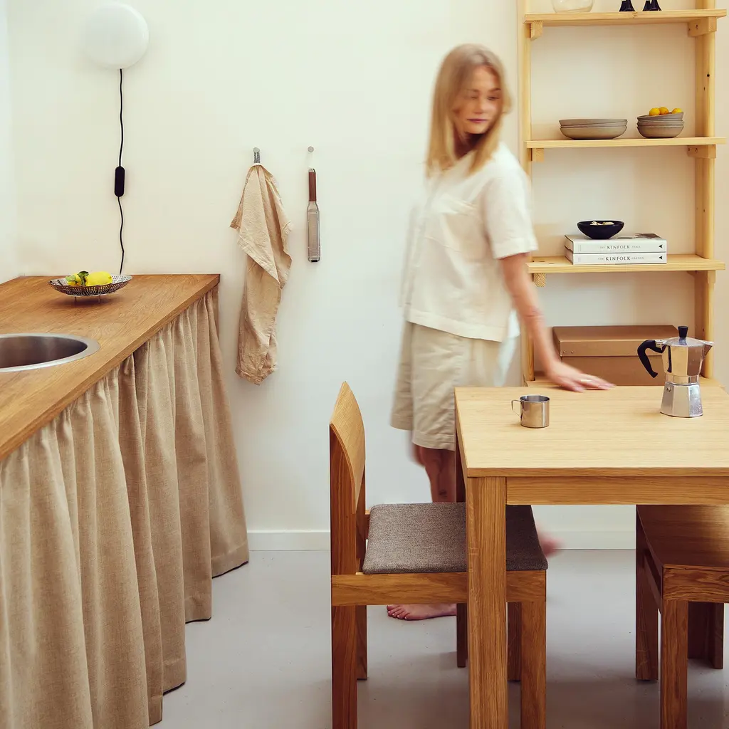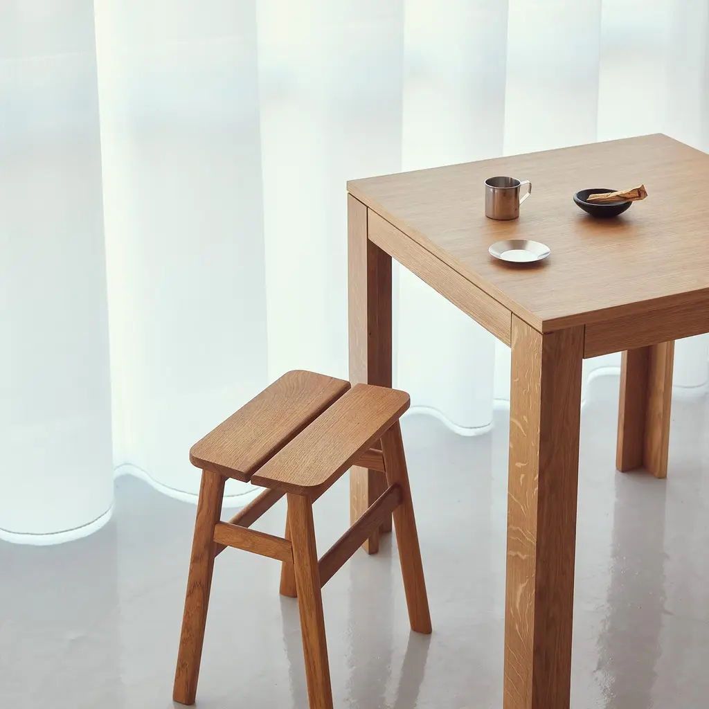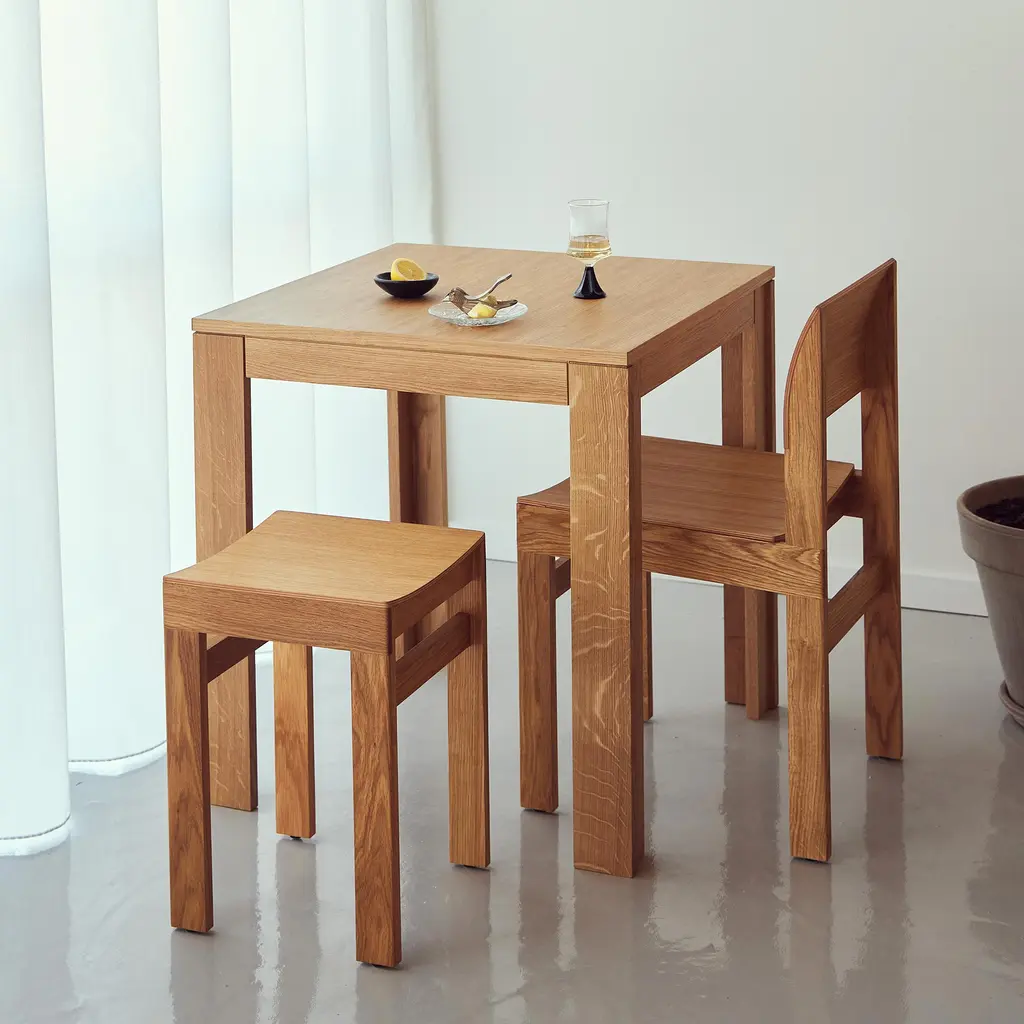Sits quiet in a room, but the slim shadow line gives it away—this table is lighter than it looks. Designed by Herman Studio for Form & Refine, the Element Table uses FSC®-certified European oak with a veneered top, finished in matte lacquer. The slightly recessed legs create a subtle floating effect—an architectural gesture in 28.9″ of height and a compact 27.5″ square footprint. Run a hand across the surface and you’ll notice the fine join between top and frame. That thin shadow gap is deliberate: a visual calmness that still promises durability. At 35.4 lb, it’s sturdy enough for daily use in both home and contract settings. Set alone, it reads as a modest side or café table. Placed in multiples, it locks into rows—becoming a modular grid that shifts from private to communal with ease.