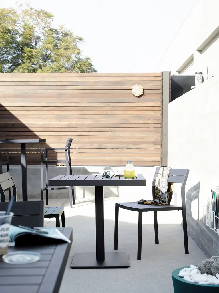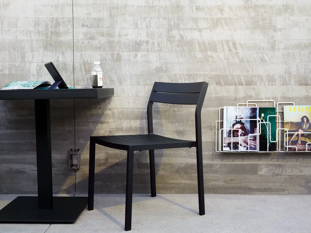 Seeing a need for durable outdoor furniture at accessible prices, Matthew Hilton created the Eos Collection (2011), which is sleek enough to work in indoor spaces as well. Named for the Greek goddess of dawn, Eos is lightweight – literally and visually – smartly proportioned and very comfortable. The Eos Café Table is constructed of powder-coated aluminum, a rust-resistant material that stands up to the elements. Made in China.
