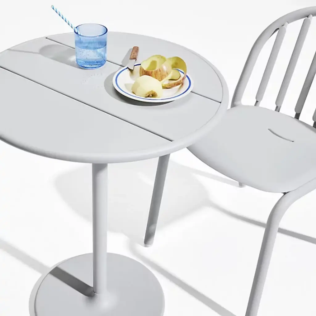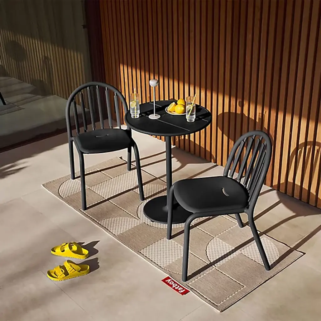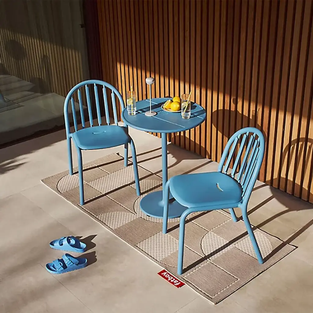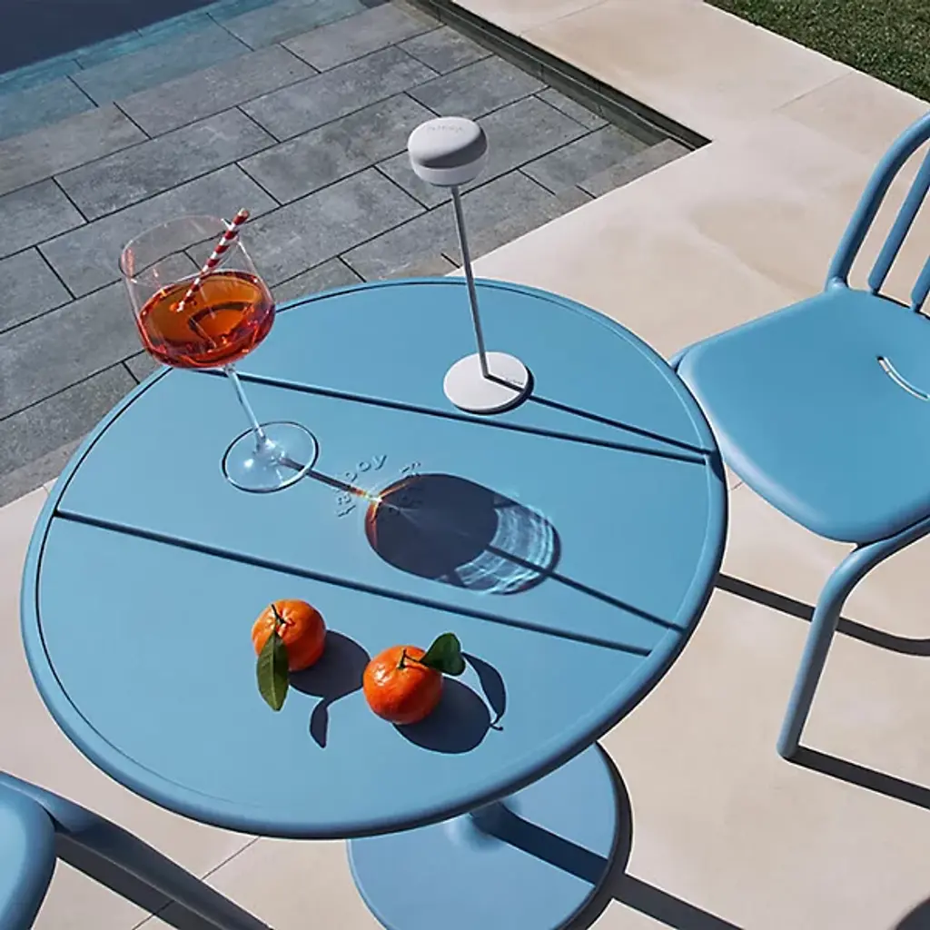 The Fred's Outdoor Bistro Table from Fatboy adds a compact closeness to exteriors. Ideal for adding a café-style presence when space is at a premium, its strong, weighted cast-iron base secures an aluminum stem and top, with further intrigue added by the parallel aluminum planks across the top that shed water. The weather-resistant finish ensures strength in dramatic weather shifts, while its circular base conceals a secret: smaller, adjustable feet placed beneath it that help the tabletop stand straight and level, even on uneven surfaces.
