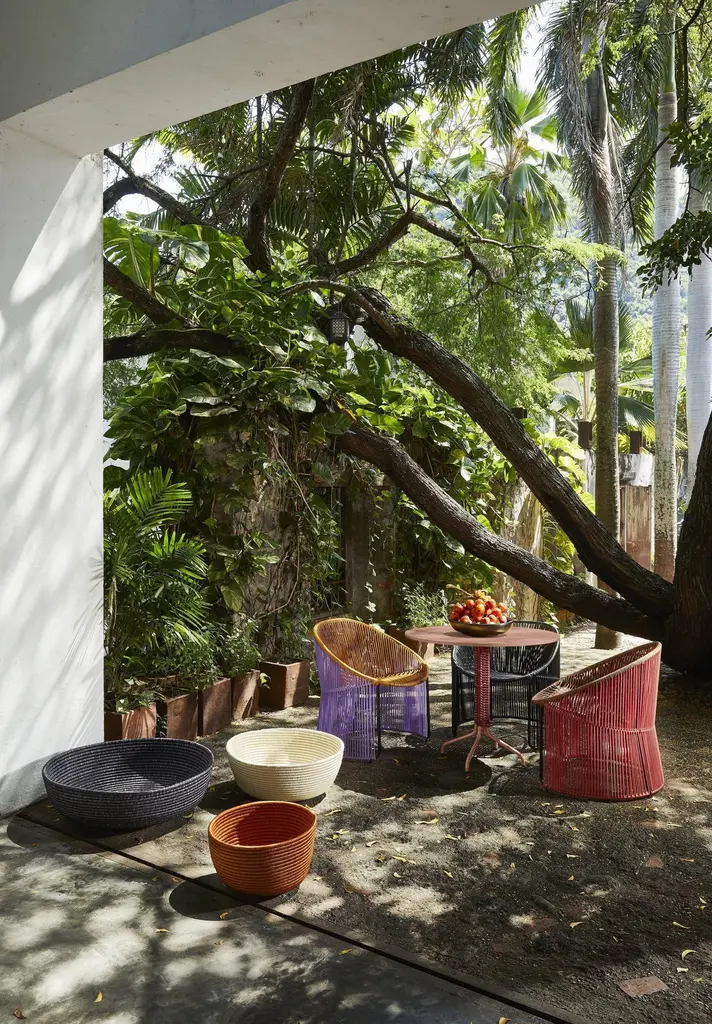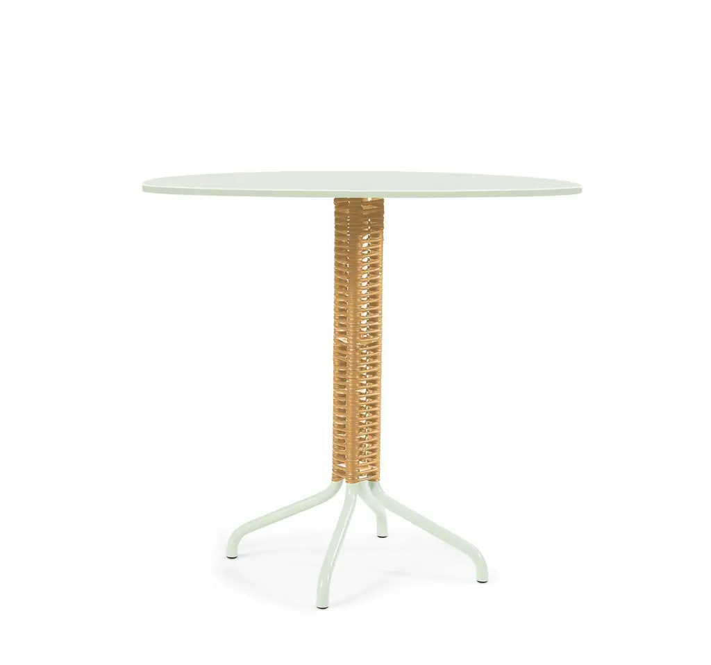 Honey bistro table by Sebastian HerknerDimensions: 60 x 73 x 60 cmMaterials: SteelThe popular cielo collection of chairs, loungers and lounge chairs, designed by Sebastian Herkner, is once again expanding: the elegant bistro table stands on four delicate legs made of powder-coated tubular steel that converge to form a column. On them rests a circular tabletop, optionally made of metal or marble. The wickerwork woven around the table leg connects the model visually with the seating furniture of the collection. The table can be used both indoors and outdoors and its compact form makes it ideal for sitting on the balcony or as a space-saving solution for restaurant interiors.