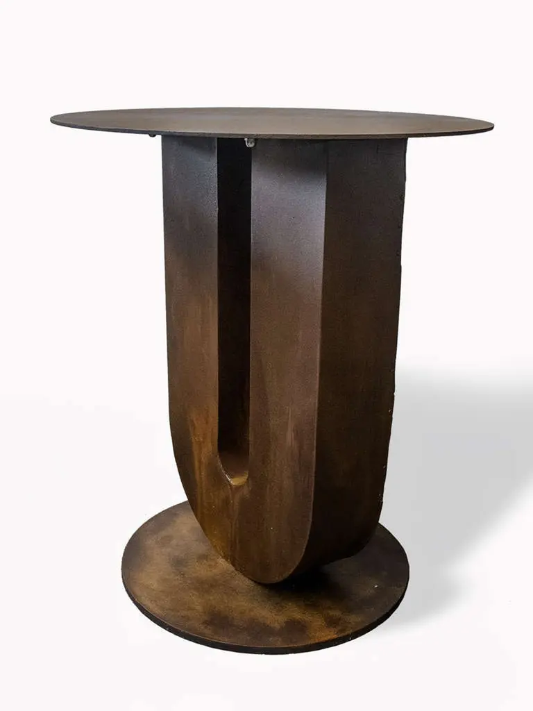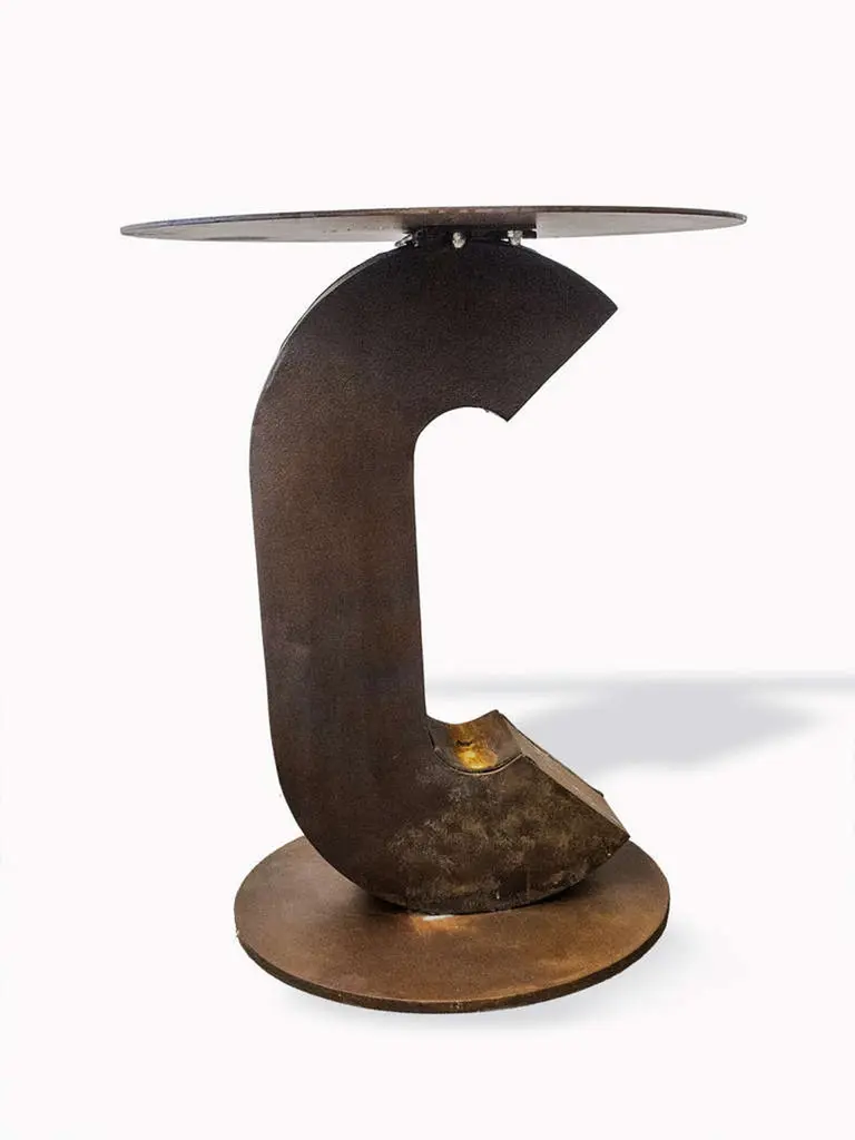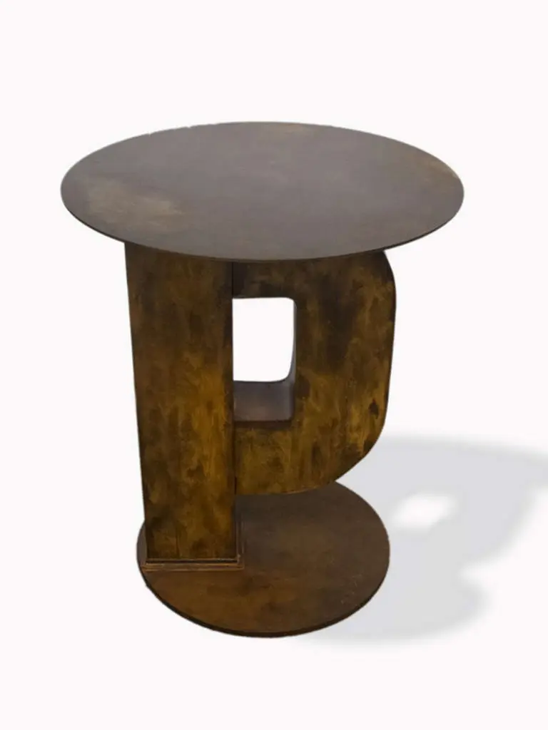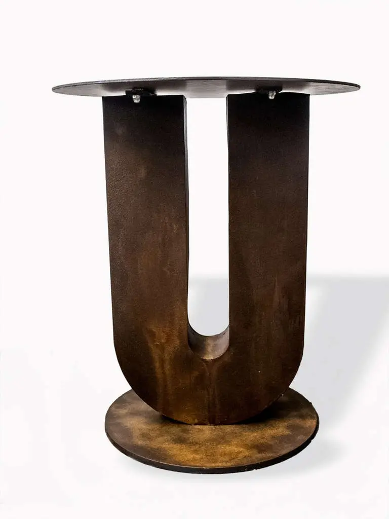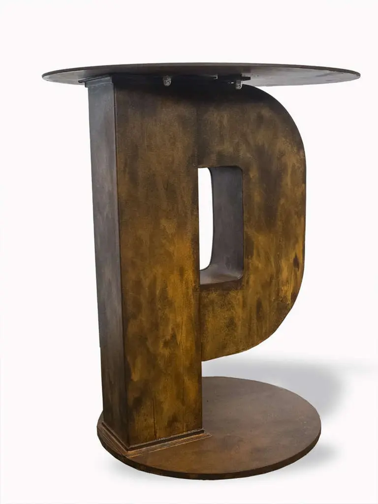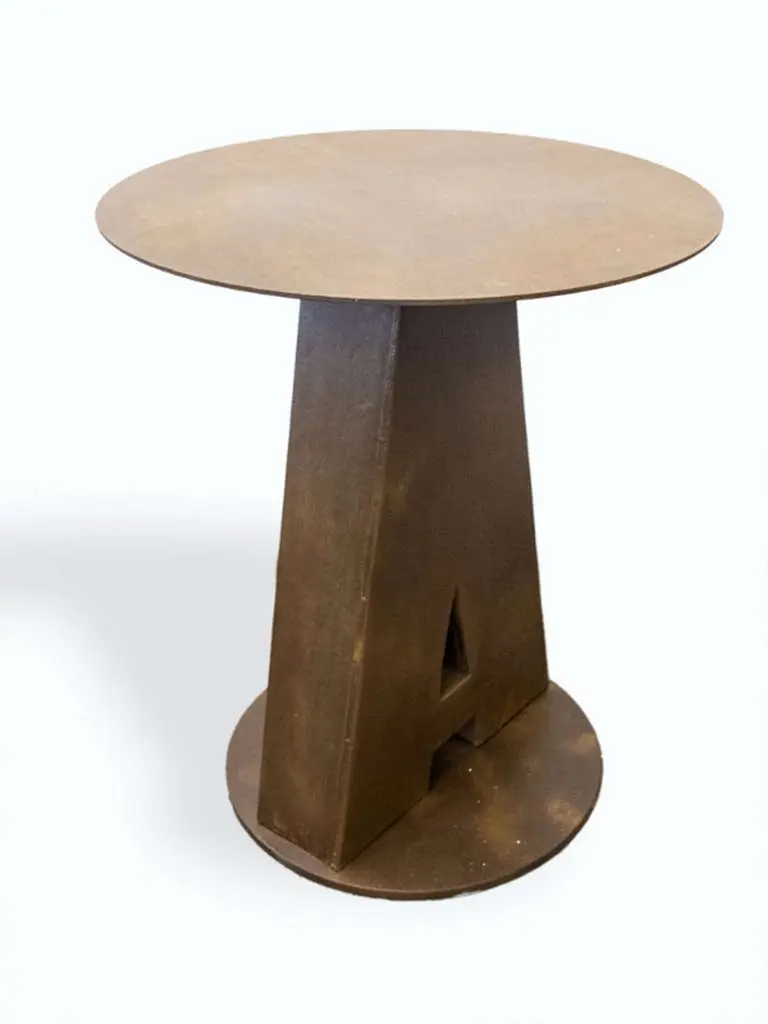A fine example of reinterpretation and realization of an old Industrial element. Four big zinc letters from an American Circus A C P U have been reused as legs of four French Bistrot outdoor round tables, filled up of concrete. The top is made out of iron. Rust finishing.