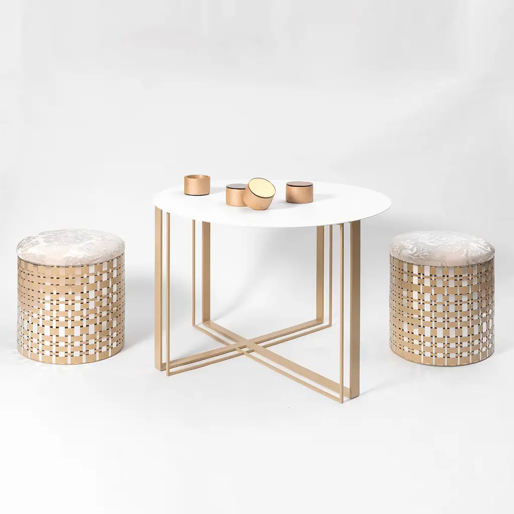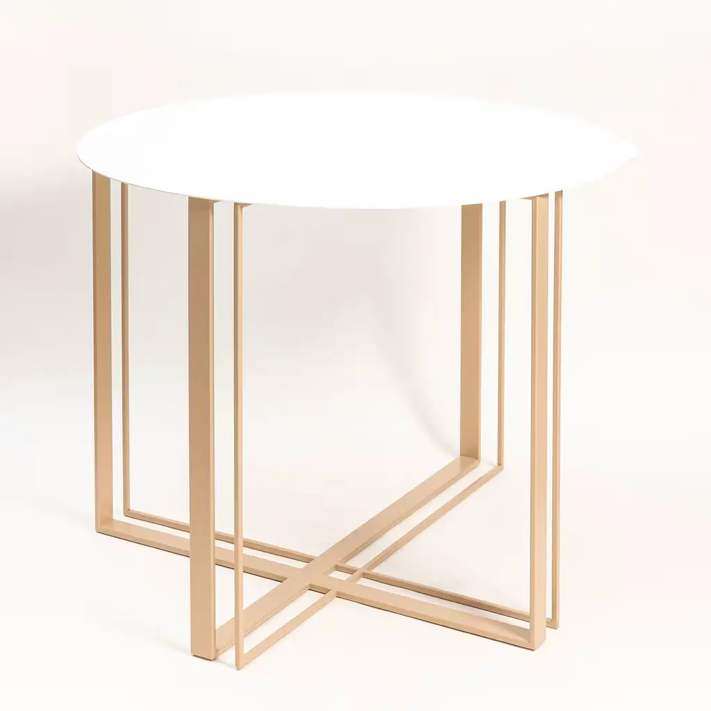 This table symbolizes the intersection of destinies. Its intricate champagne gold iron structure represents two individual paths merging into a shared journey. This design is not only aesthetic but metaphorical, telling the story of shared experiences, and a bond that strengthens over time. The white Stellar metal top with luminous dust evokes purity and the light of a new beginning. It celebrates the union of strength and delicacy. Suitable for both indoor and outdoor use.