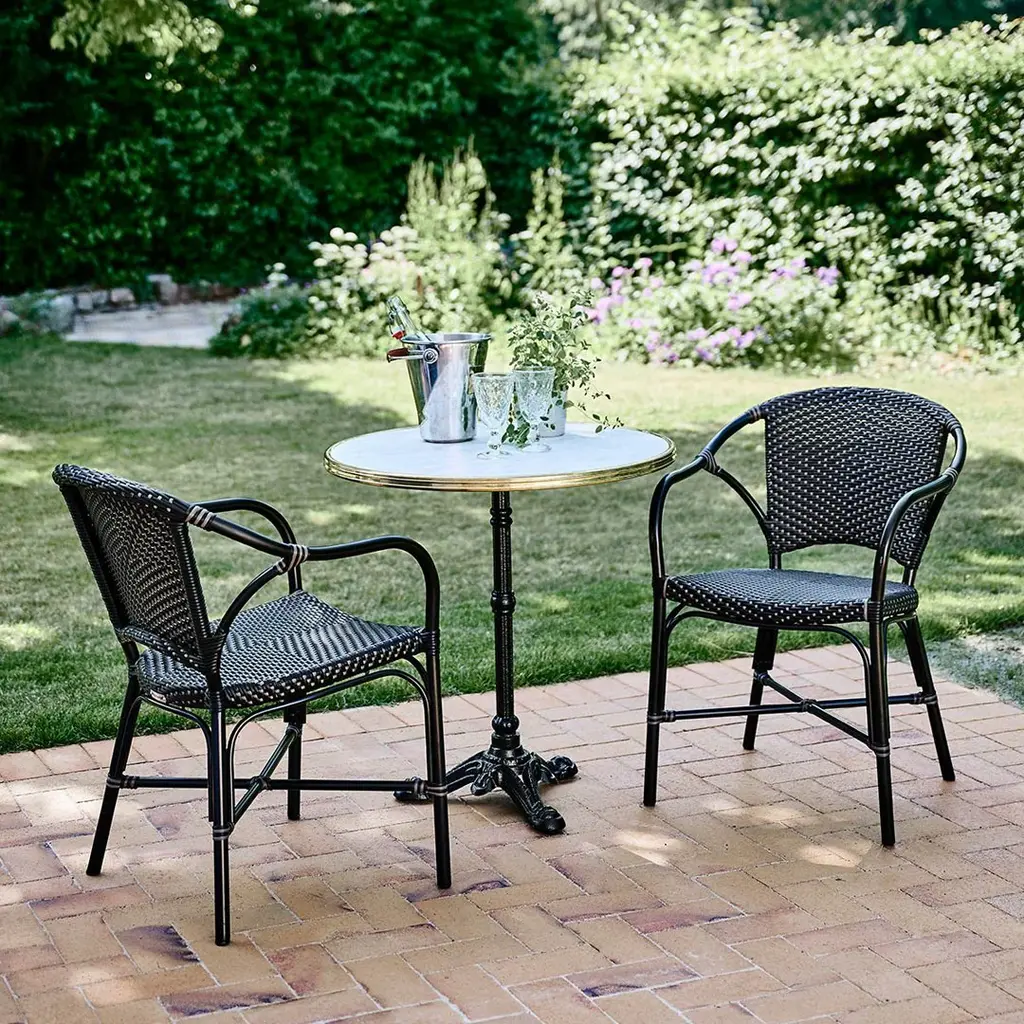 Lyon is a classic cafe table, inspired by the charming French cafe style. The bistro table fits both the small balcony and the cozy sun corner in the garden. The table is designed for restaurants, brasseries and cafes, but is also suitable for the private garden, terrace or balcony. The table legs are made of cast iron and are available with three different table tops. Versalite Marble table top is made of durable versalite and with a charming brass edge. The table top withstands all kinds of weather and does not require maintenance. The teak wood table tops are available in both round and square, and are made of Indonesian teak wood with the stamp Indonesian Legal Woods, which ensures a sustainable production. Teak is a strong and durable natural material that over time patinates and turns gray. If you want to preserve the beautiful chestnut color, use a good teak oil.